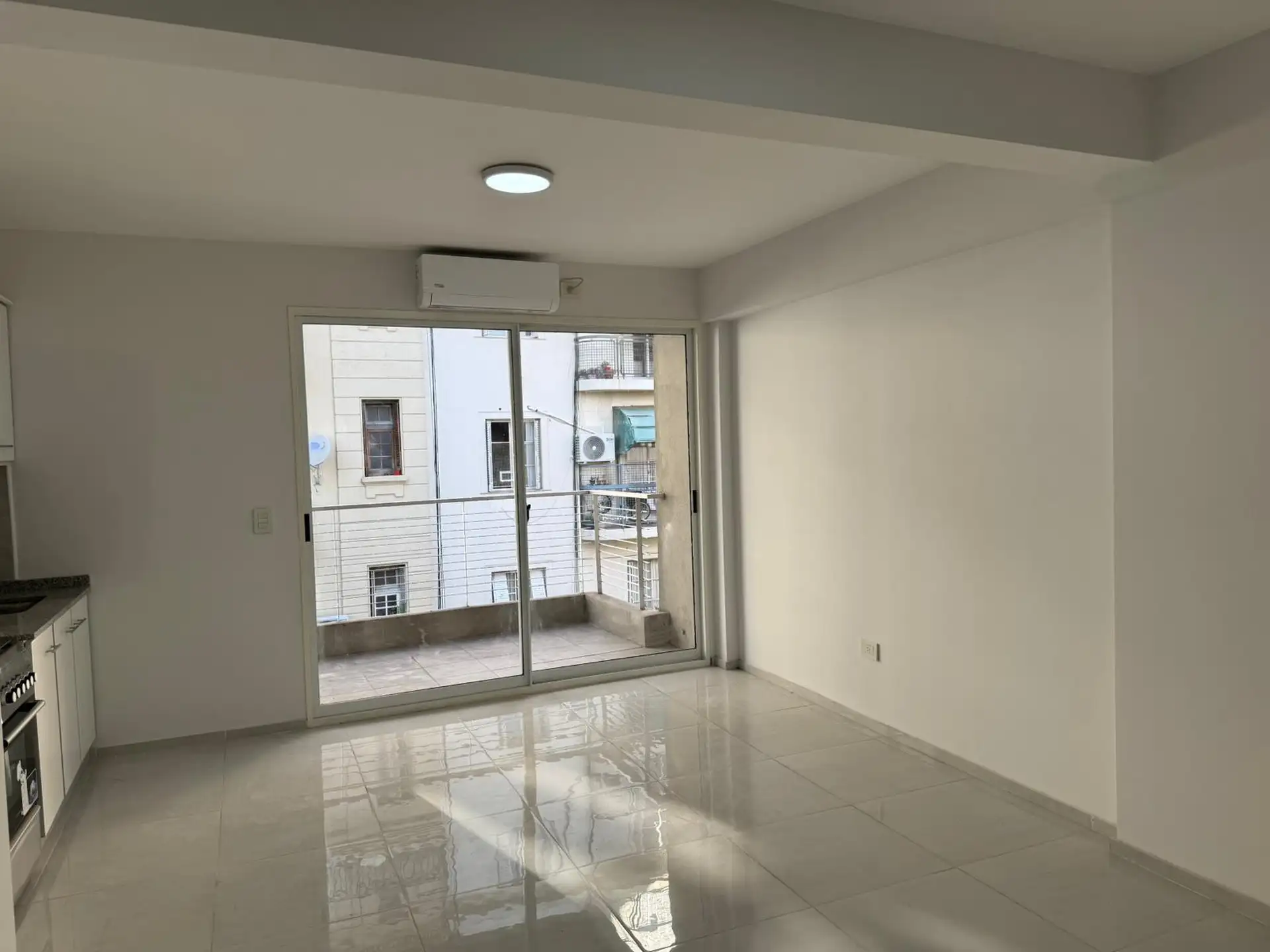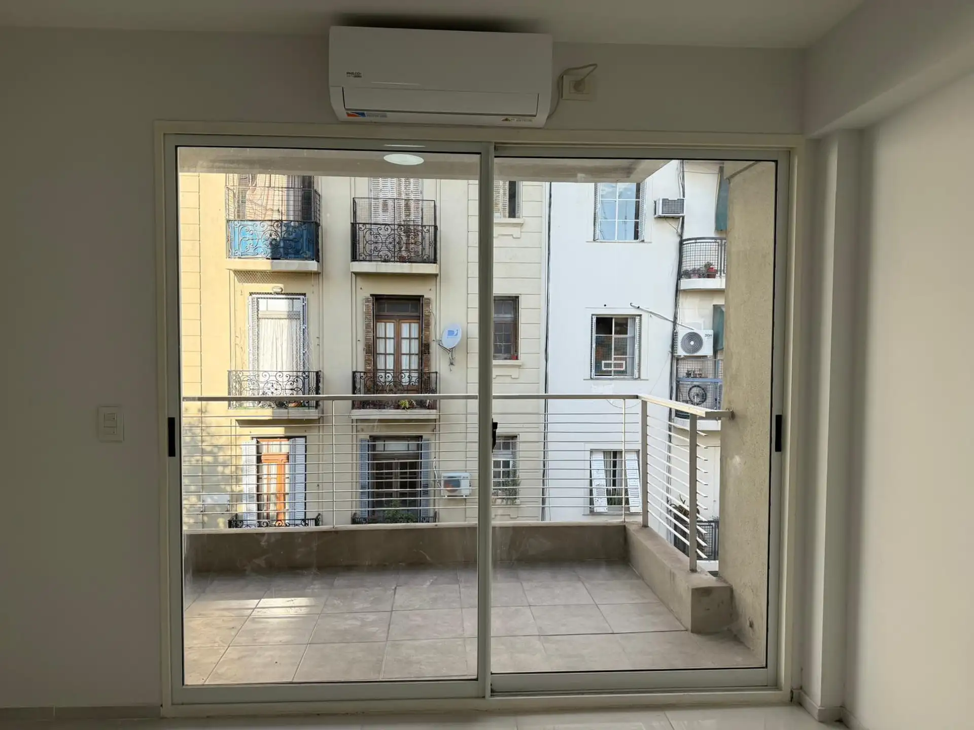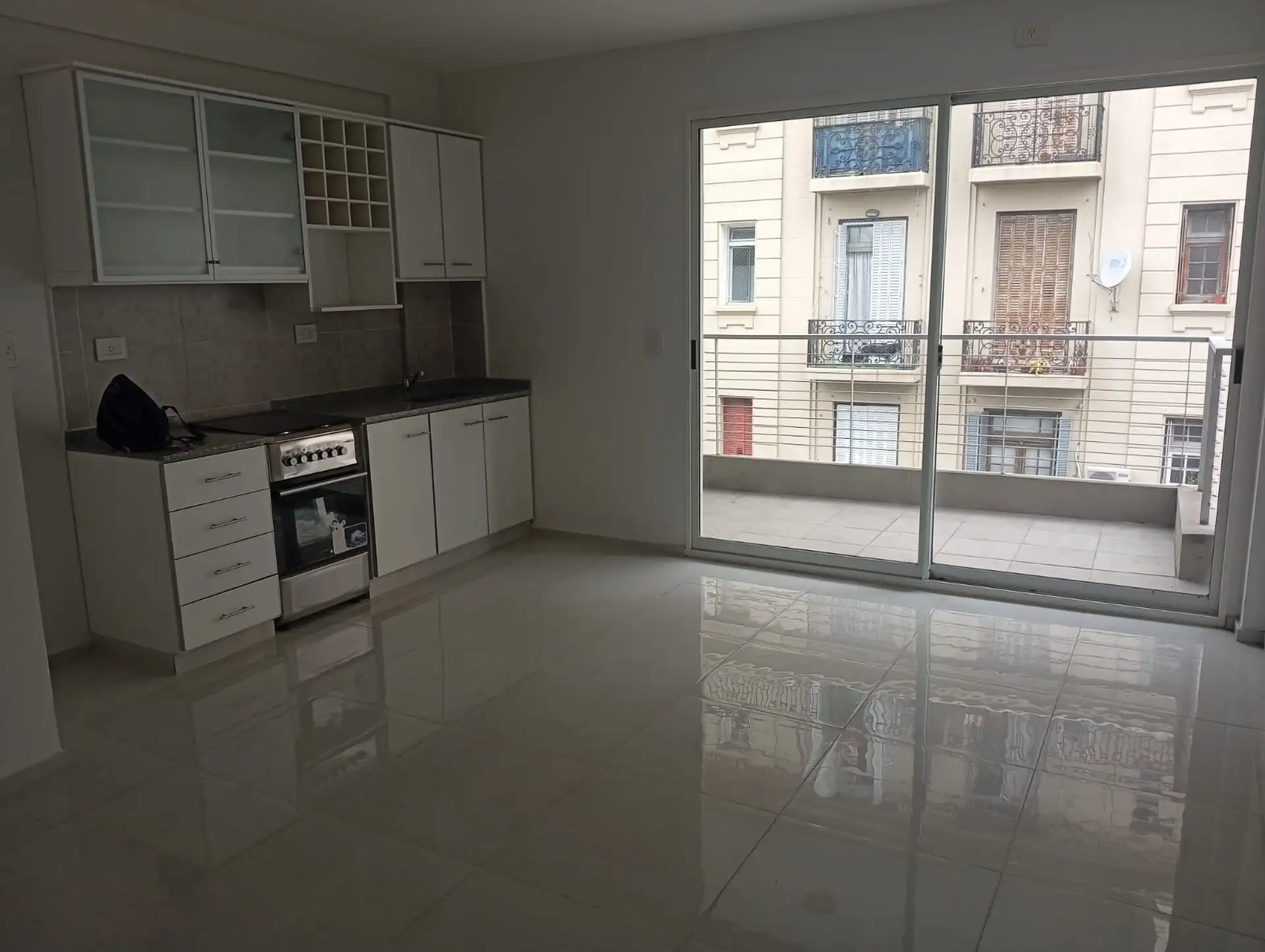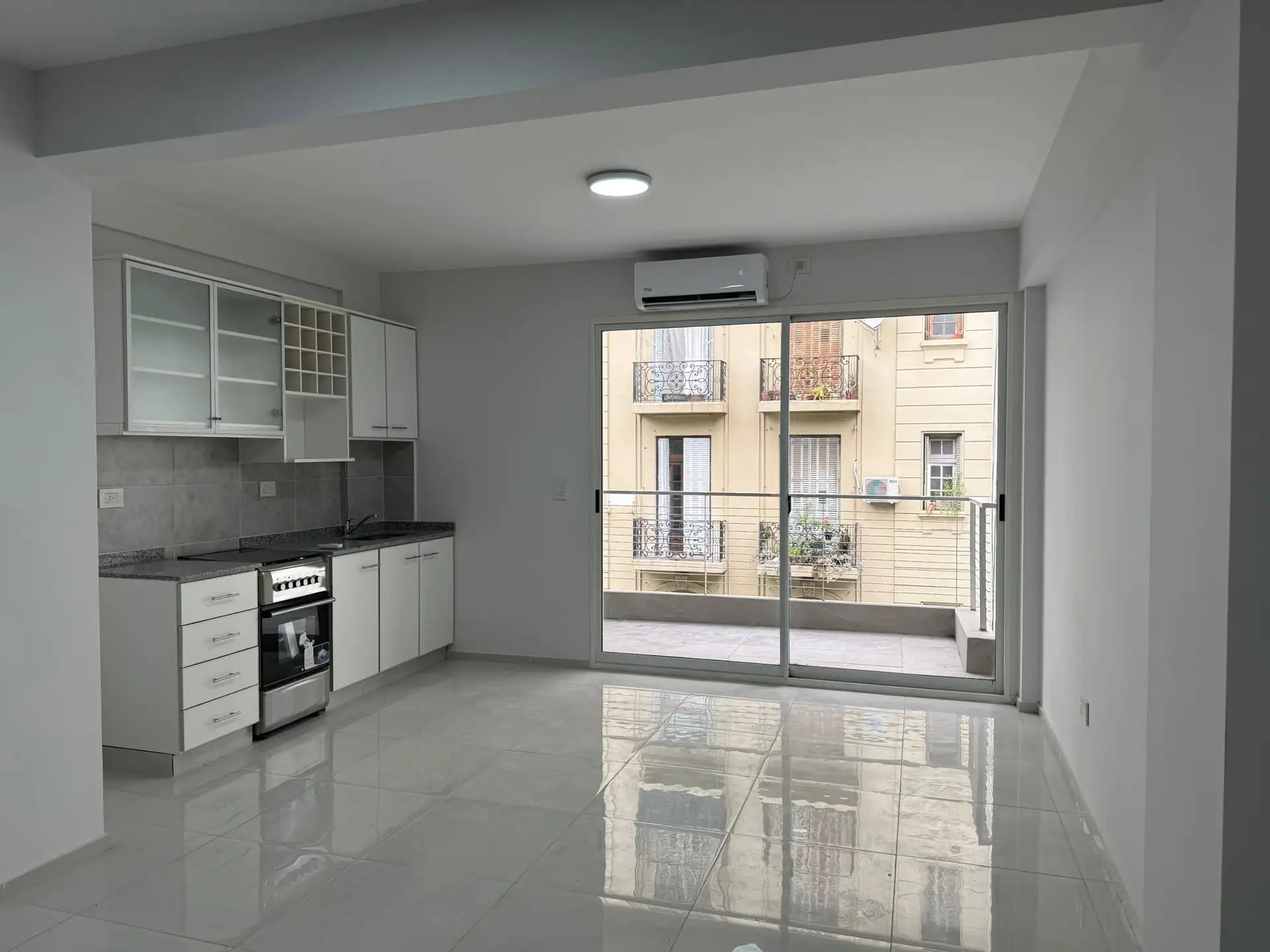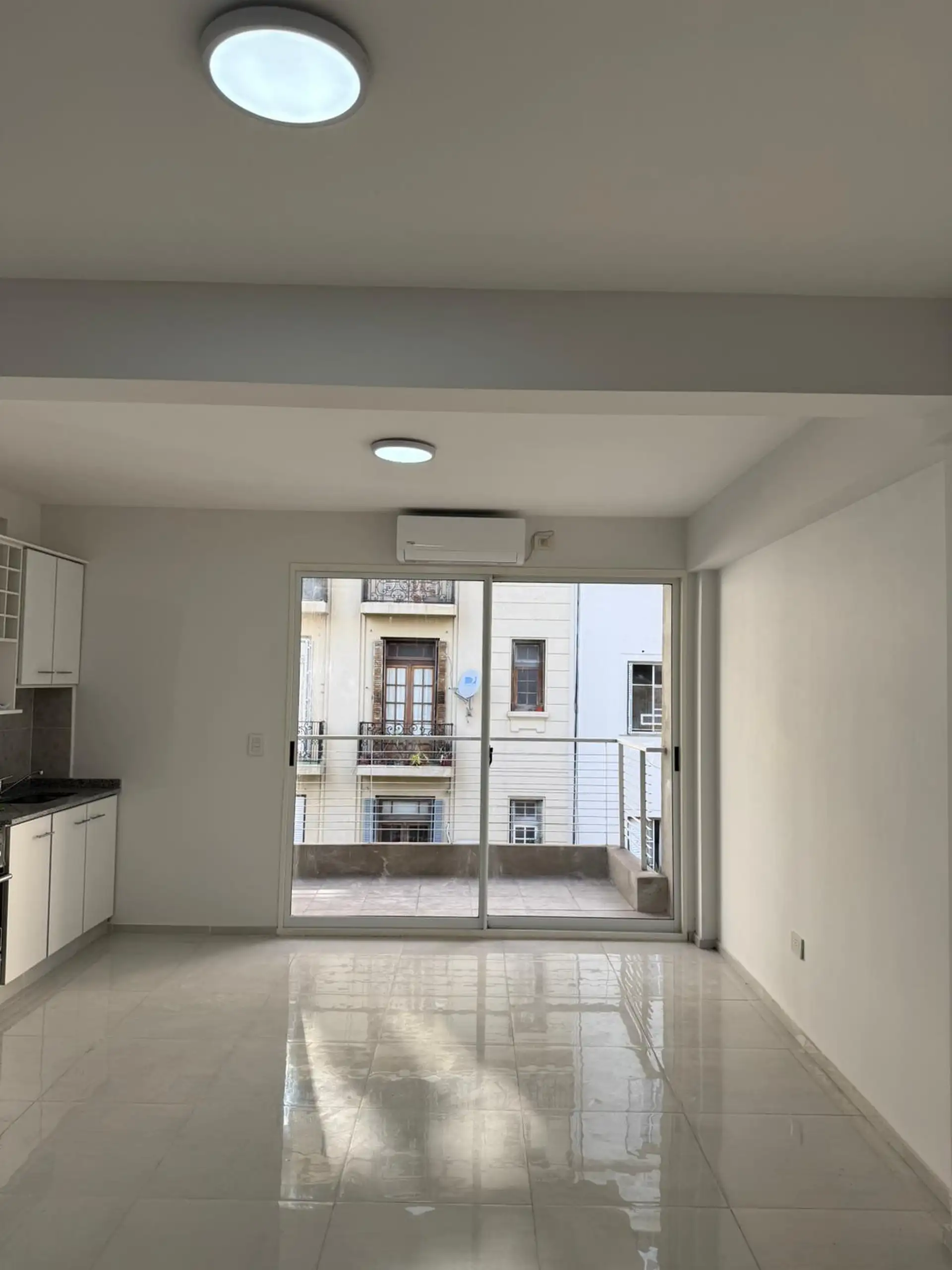 Studio apartment for rent in Recoleta, with 44 m² total area, street-facing and with a balcony. It includes a fitted walk-in dressing area, a connection for a washing machine and air conditioning (3000F). The kitchen has a 4-burner cooktop (anafe). The building has an elevator and access for people with reduced mobility, with 4 units per floor and 9 floors in total. Building fees and utilities are not specified.