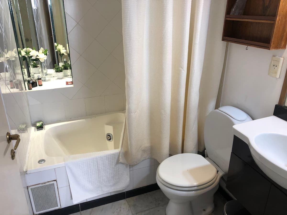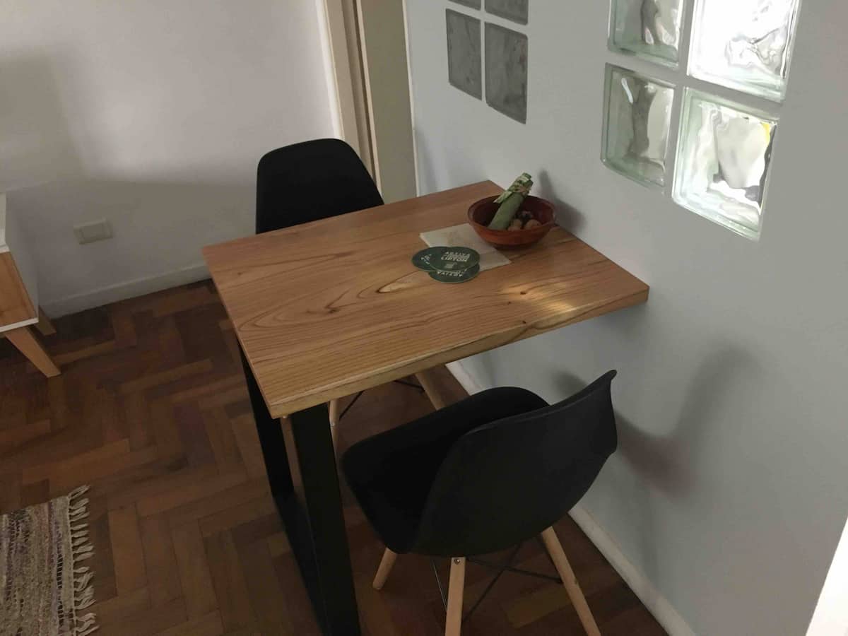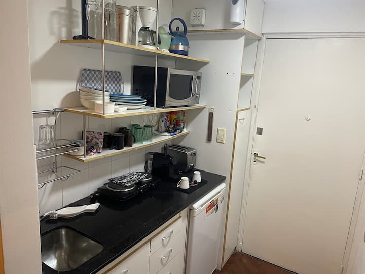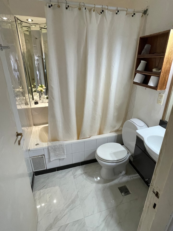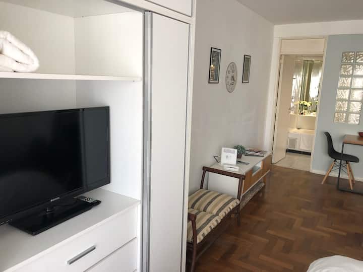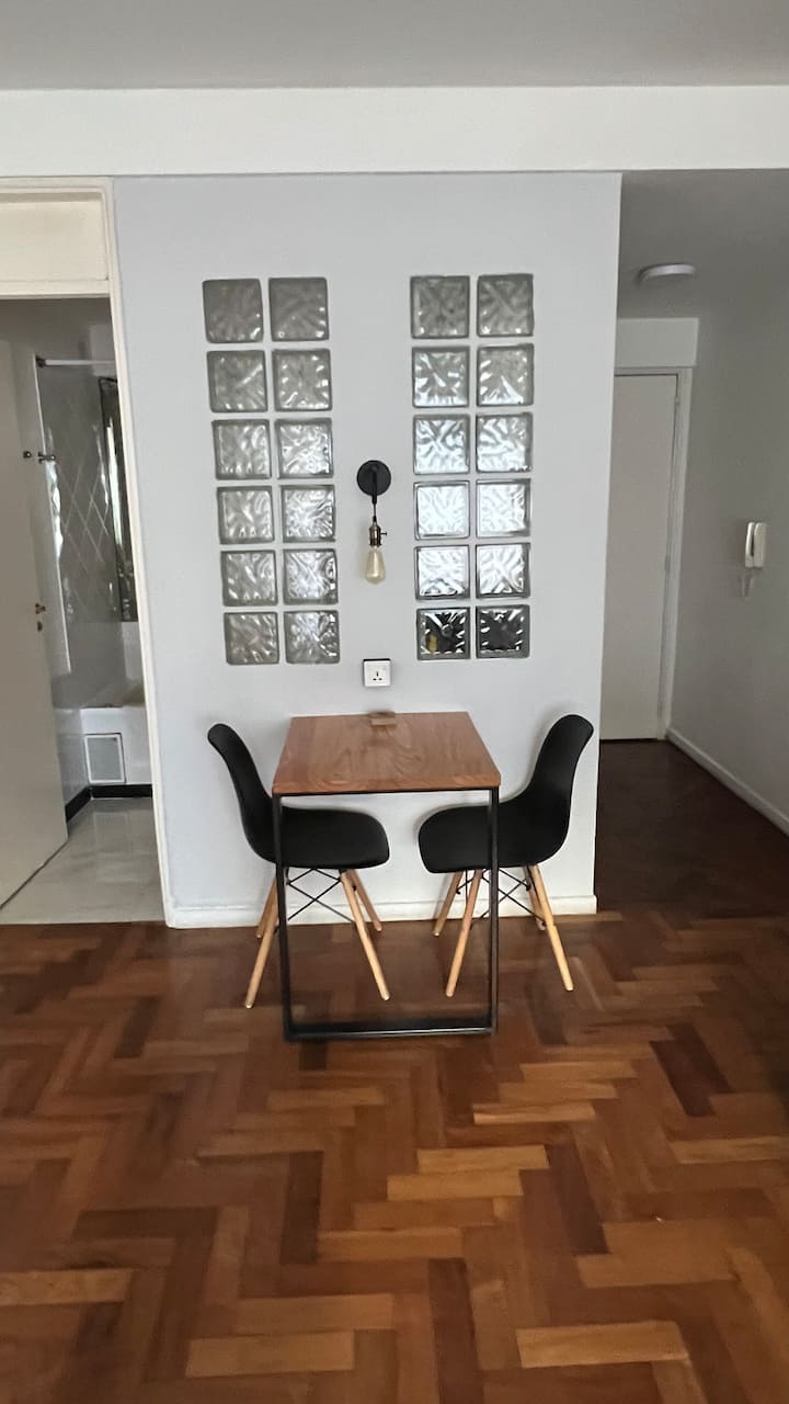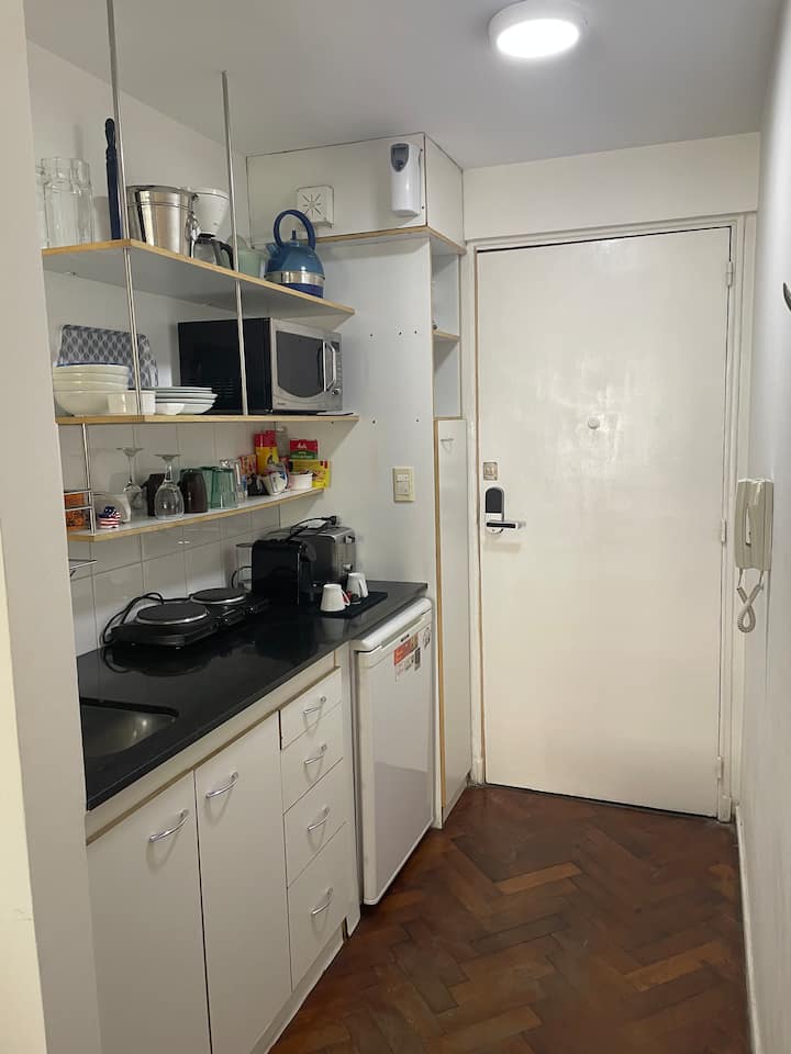 Studio apartment in Recoleta with a balcony. The unit is furnished and equipped with a kitchenette, Nespresso coffee maker, microwave, and a 32" LED TV with Digital Channels and Chromecast Ultra. It has air conditioning and central heating, an en-suite bathroom with a bubble tub and hair dryer, and elevator access. Located one block from Plaza Vicente López, on a quiet street near Av. Santa Fe and Recoleta Cemetery.