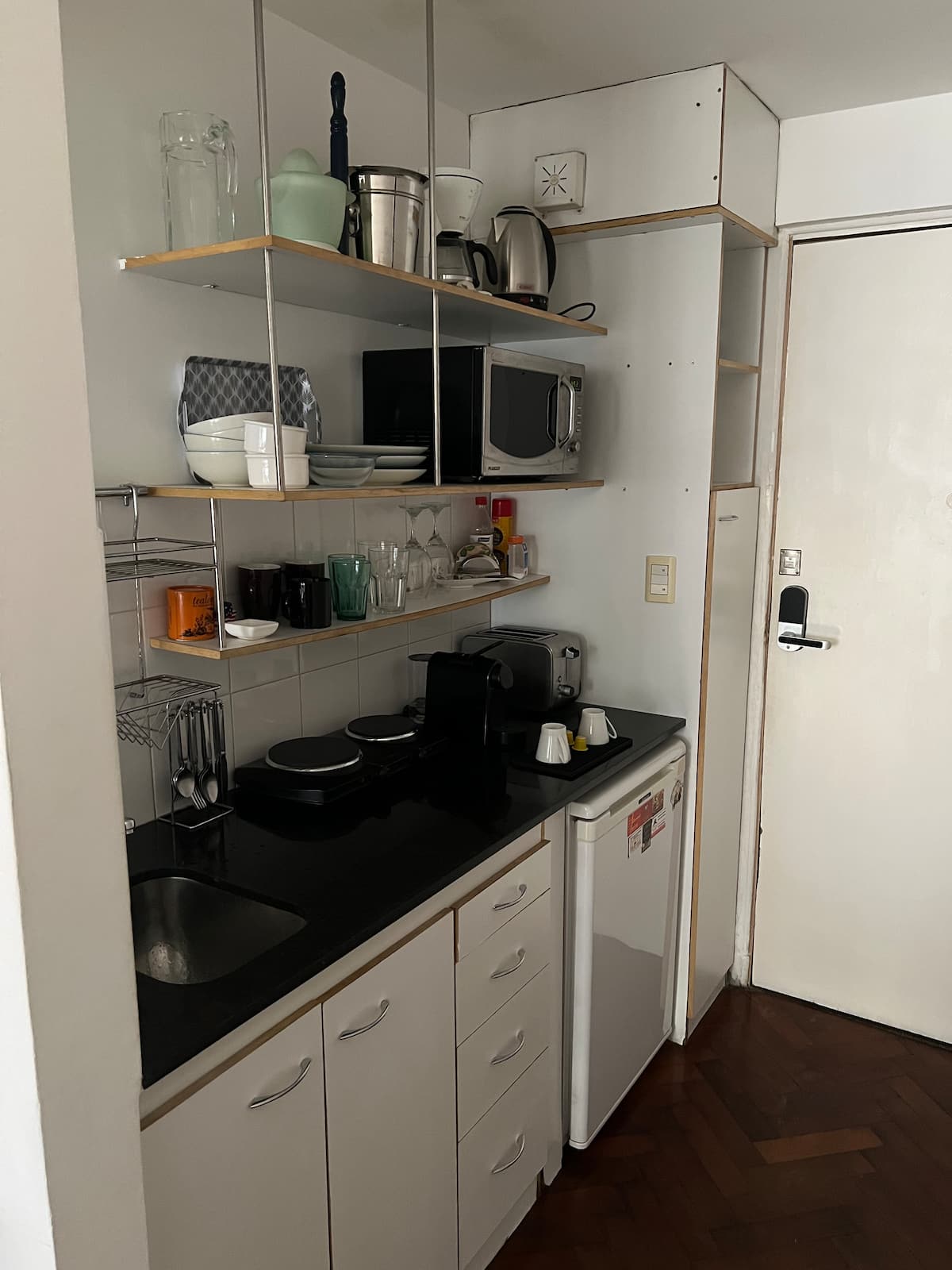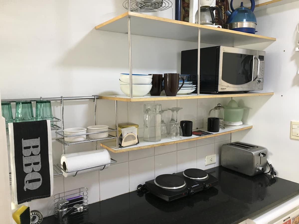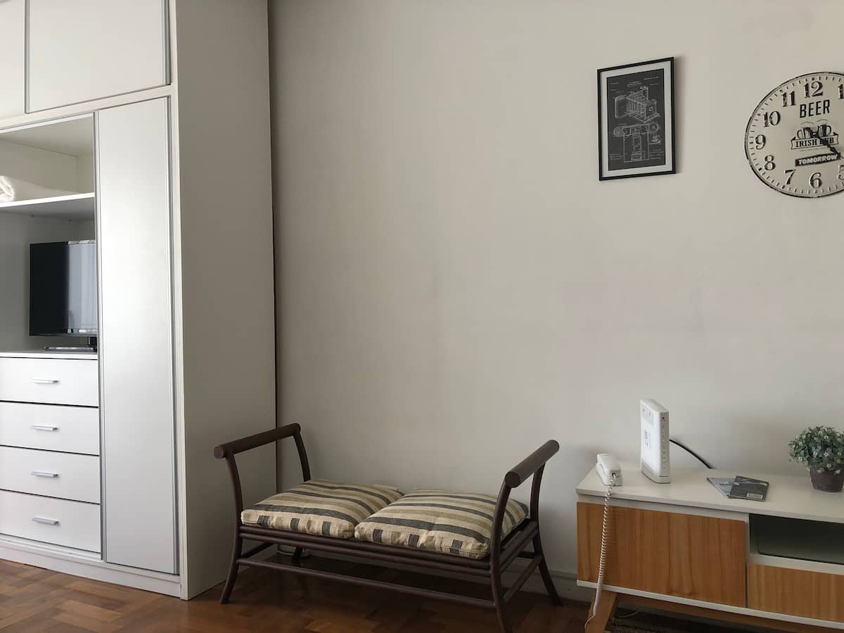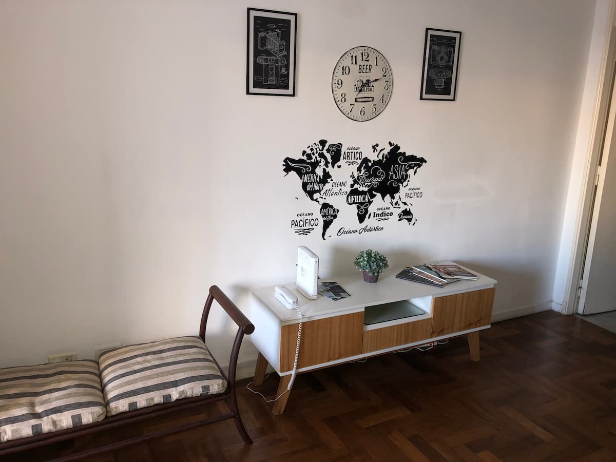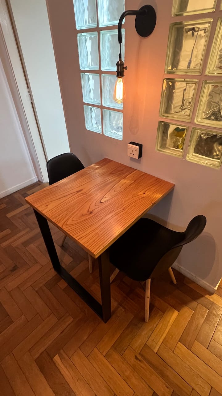 Studio apartment in Recoleta with a balcony. The unit is furnished and equipped with a kitchenette, Nespresso coffee maker, microwave, and a 32" LED TV with Digital Channels and Chromecast Ultra. It has air conditioning and central heating, an en-suite bathroom with a bubble tub and hair dryer, and elevator access. Located one block from Plaza Vicente López, on a quiet street near Av. Santa Fe and Recoleta Cemetery.