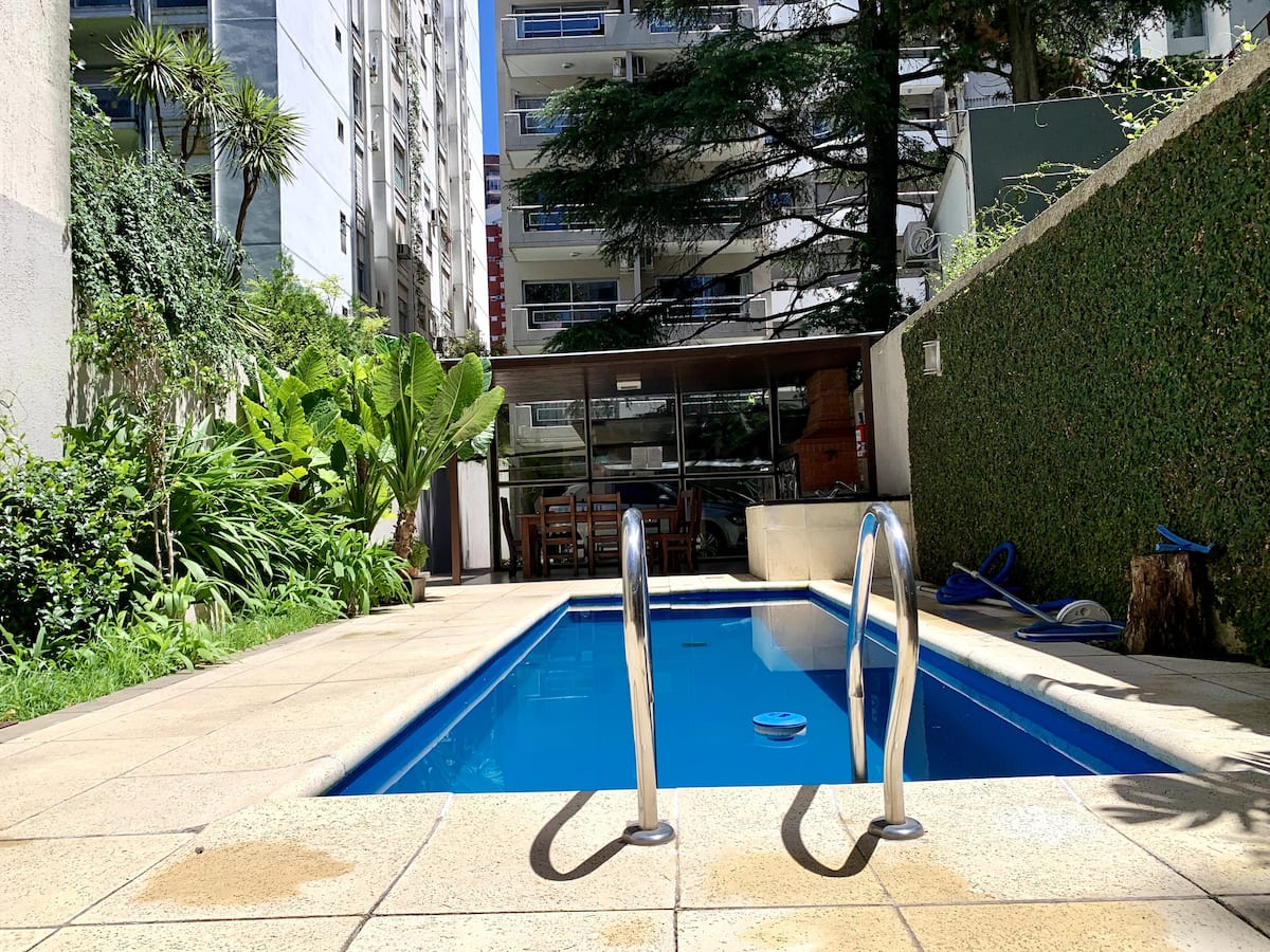 Apartment in Recoleta. Access to a pool is mentioned. The listing also describes the area as quiet, with proximity to parks and shopping, dining, education and healthcare, as well as transport options.
