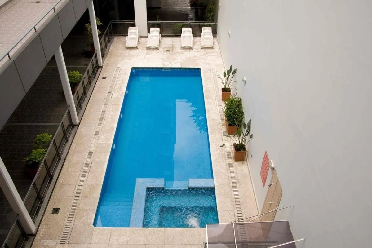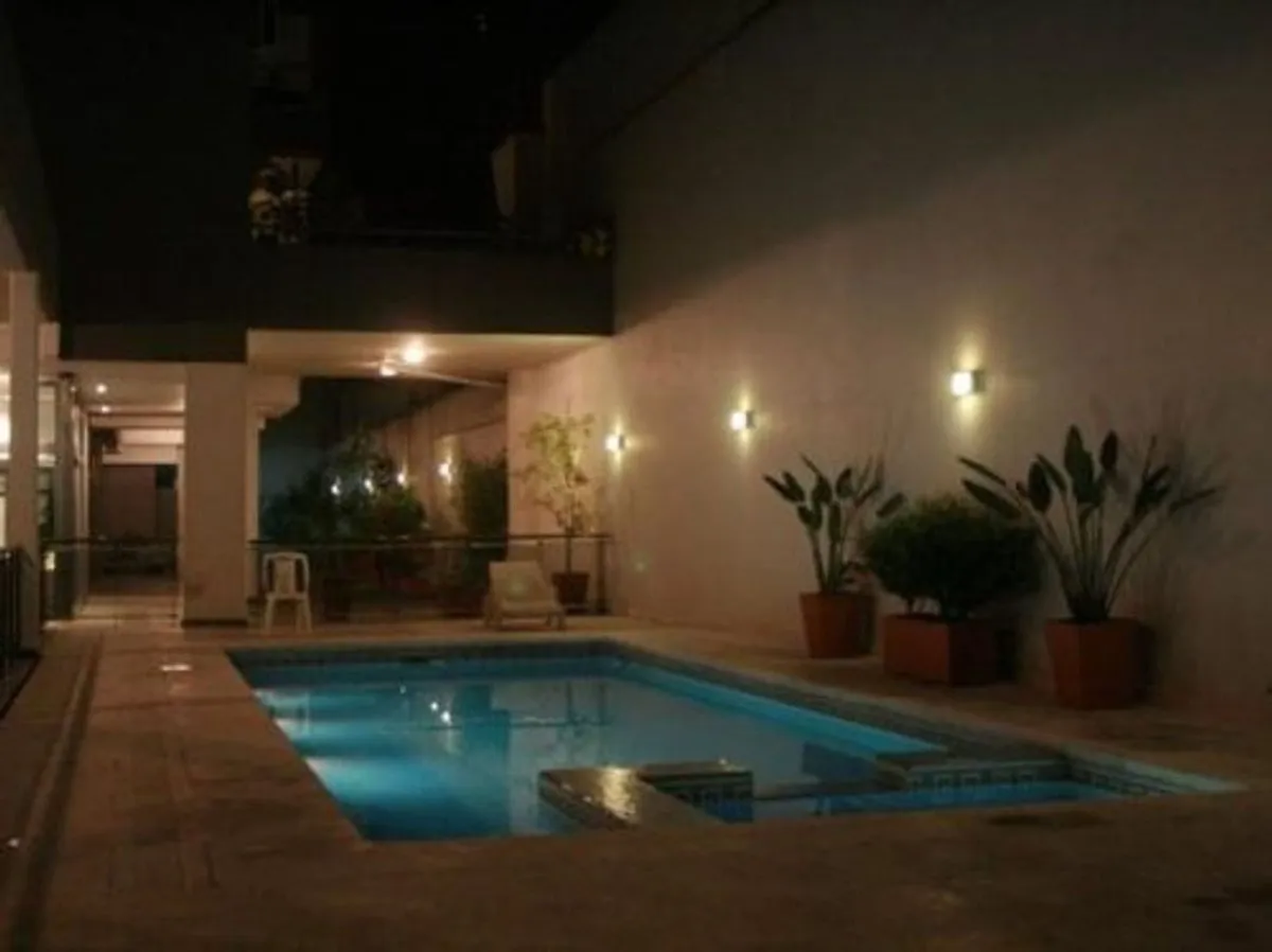Two-room apartment for rent in Recoleta, street address on Av. Charcas at 3000. It includes a balcony facing the courtyard, a living-dining area, a separate kitchen, 1 bedroom with built-in wardrobe, and a full bathroom. The building offers a pool, a communal room (SUM) and laundry, and the unit is suitable for professional use. Available from 6 April. Lease term until October 2027 requires a rental guarantee bond and an advance month plus a deposit month; building fees and utilities are not spe
