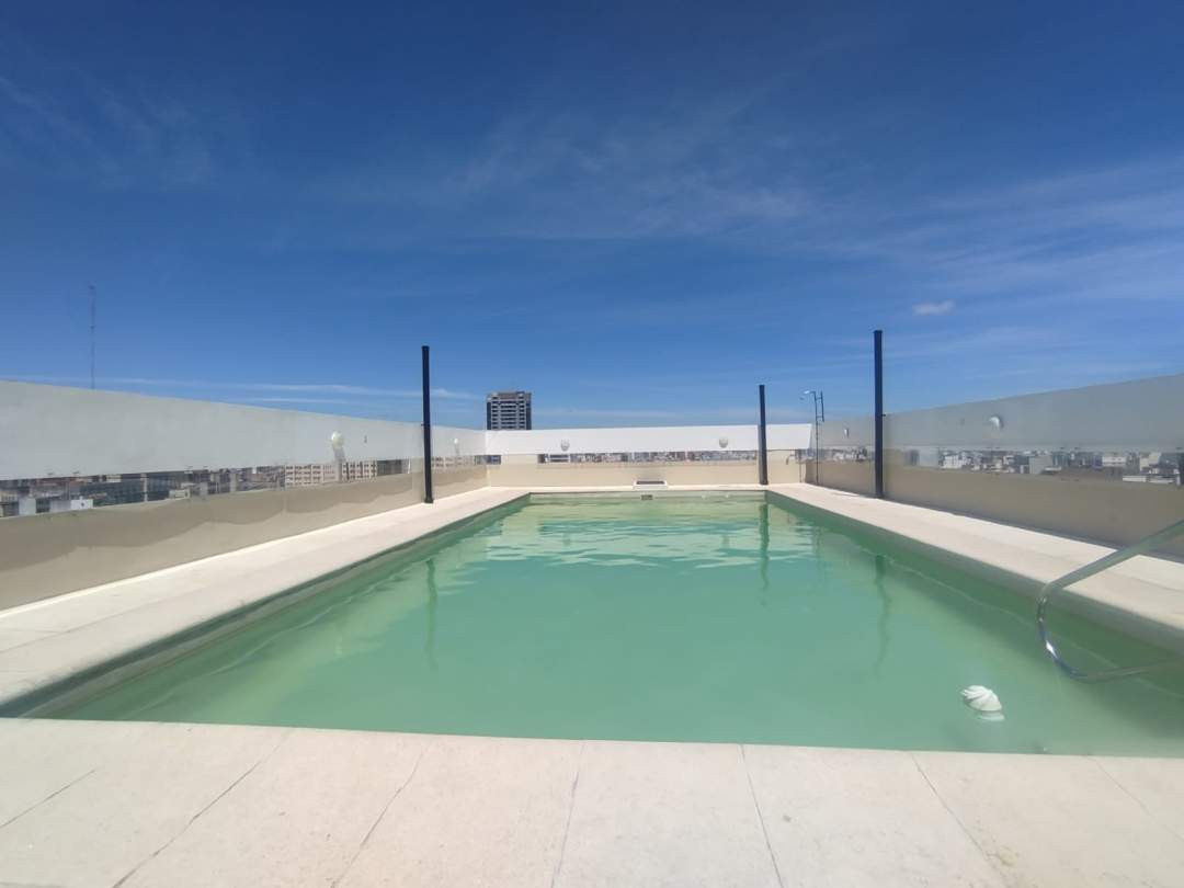 Furnished apartment in Recoleta, arranged as a combined living area with one bedroom. It has a complete bathroom, kitchenette, air conditioning (hot and cold), and includes a living set, dining set, TV, and bedroom with a 2-seat bed. The unit is on Av. Santa Fe and offers a view from the large pool in the building. The rental price includes building fees (expensas) and ABL, while electricity, gas and internet are paid by the tenant. Located near the Universidad de Palermo and the UBA, and close