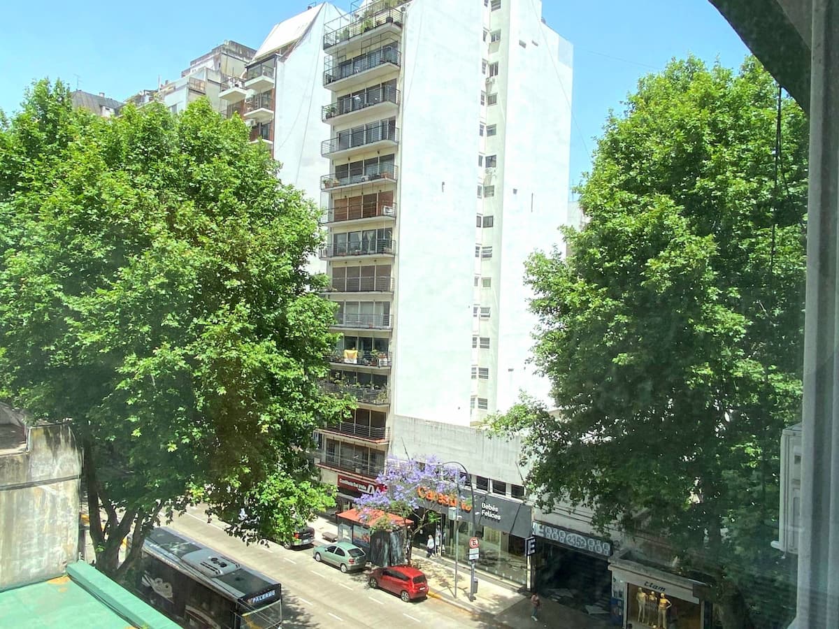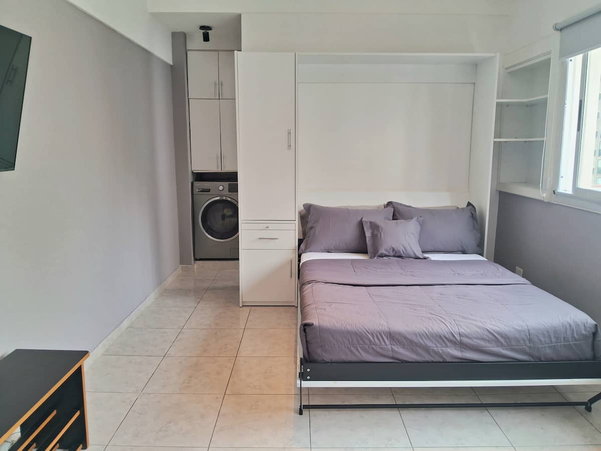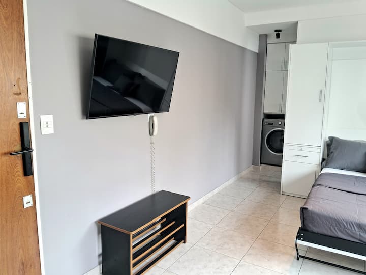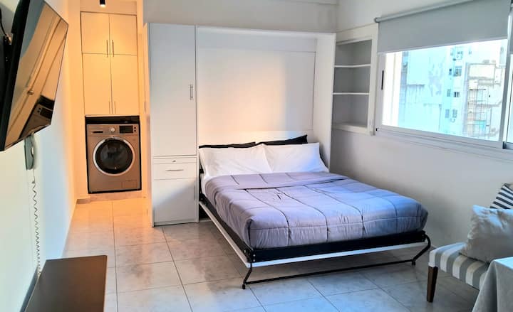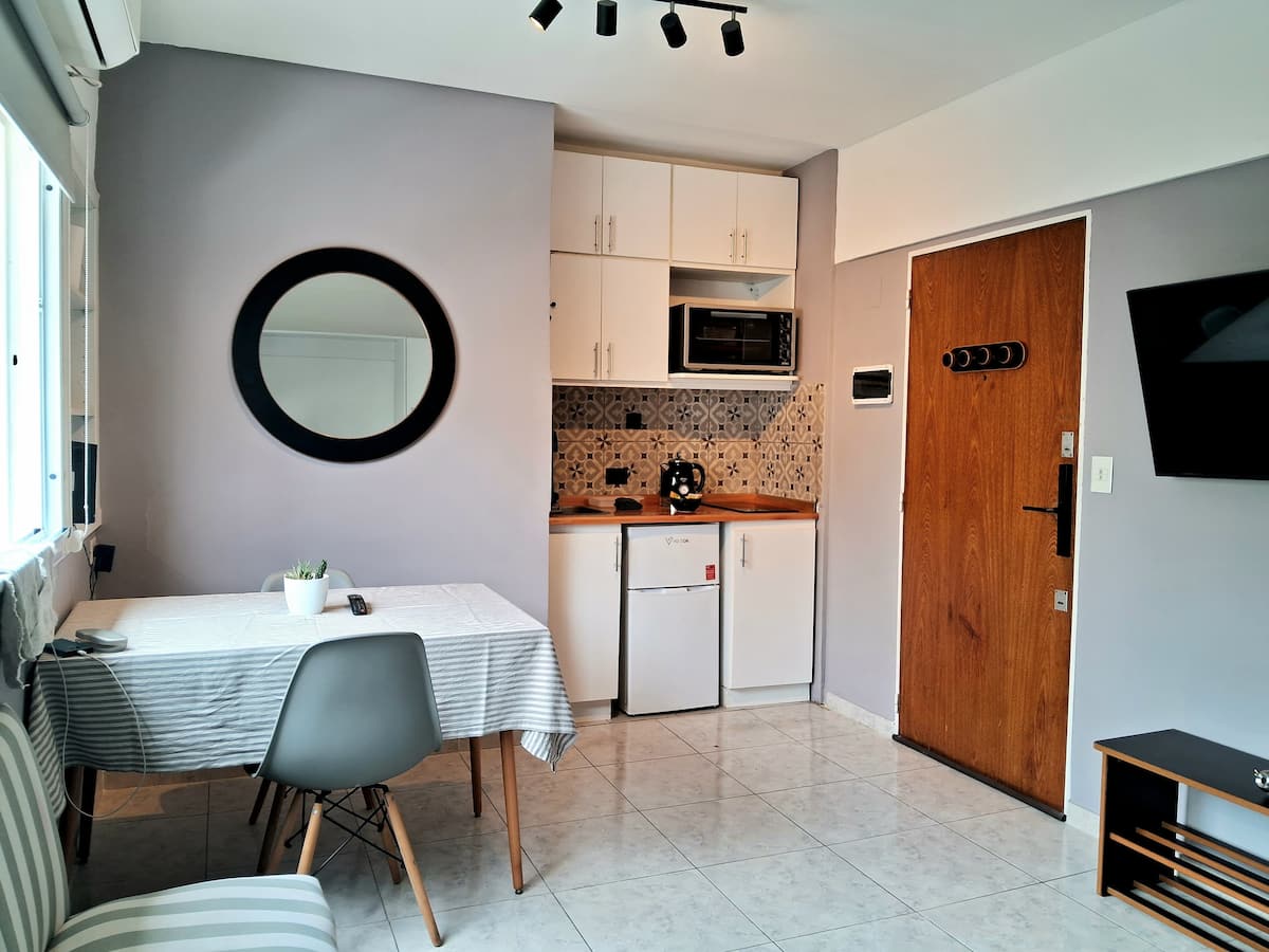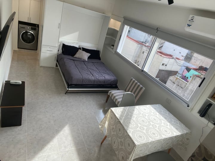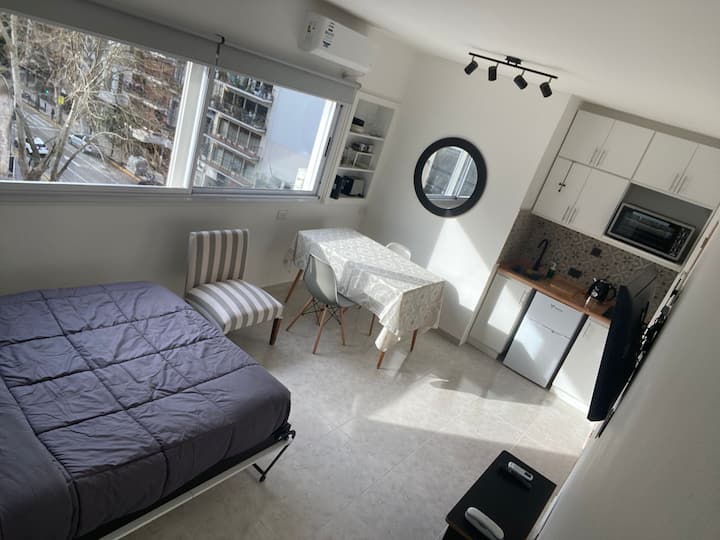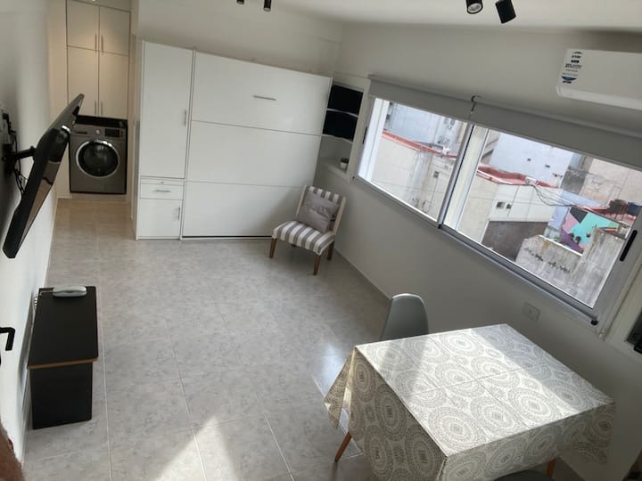 Studio apartment in Recoleta on the highest floor, 20 m². The unit has three areas: kitchenette and dining/work desk, a rest area with a folding bed, and a bathroom and cleaning area. 24/7 security with on-site staff and cameras, plus a pool in the building.