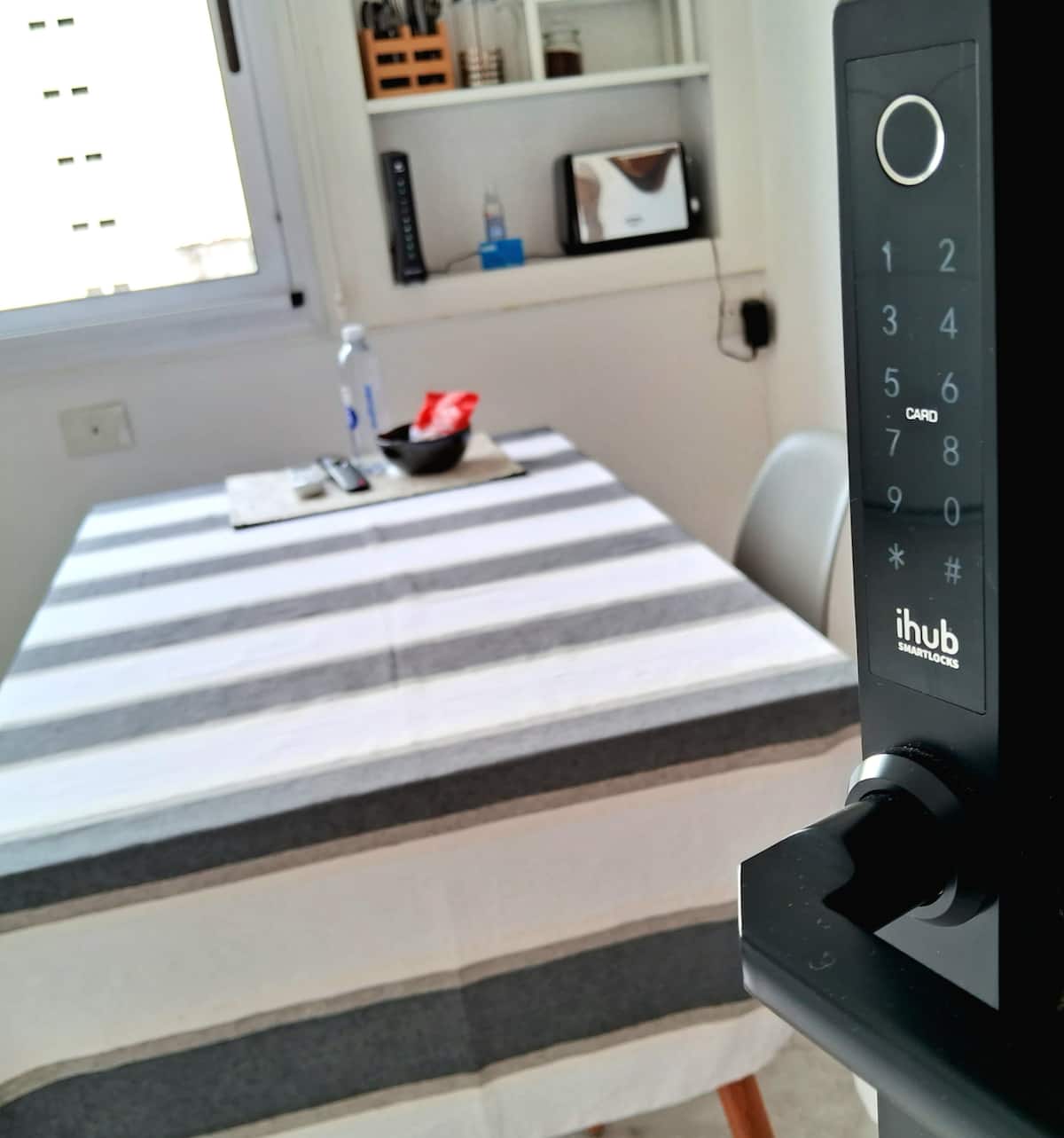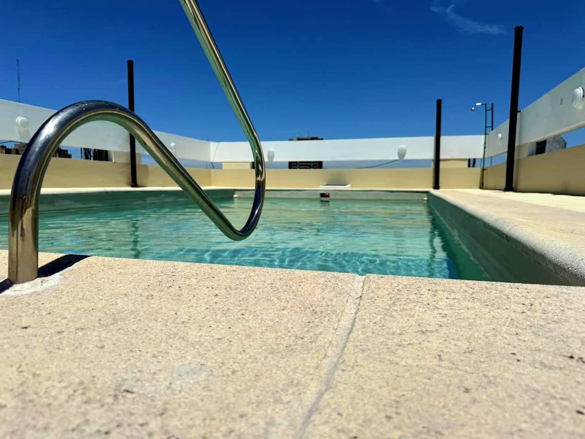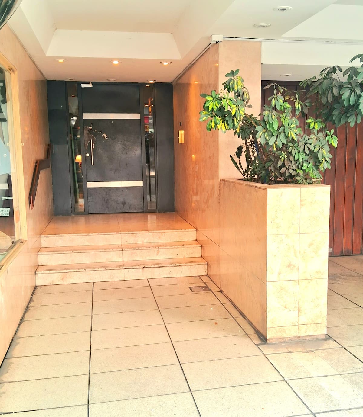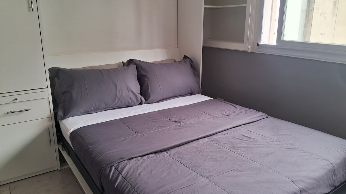 Studio apartment in Recoleta on the highest floor, 20 m². The unit has three areas: kitchenette and dining/work desk, a rest area with a folding bed, and a bathroom and cleaning area. 24/7 security with on-site staff and cameras, plus a pool in the building.