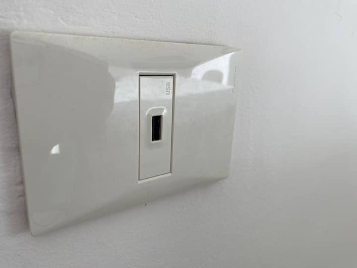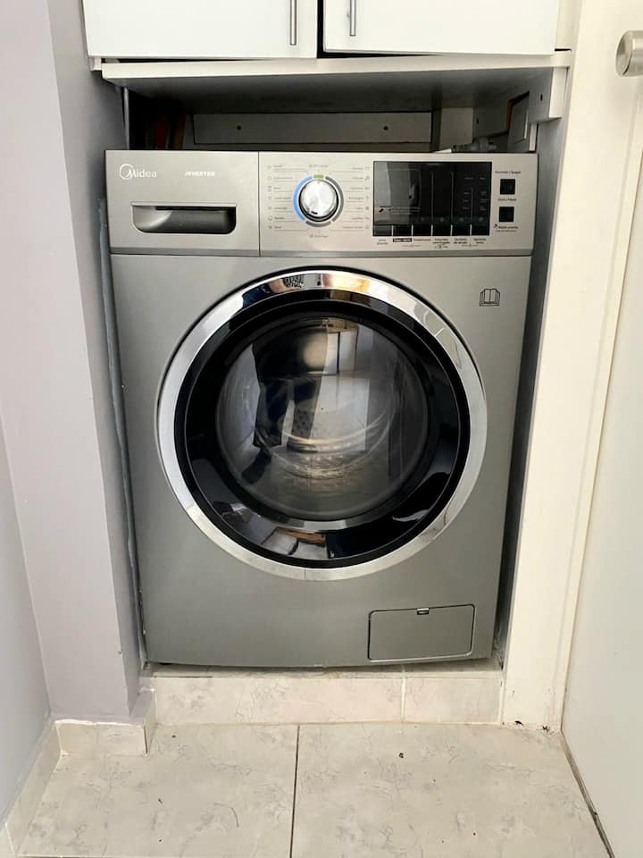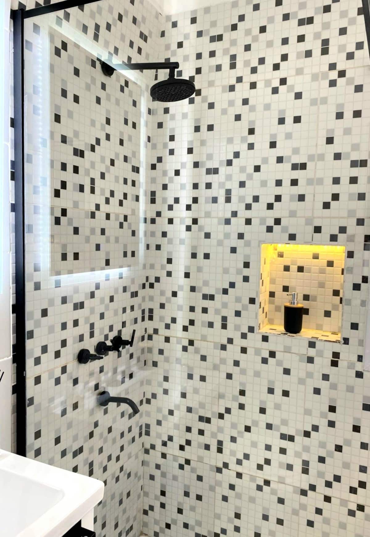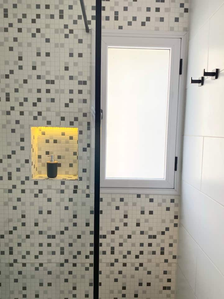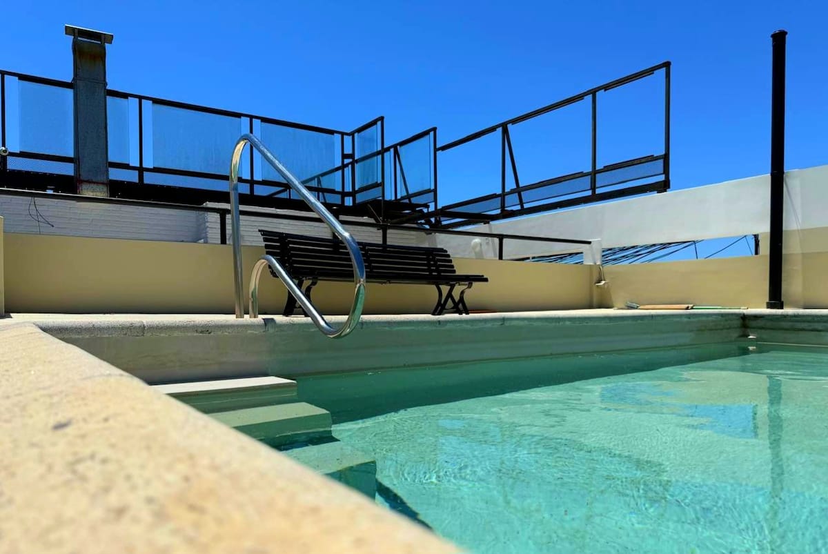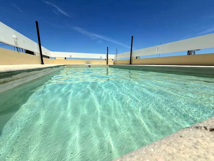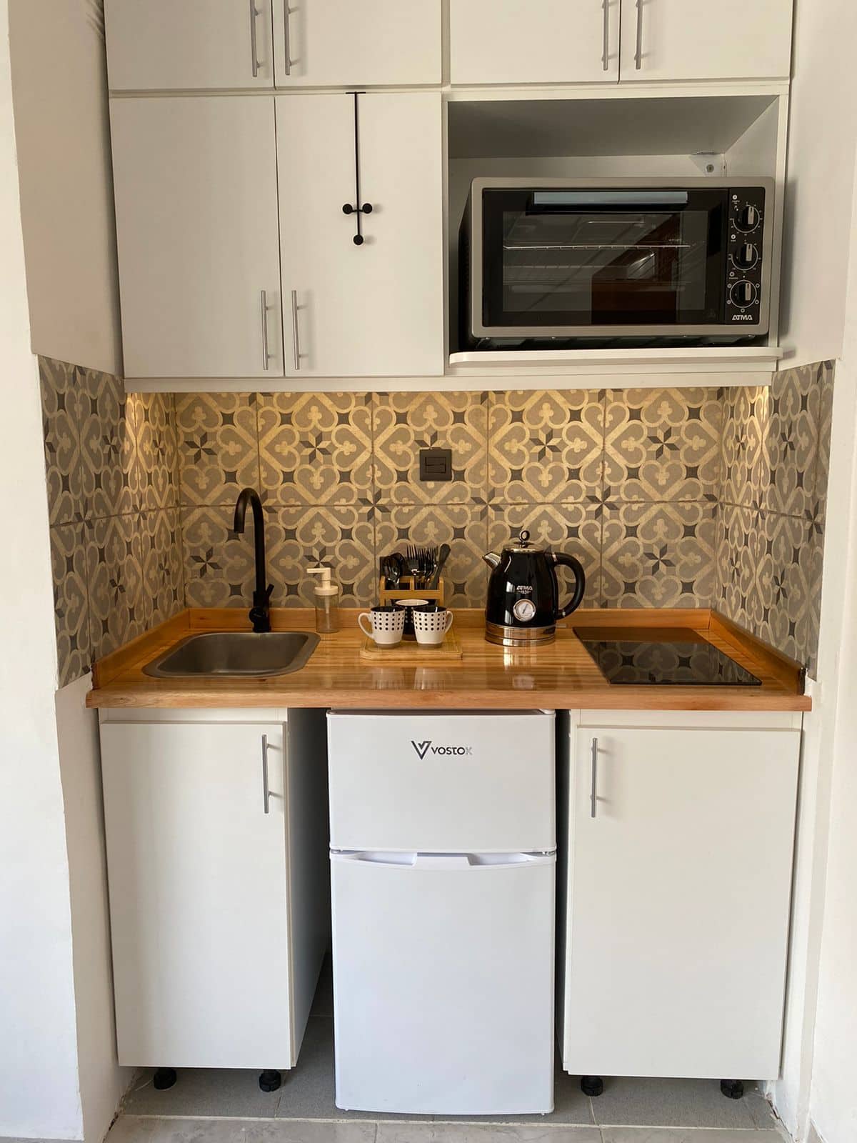 Studio apartment in Recoleta on the highest floor, 20 m². The unit has three areas: kitchenette and dining/work desk, a rest area with a folding bed, and a bathroom and cleaning area. 24/7 security with on-site staff and cameras, plus a pool in the building.
