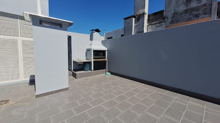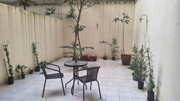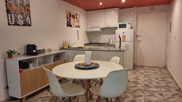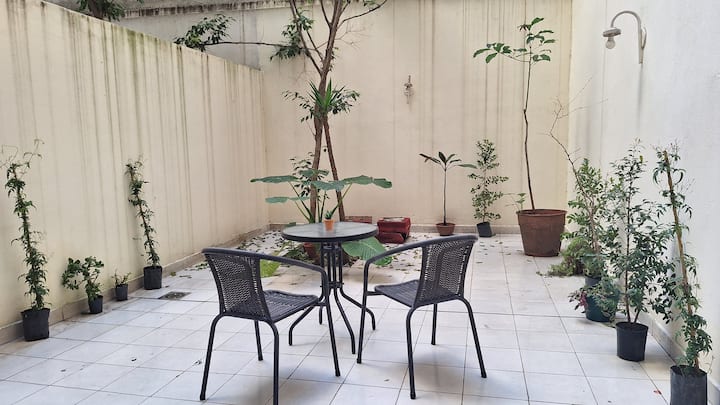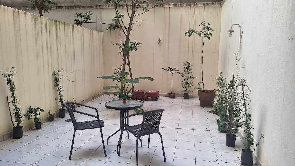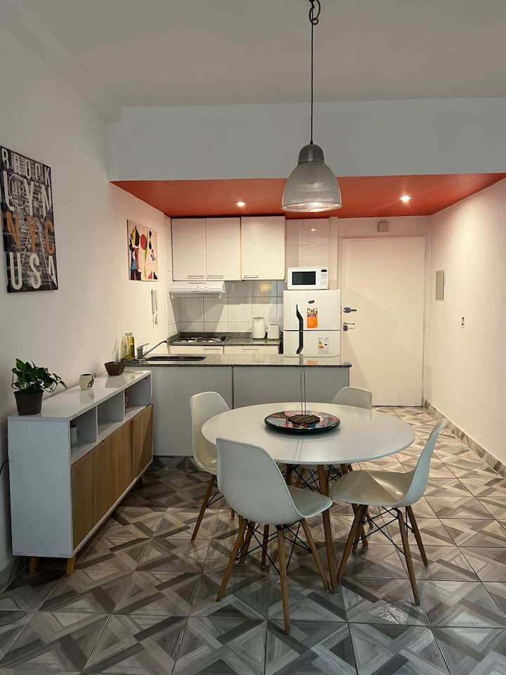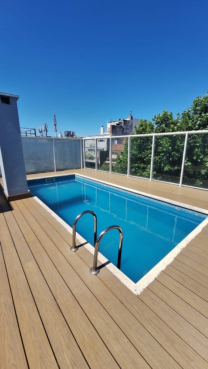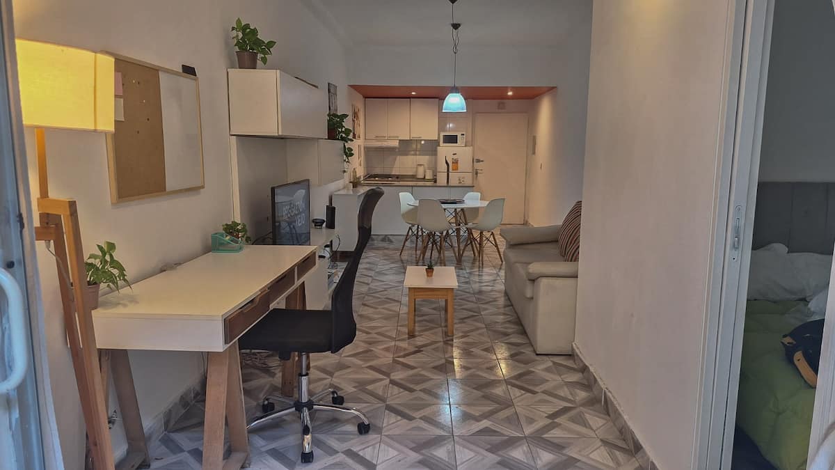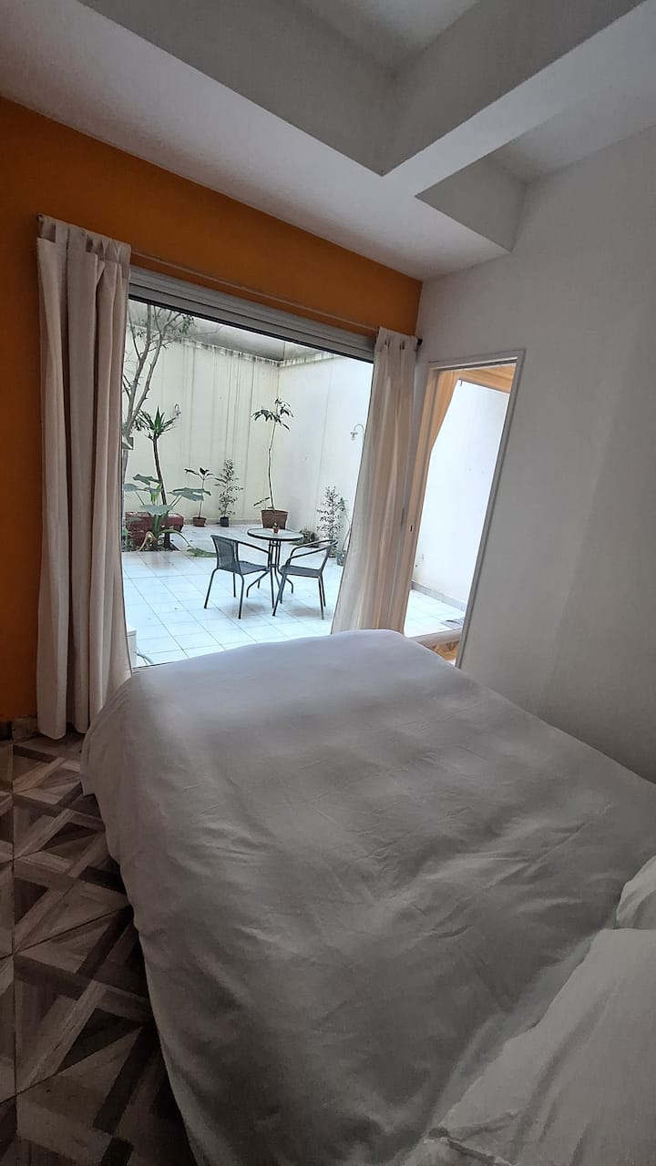 Two-room apartment in Recoleta with a private patio. Fully furnished with WiFi, Flow TV and air conditioning. The listing notes multiple entrances and a quiet environment; the pool is closed for the season.