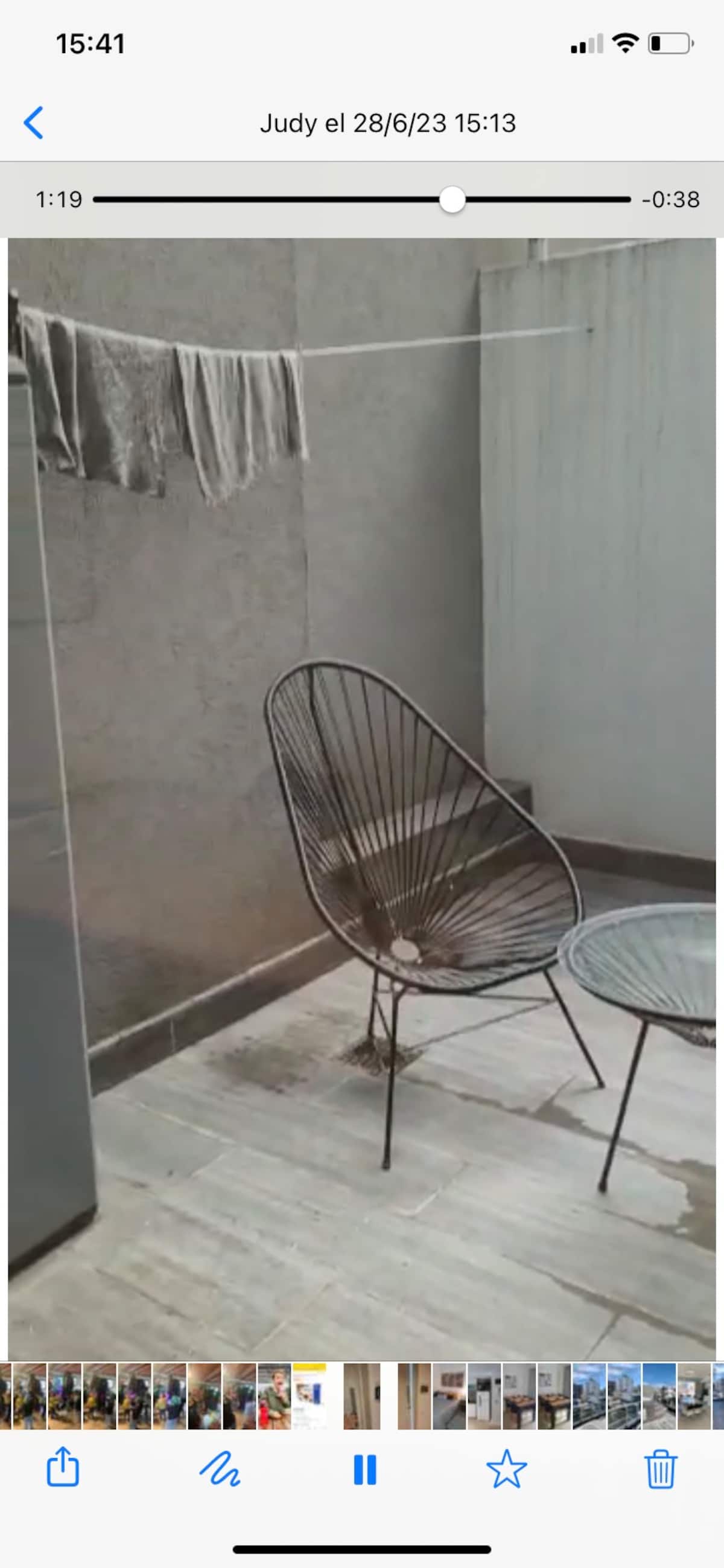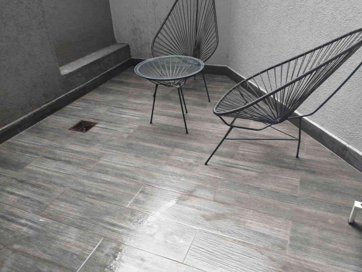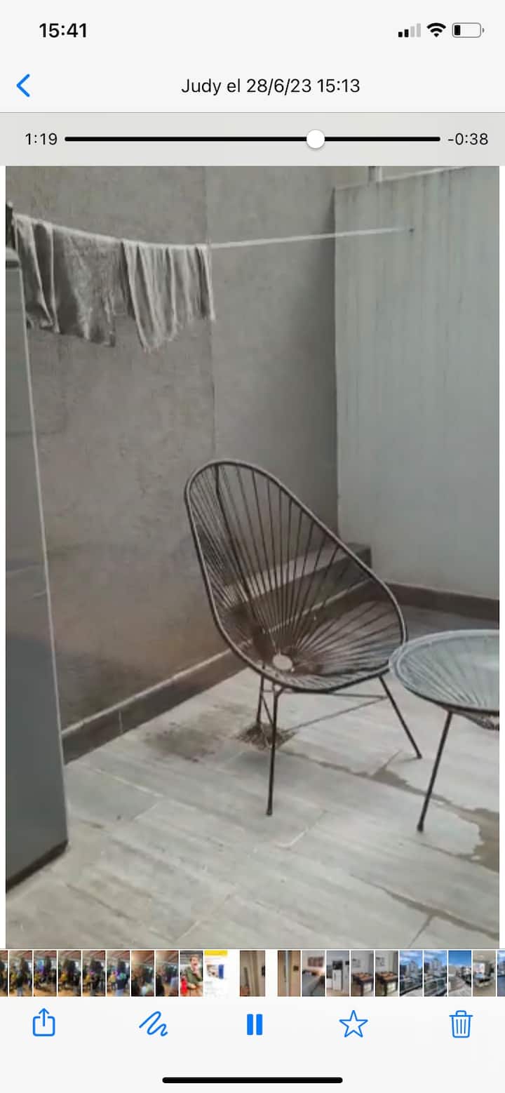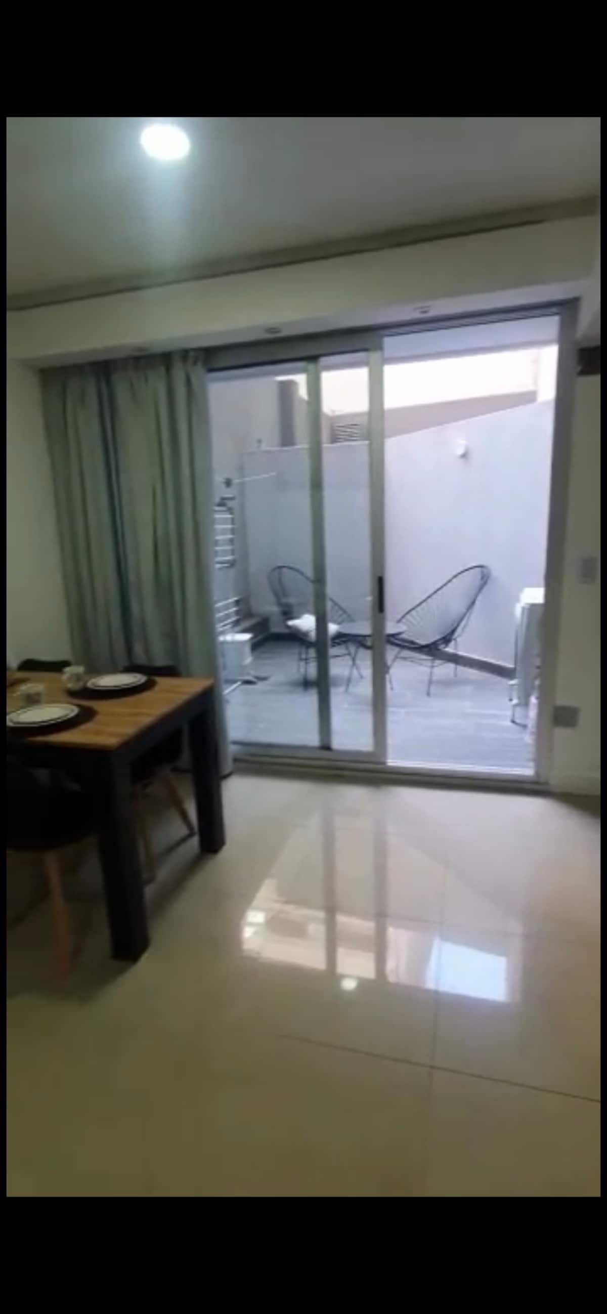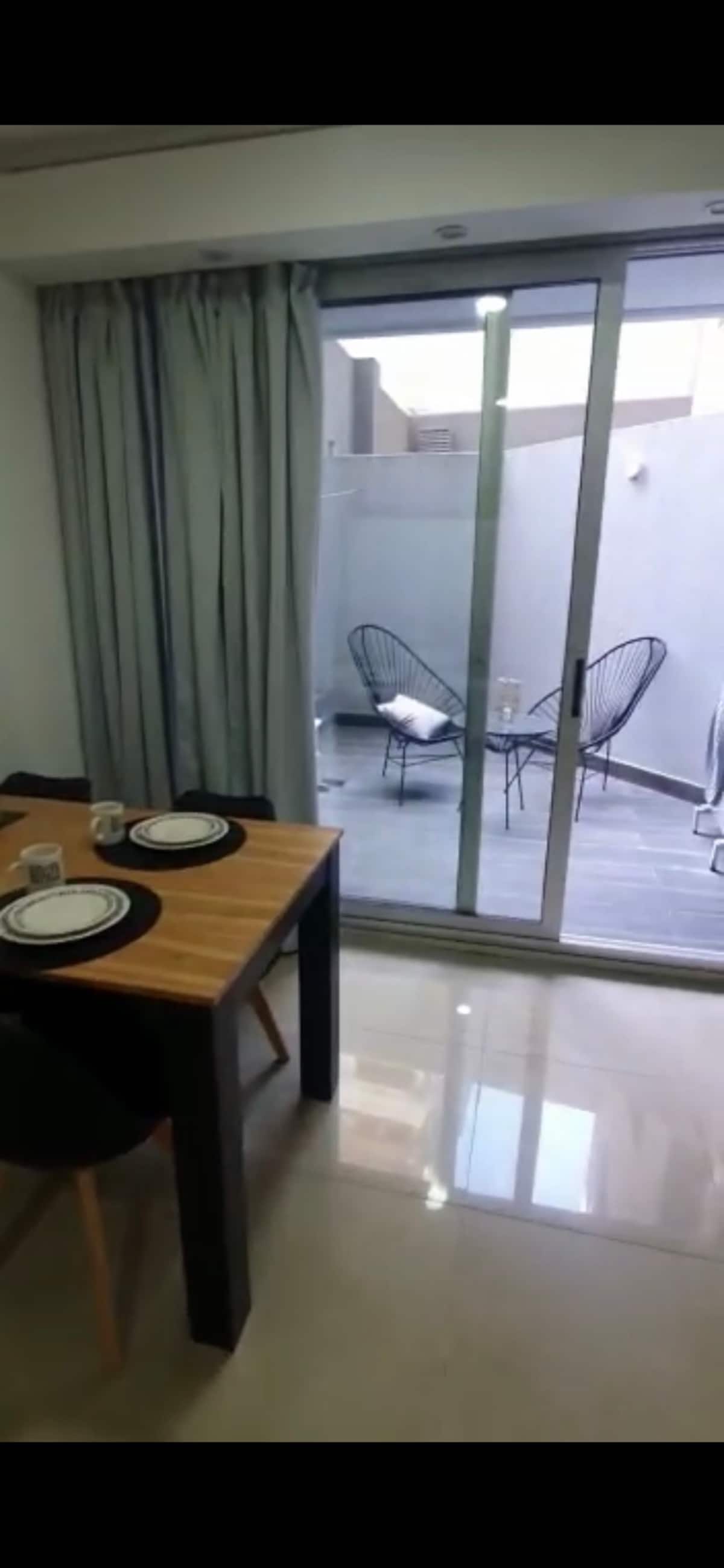 Apartment with 1 bedroom in Recoleta. It has an entrance hall, a reception room, a full bathroom, a bedroom with a double bed, and storage. The living room and dining area overlook a private interior patio; the unit has a kitchen and a dining table for 4. Laundry is available in the building, with 24/7 security, a meeting room, a grill area, and a swimming pool with solarium. A USD 20 cleaning fee is payable on check-in.