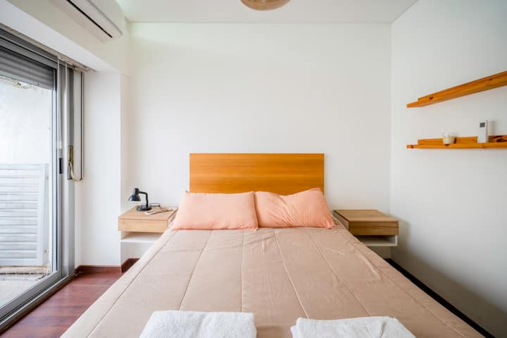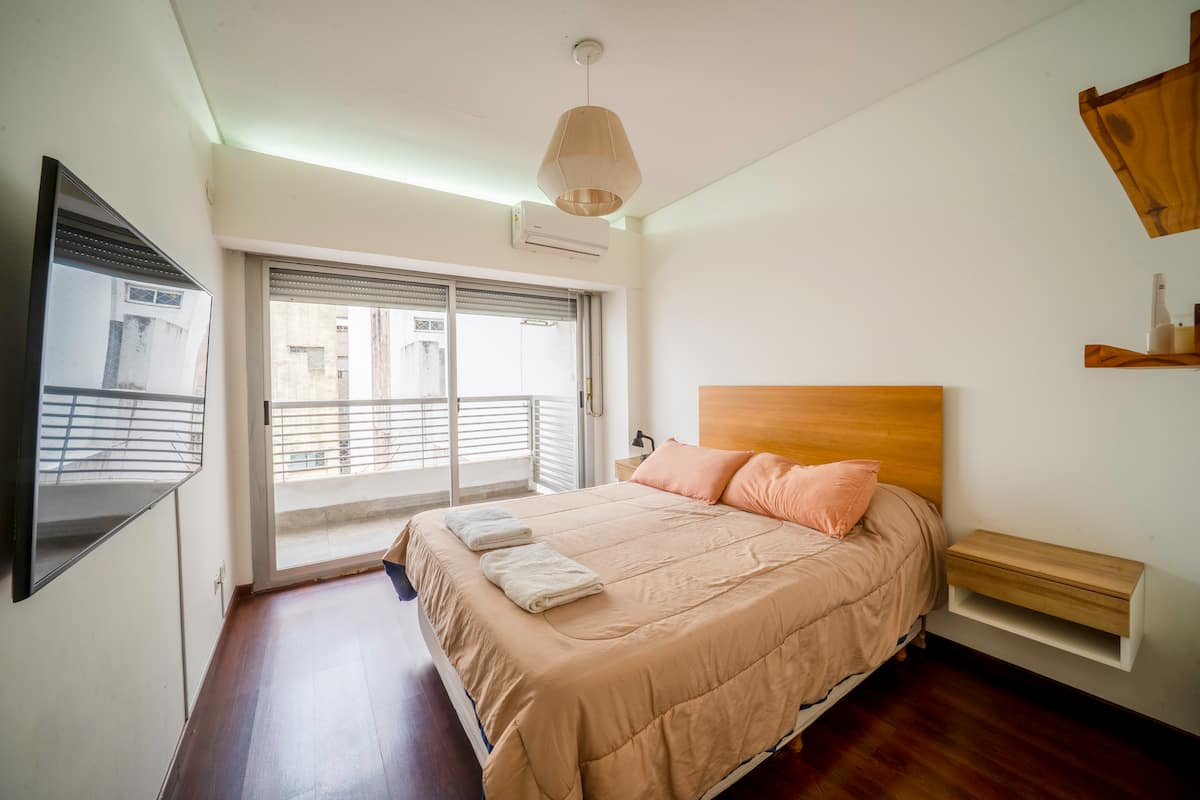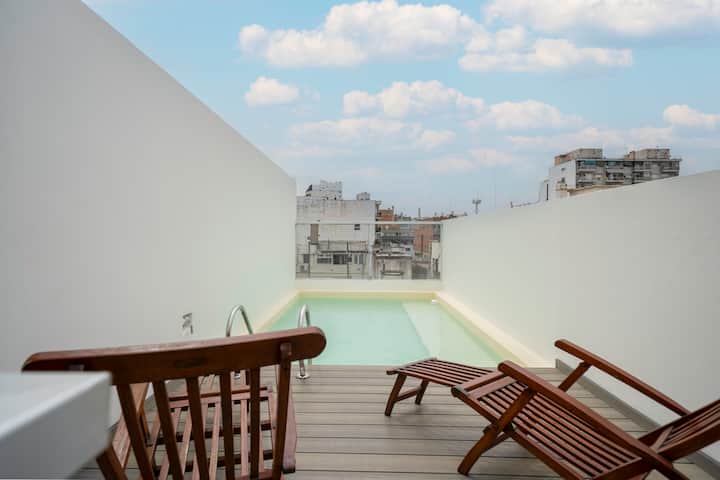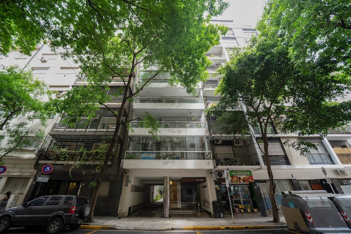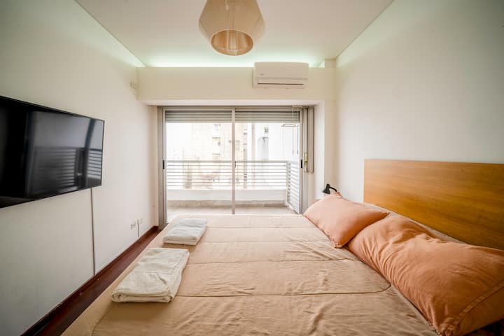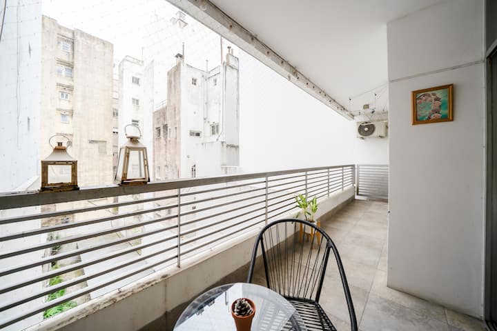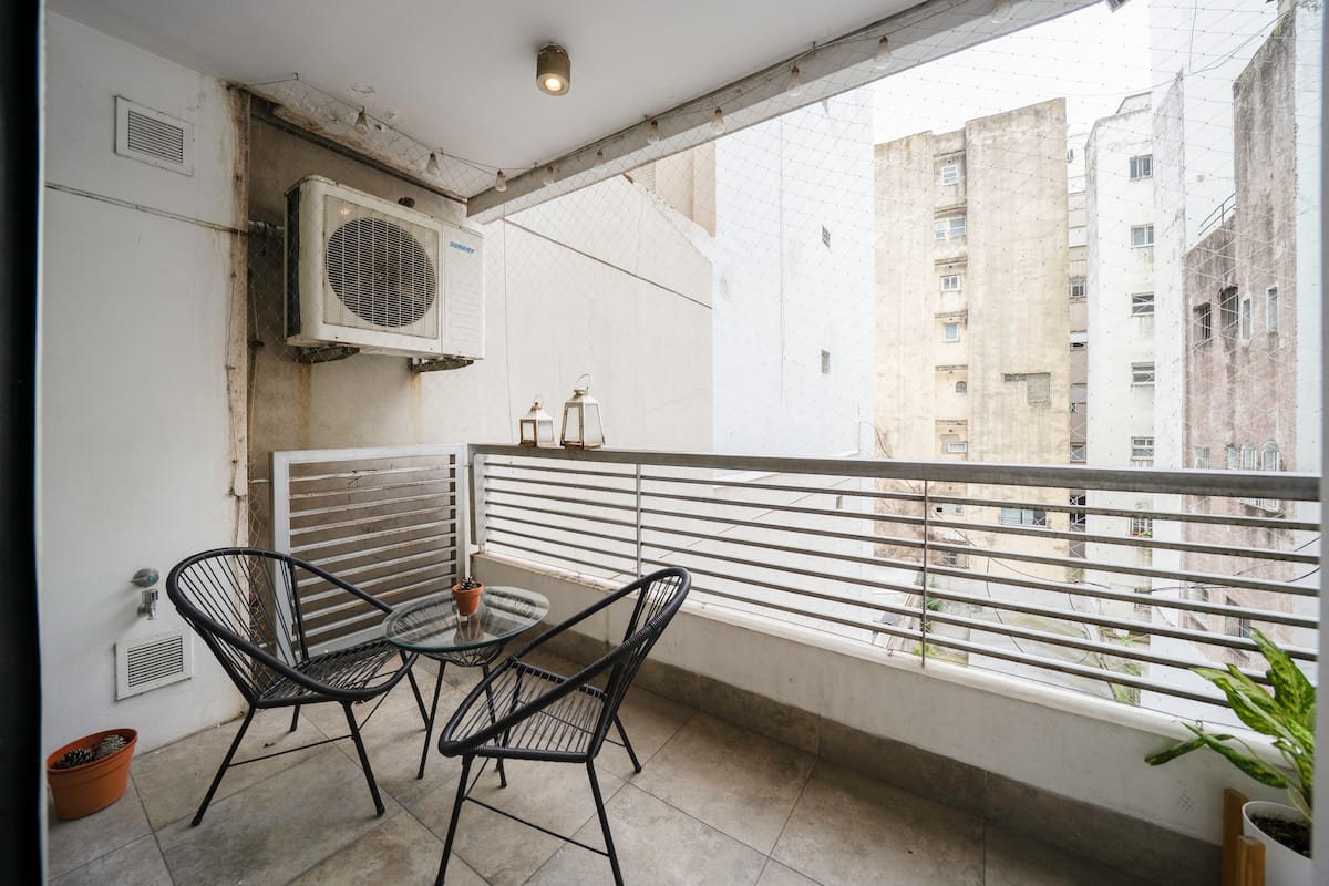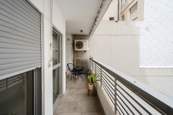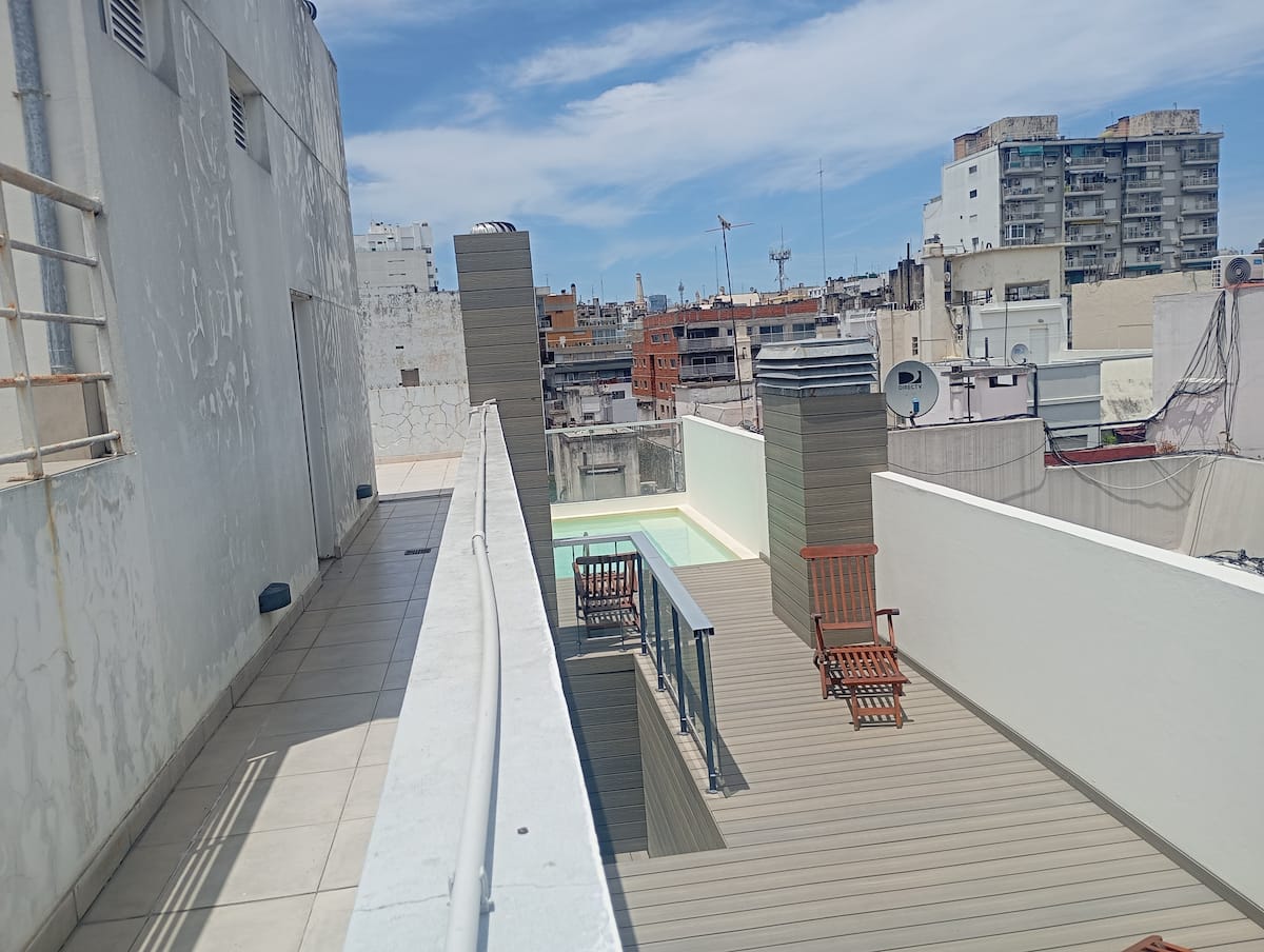 Two-room apartment in Recoleta, on the 4th floor and street-facing, with a balcony. It includes 1 bedroom, 2 full bathrooms, a fitted walk-in closet, a desk area, and a fully equipped kitchen with a washing machine. The building has a pool on the terrace and a resident manager.