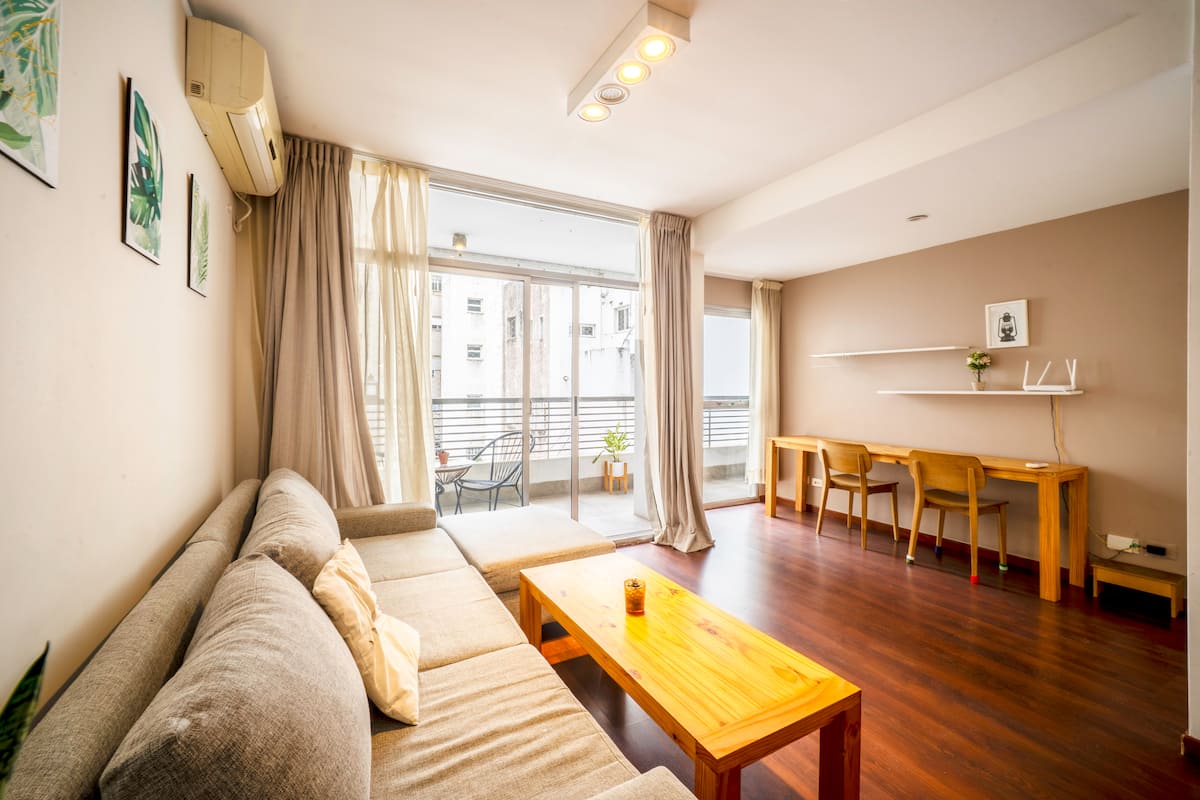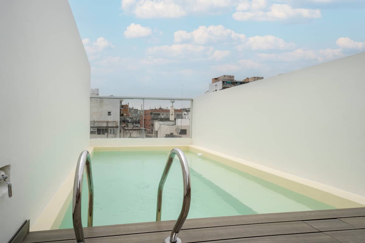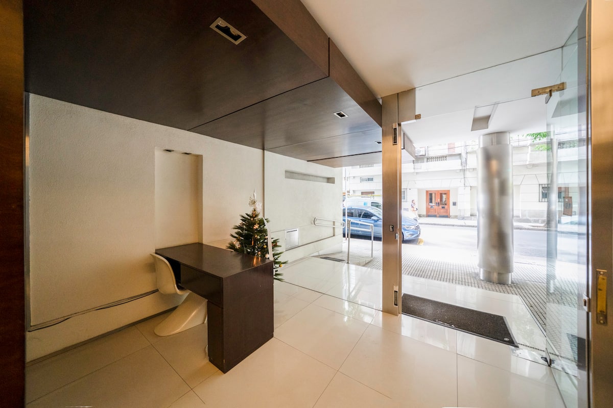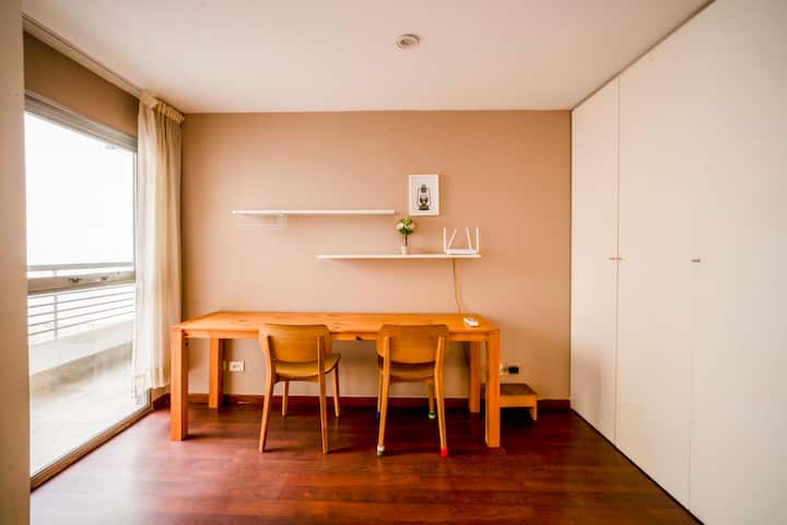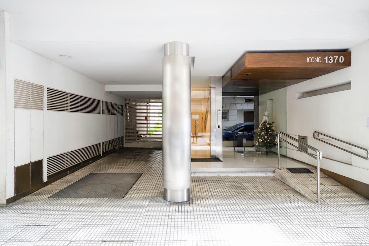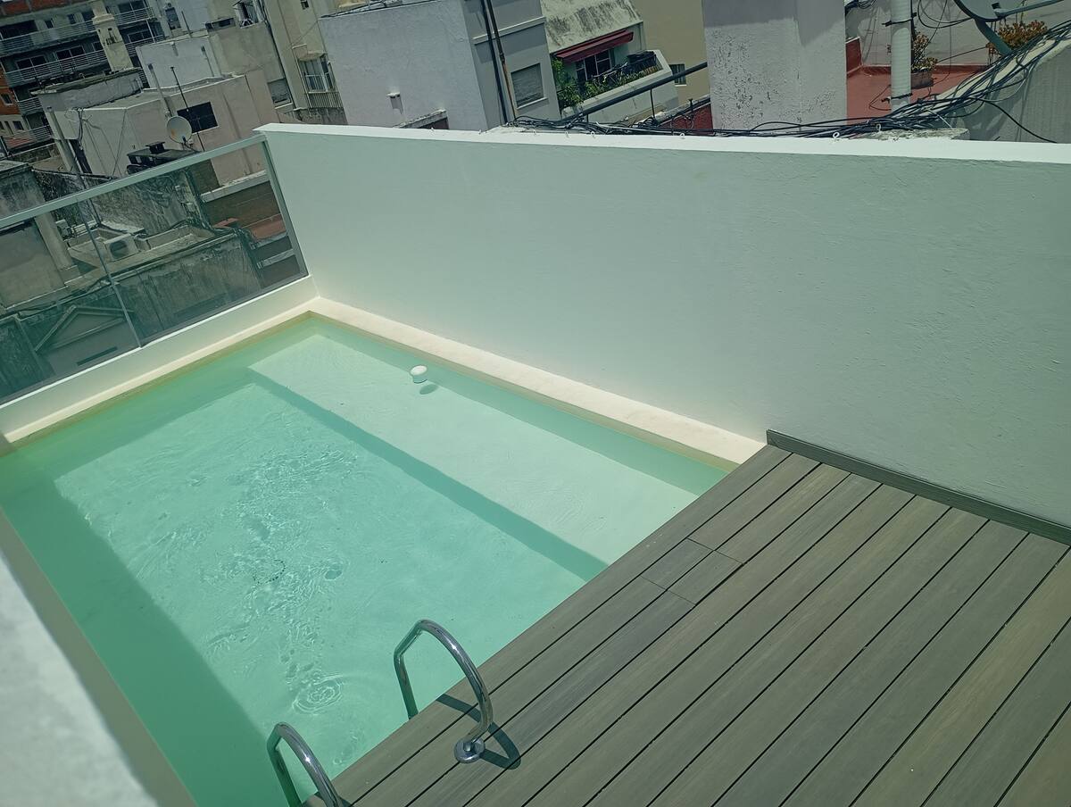 Two-room apartment in Recoleta, on the 4th floor and street-facing, with a balcony. It includes 1 bedroom, 2 full bathrooms, a fitted walk-in closet, a desk area, and a fully equipped kitchen with a washing machine. The building has a pool on the terrace and a resident manager.