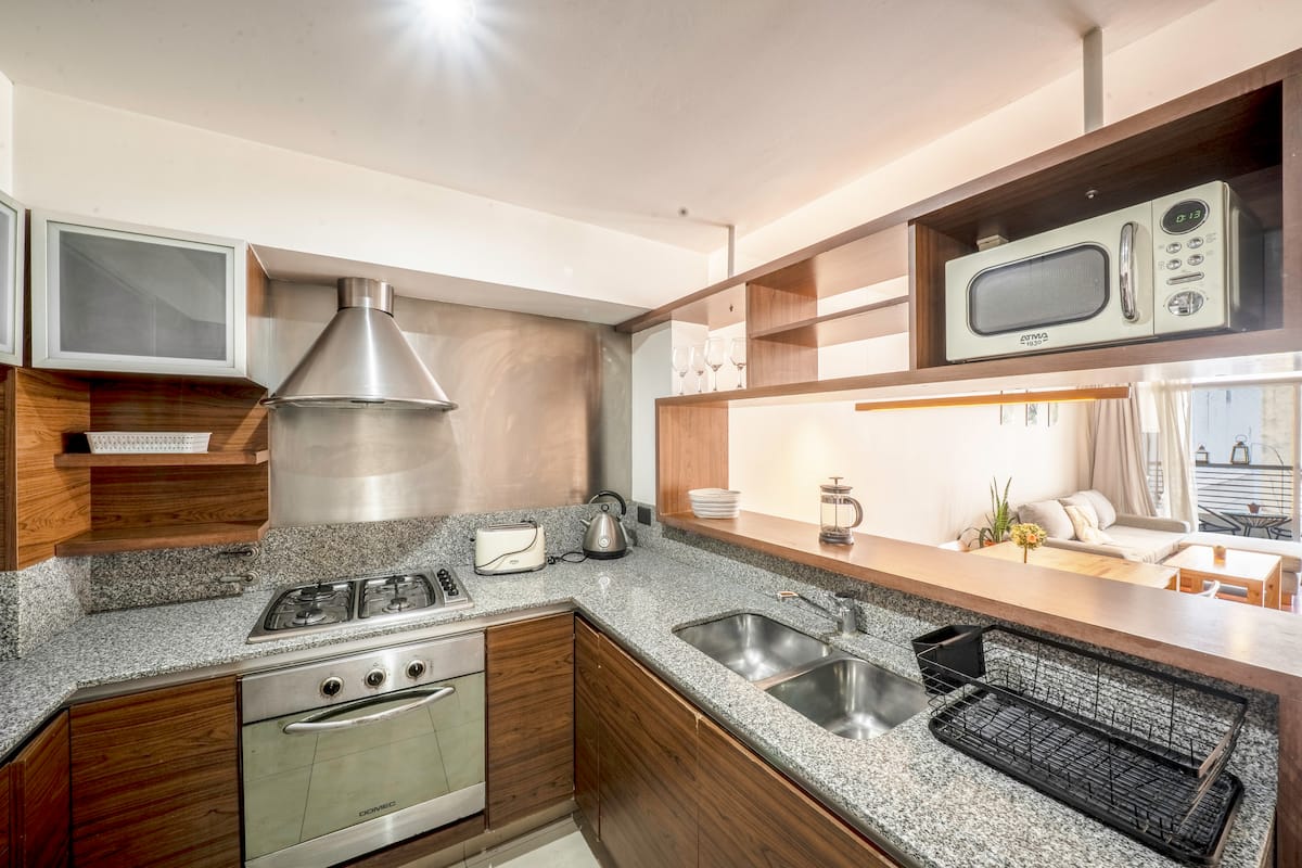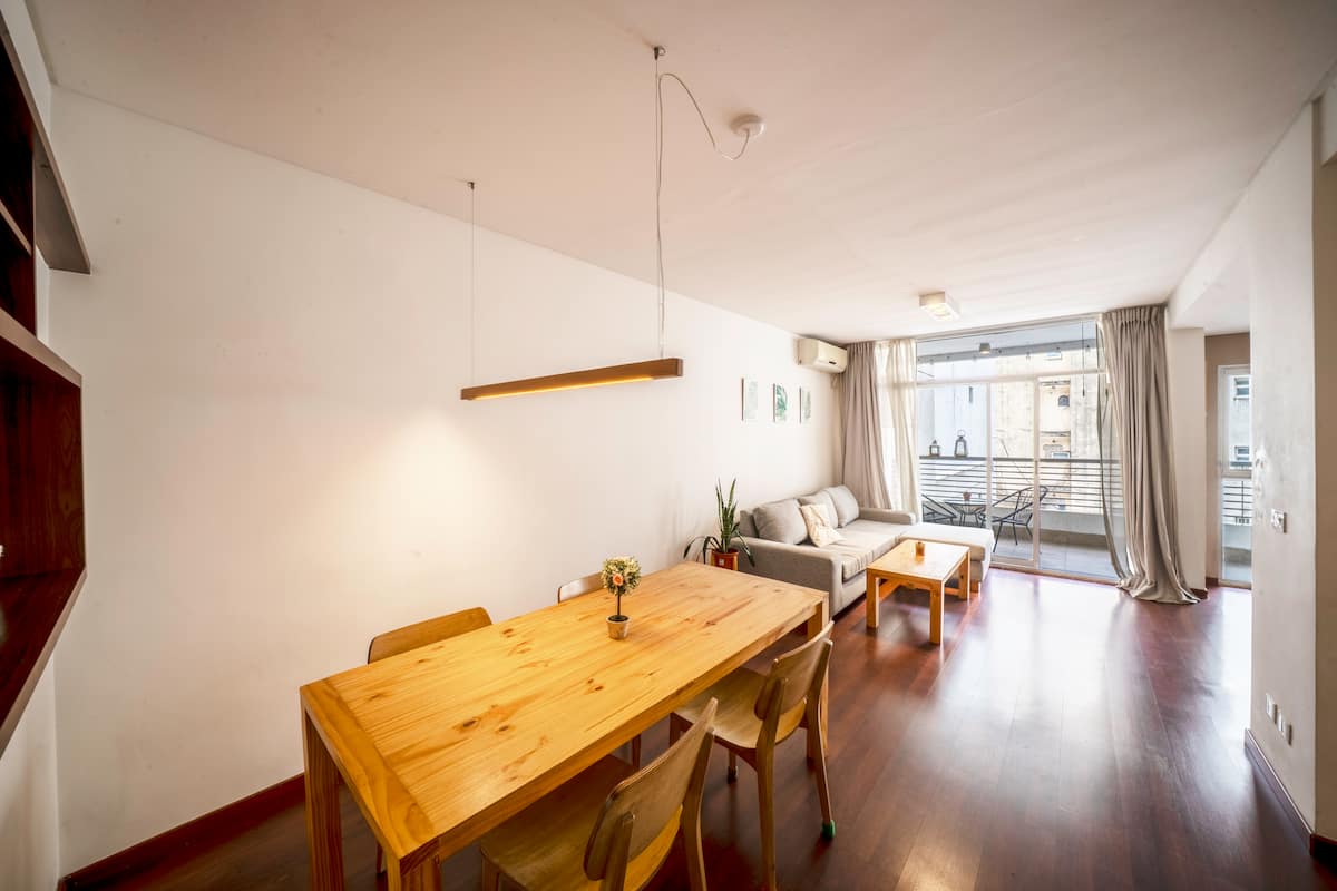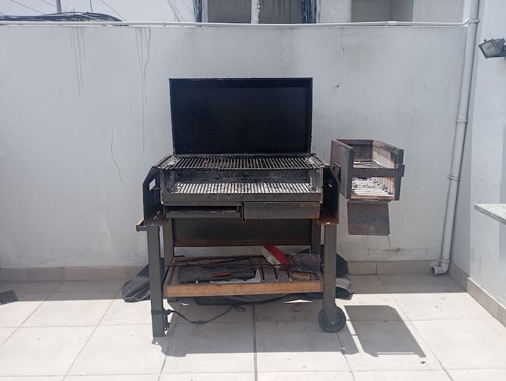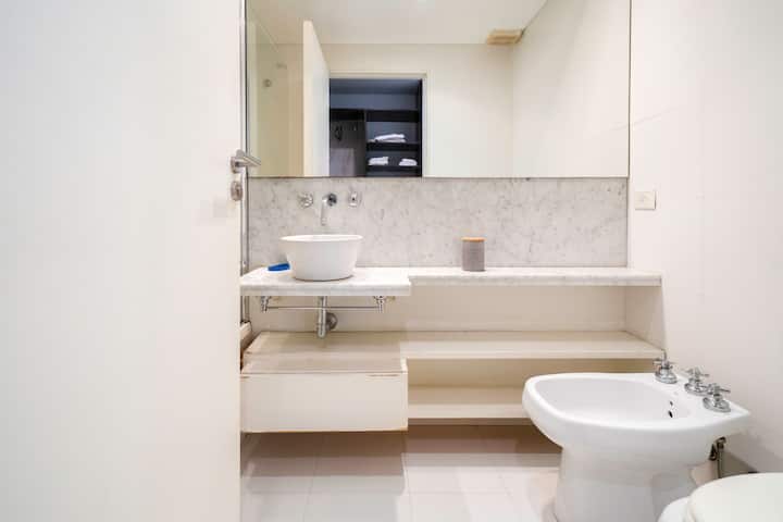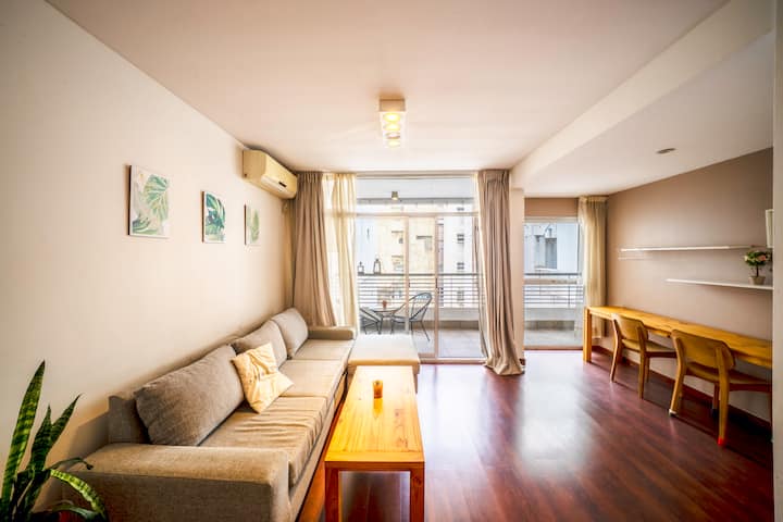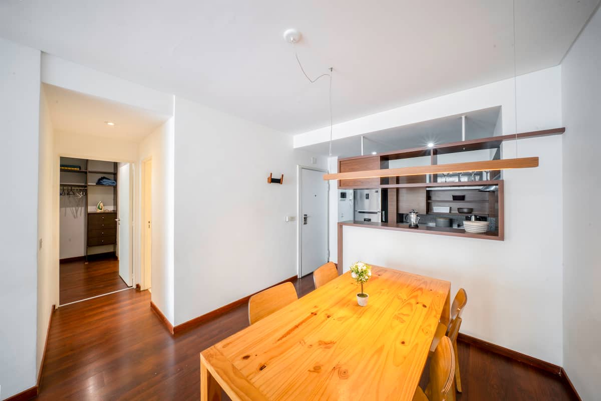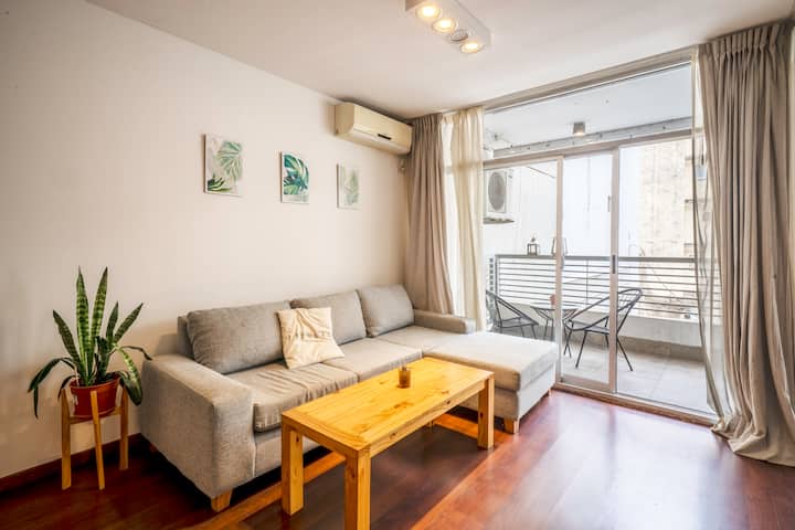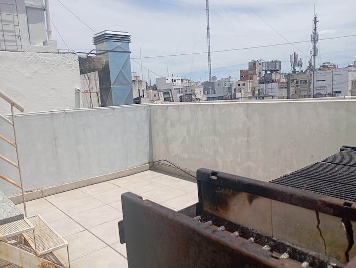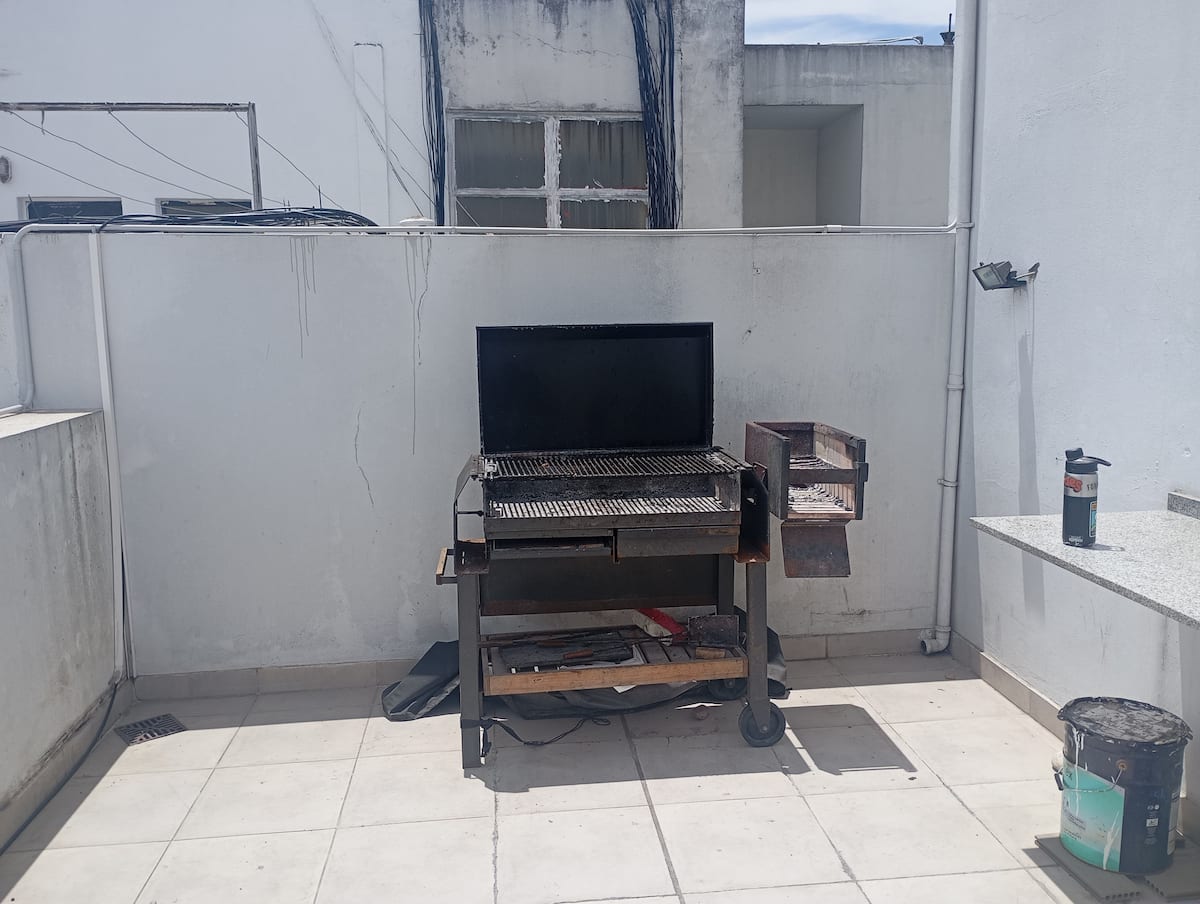 Two-room apartment in Recoleta, on the 4th floor and street-facing, with a balcony. It includes 1 bedroom, 2 full bathrooms, a fitted walk-in closet, a desk area, and a fully equipped kitchen with a washing machine. The building has a pool on the terrace and a resident manager.