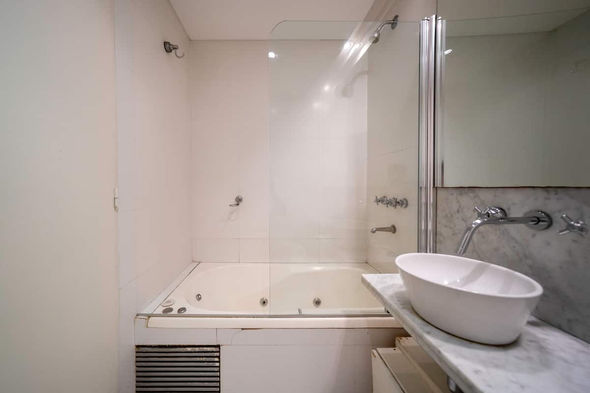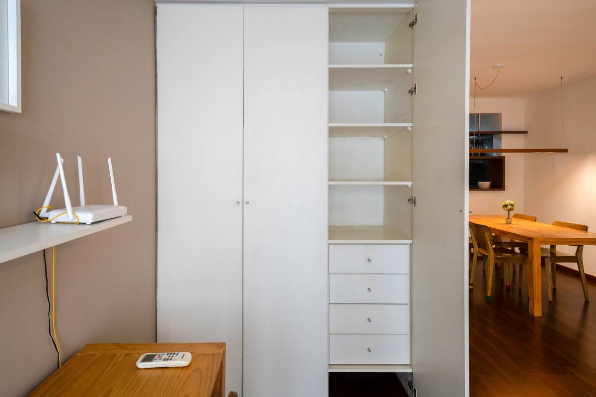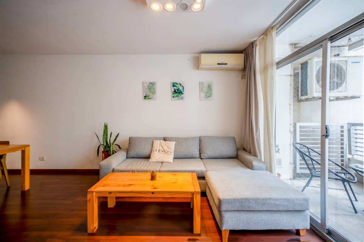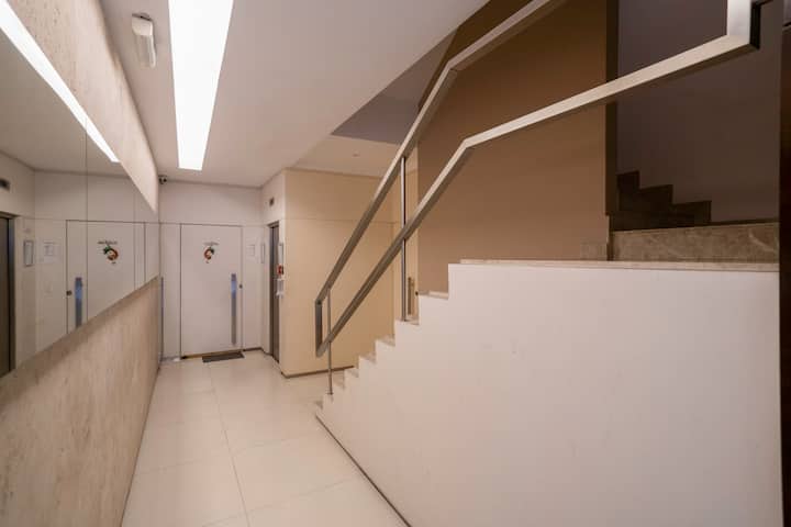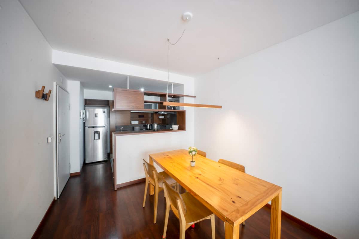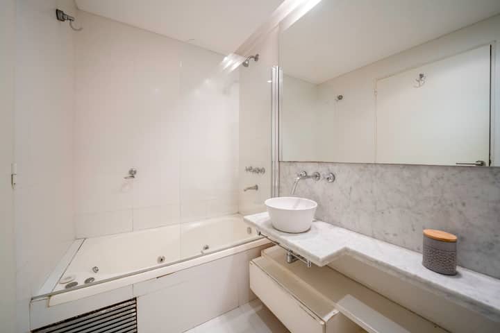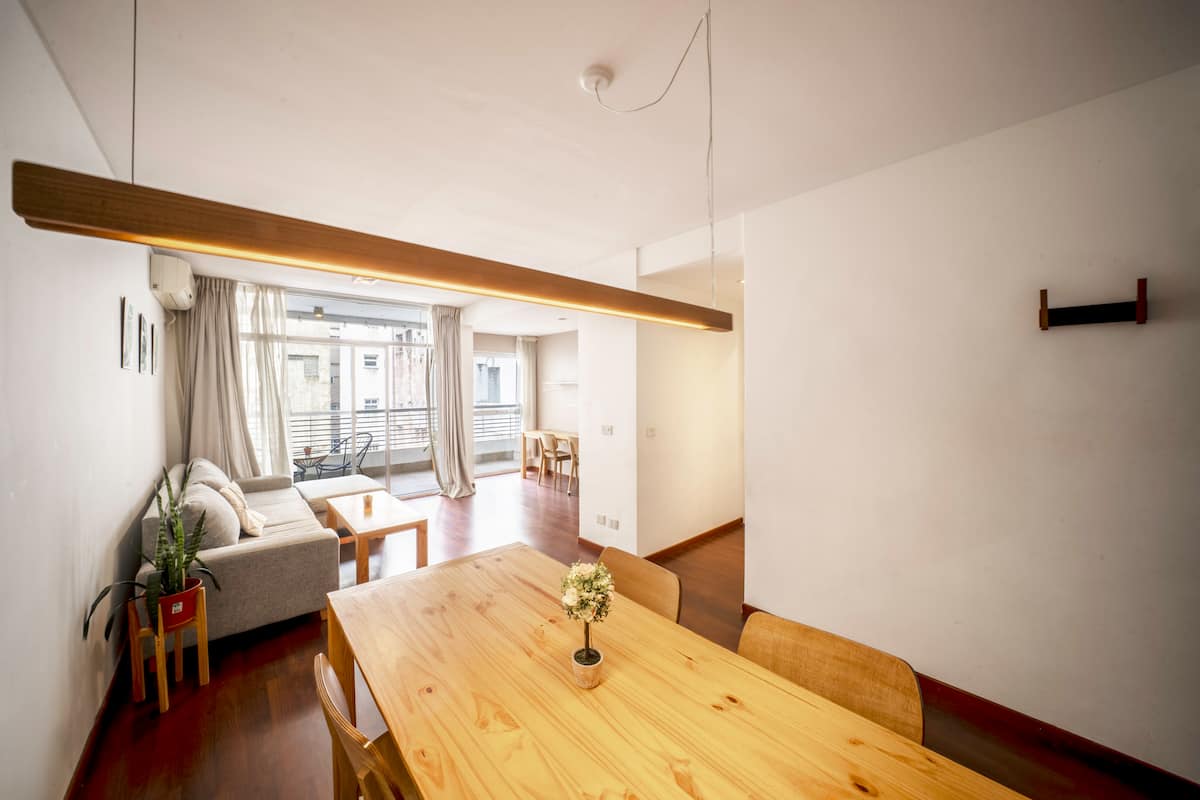 Two-room apartment in Recoleta, on the 4th floor and street-facing, with a balcony. It includes 1 bedroom, 2 full bathrooms, a fitted walk-in closet, a desk area, and a fully equipped kitchen with a washing machine. The building has a pool on the terrace and a resident manager.