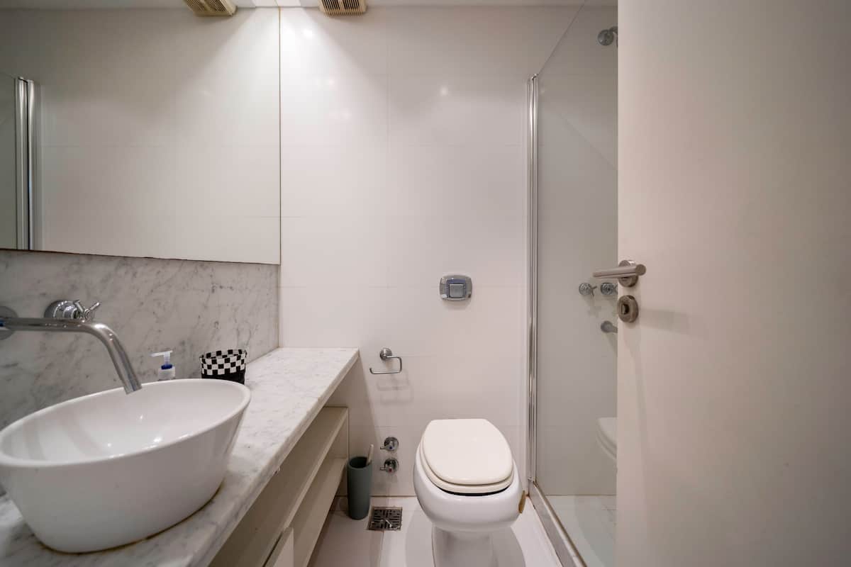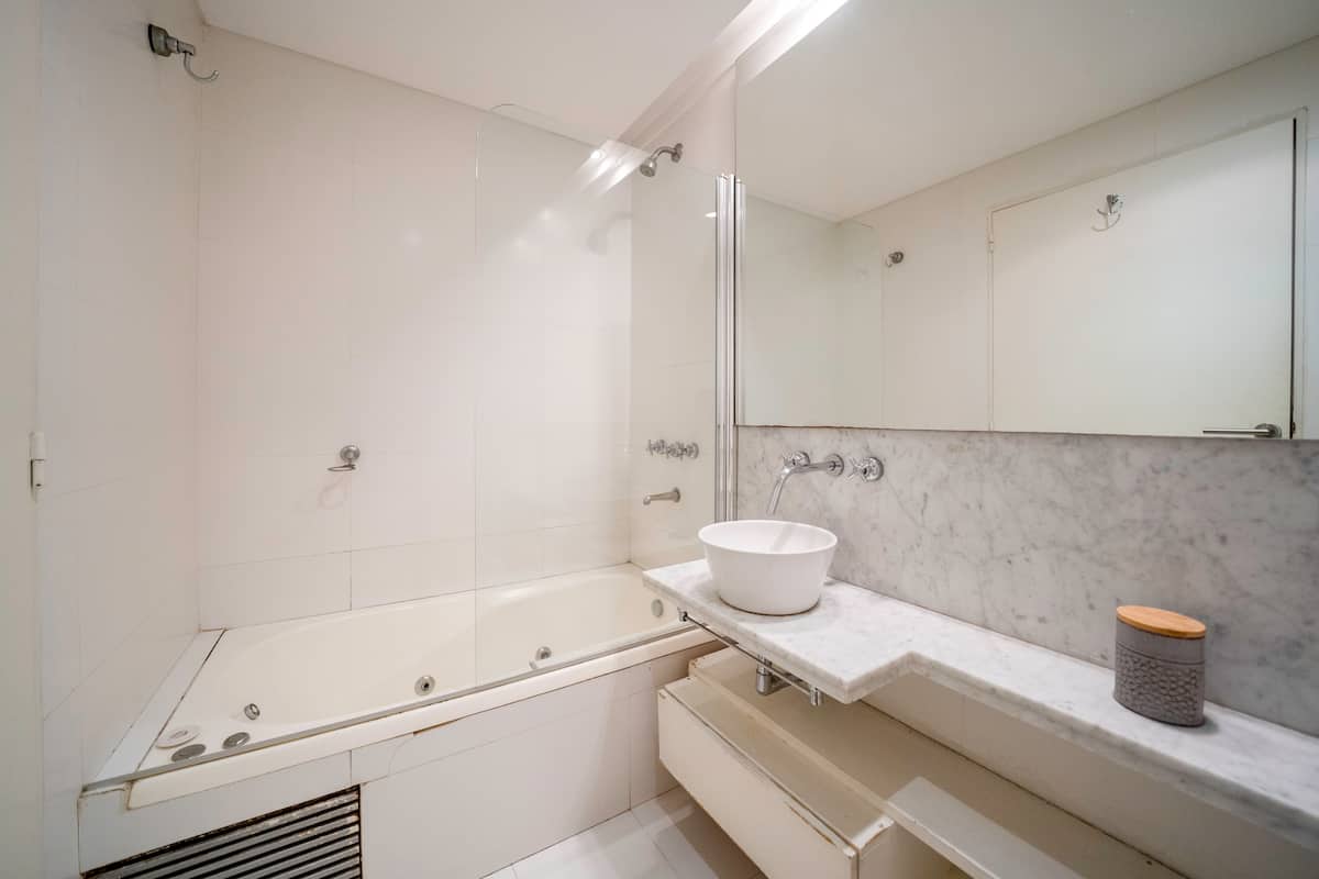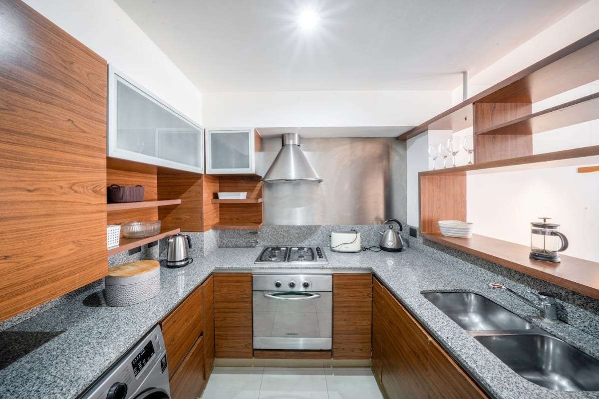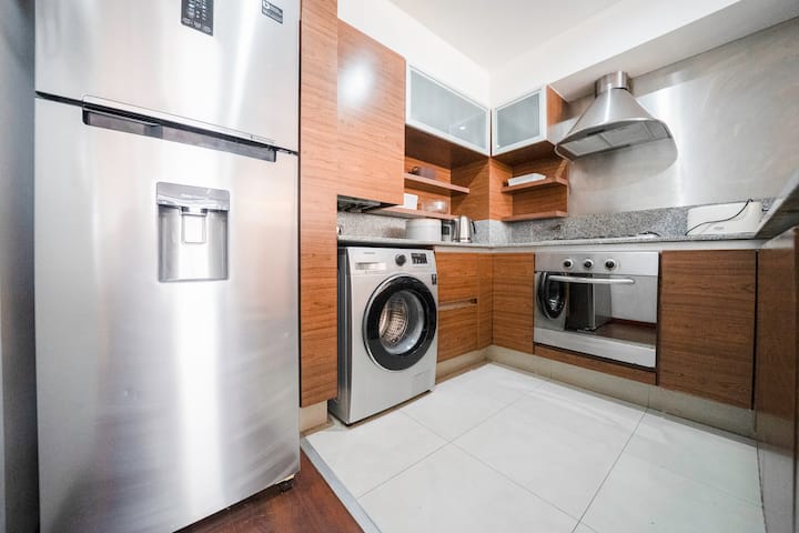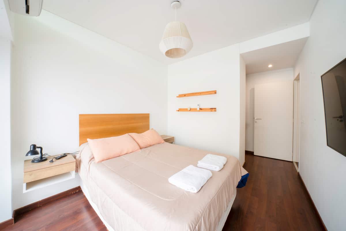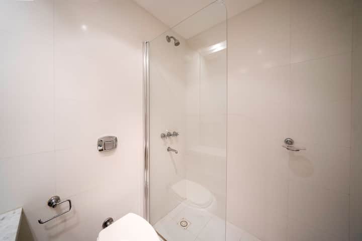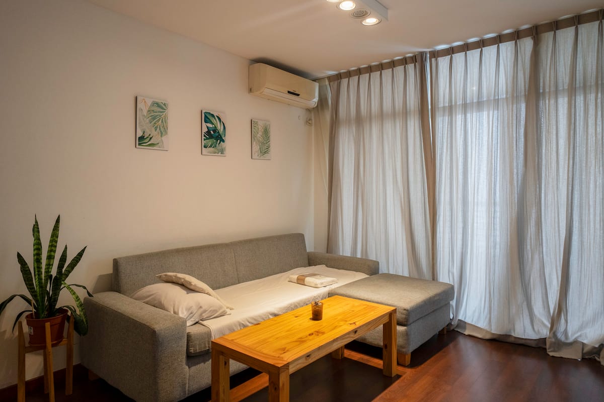 Two-room apartment in Recoleta, on the 4th floor and street-facing, with a balcony. It includes 1 bedroom, 2 full bathrooms, a fitted walk-in closet, a desk area, and a fully equipped kitchen with a washing machine. The building has a pool on the terrace and a resident manager.