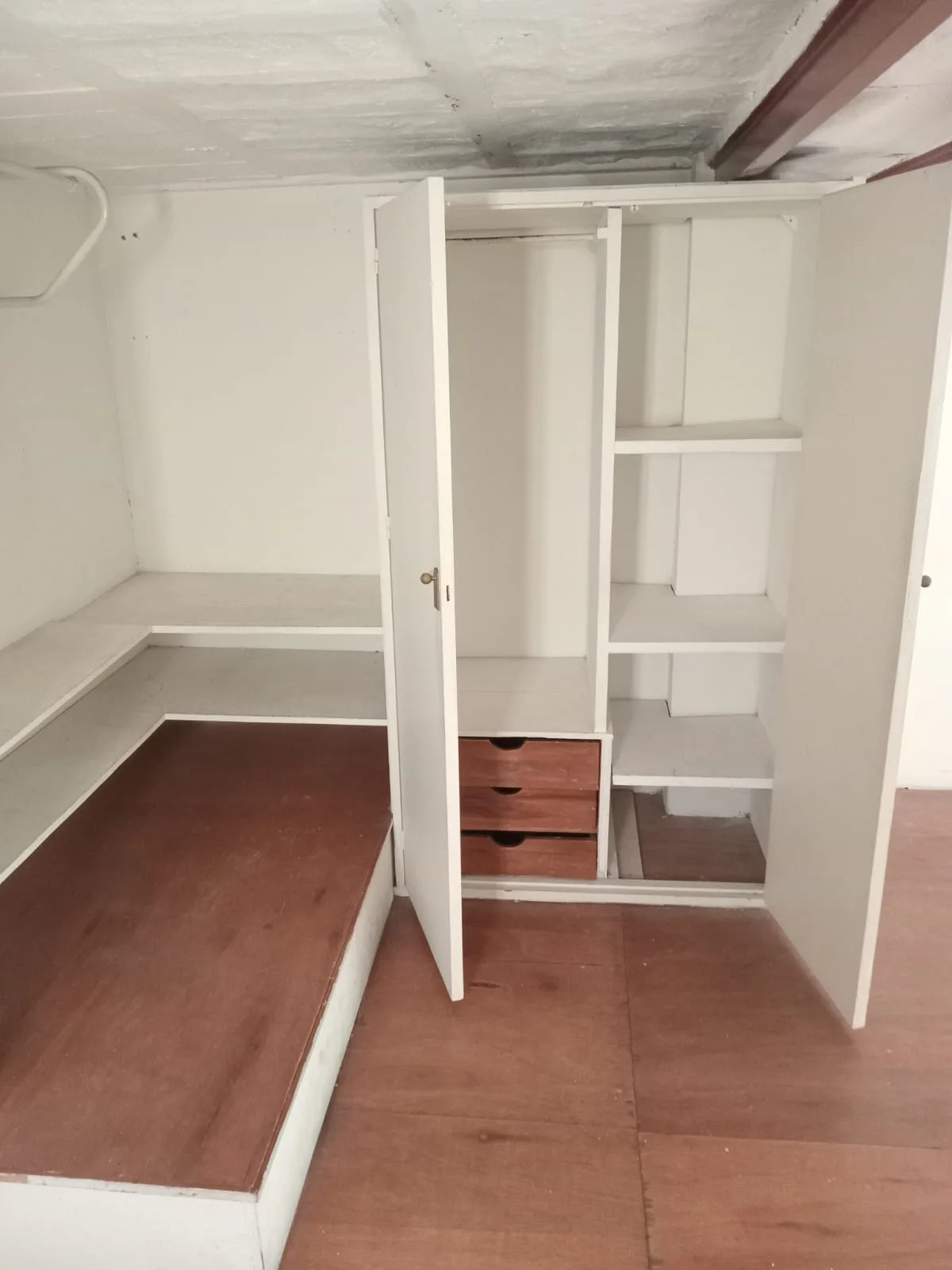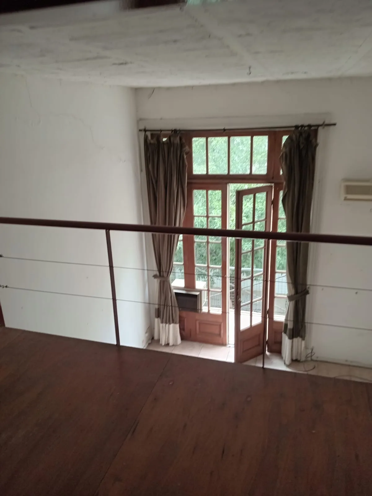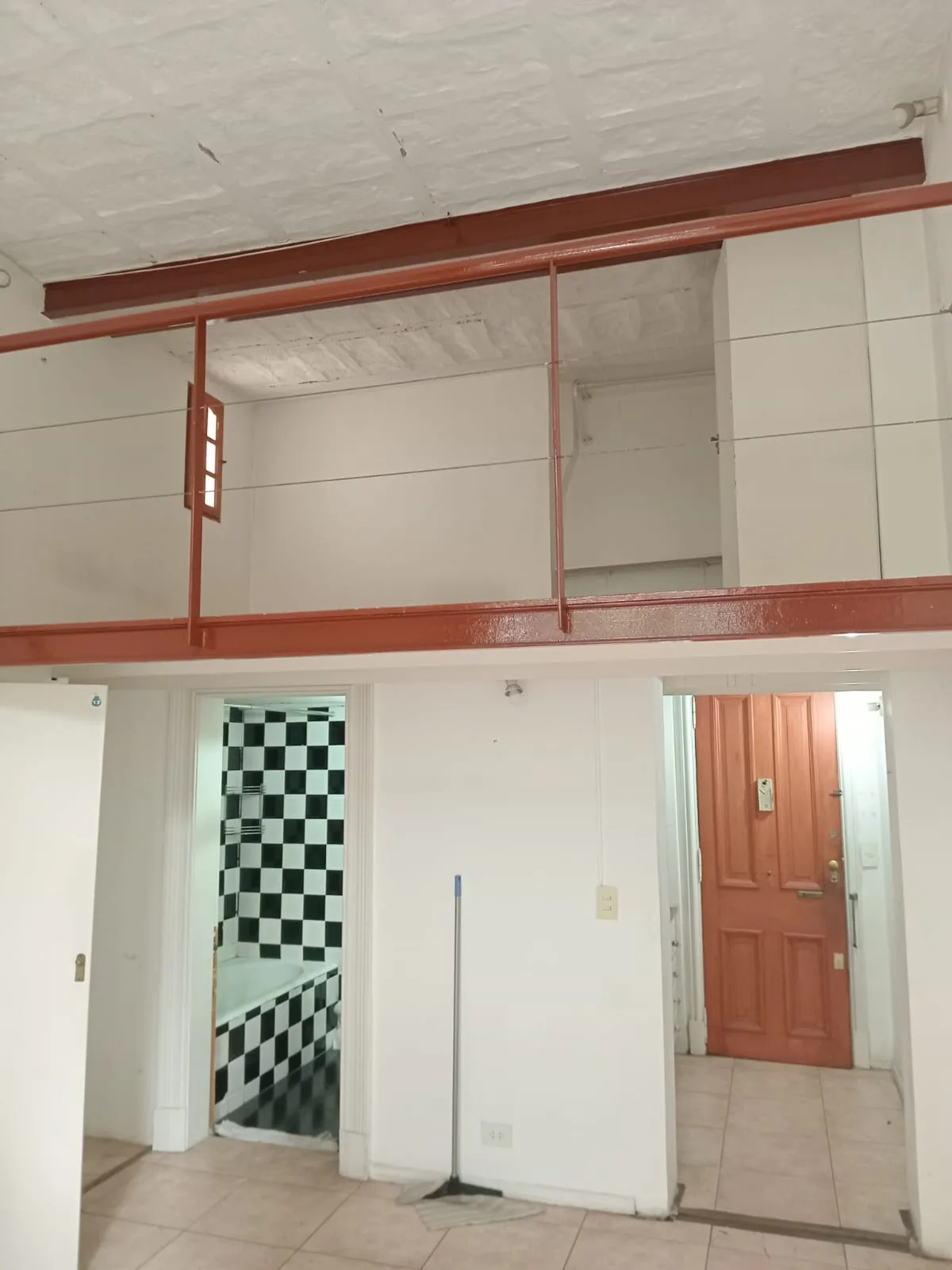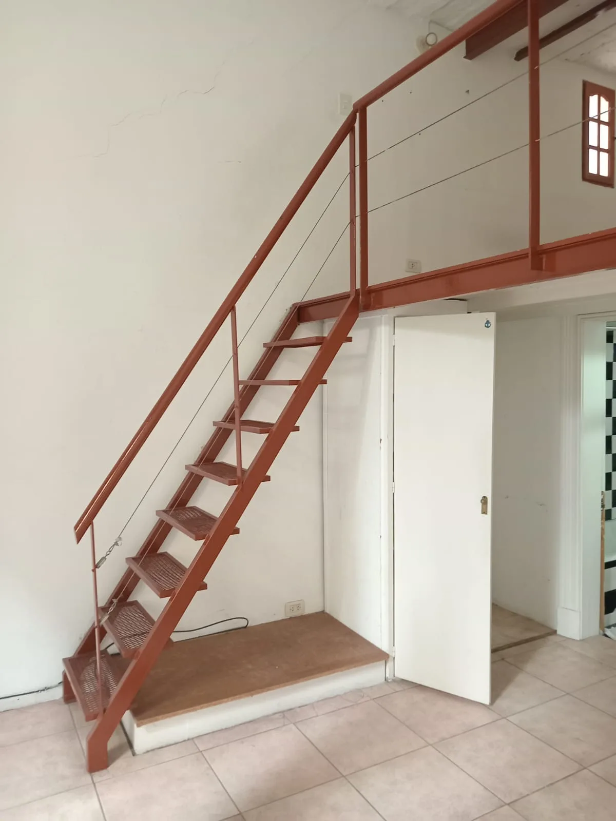 Loft apartment with mezzanine and a street-facing balcony in Recoleta, on the 2nd floor. 31 m² on the main level includes a balcony (2.5 x 1 m) with trees in view and a retractable awning. A 12 m² mezzanine (2 x 4 m) is used as a bedroom and has its own window plus built-in storage. It also has a full bathroom, a kitchenette in the entrance hall, and installed air conditioning. The building has a shared roof terrace with WiFi connection from the apartment. Metered street address is given as Urib