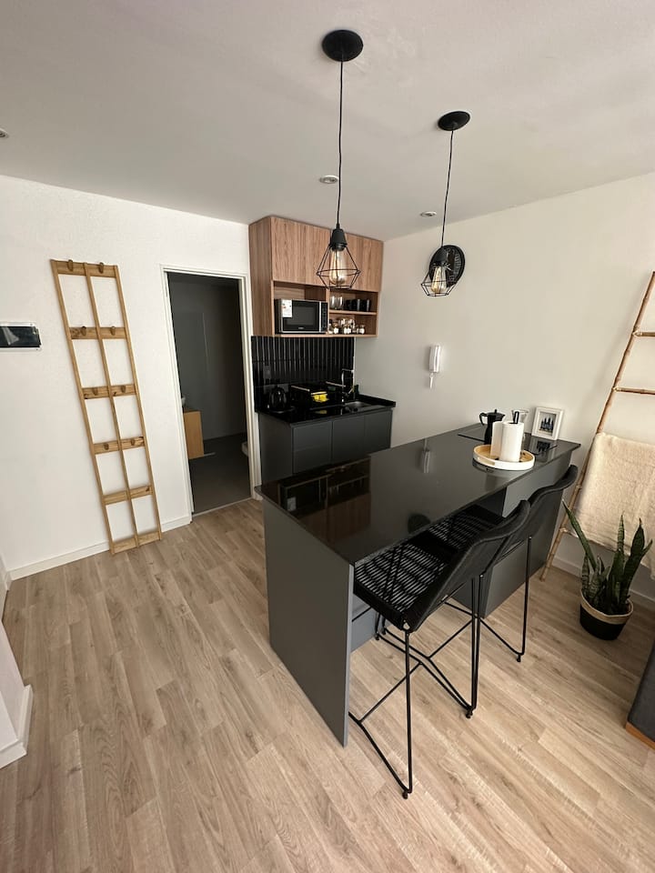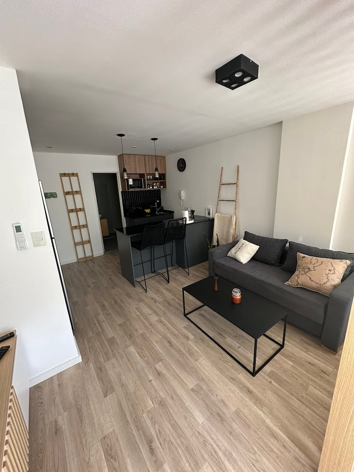 One-bedroom apartment in Retiro on Av. 9 de Julio with modern furnishings and a fully equipped setup. It includes high-speed Wi-Fi, hot-and-cold air conditioning, and a Smart TV with streaming service (Netflix). The kitchen is equipped with a microwave, coffee maker, toaster and electric kettle, and the bathroom includes toiletries and a hairdryer. Towels and bed linen are provided, and there is a queen-sized bed.