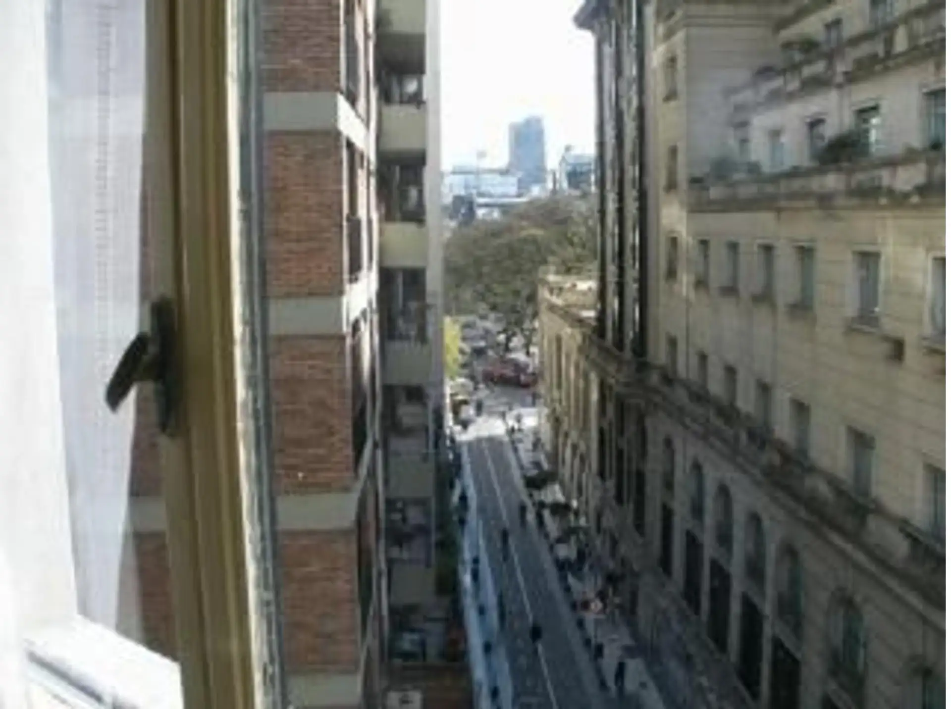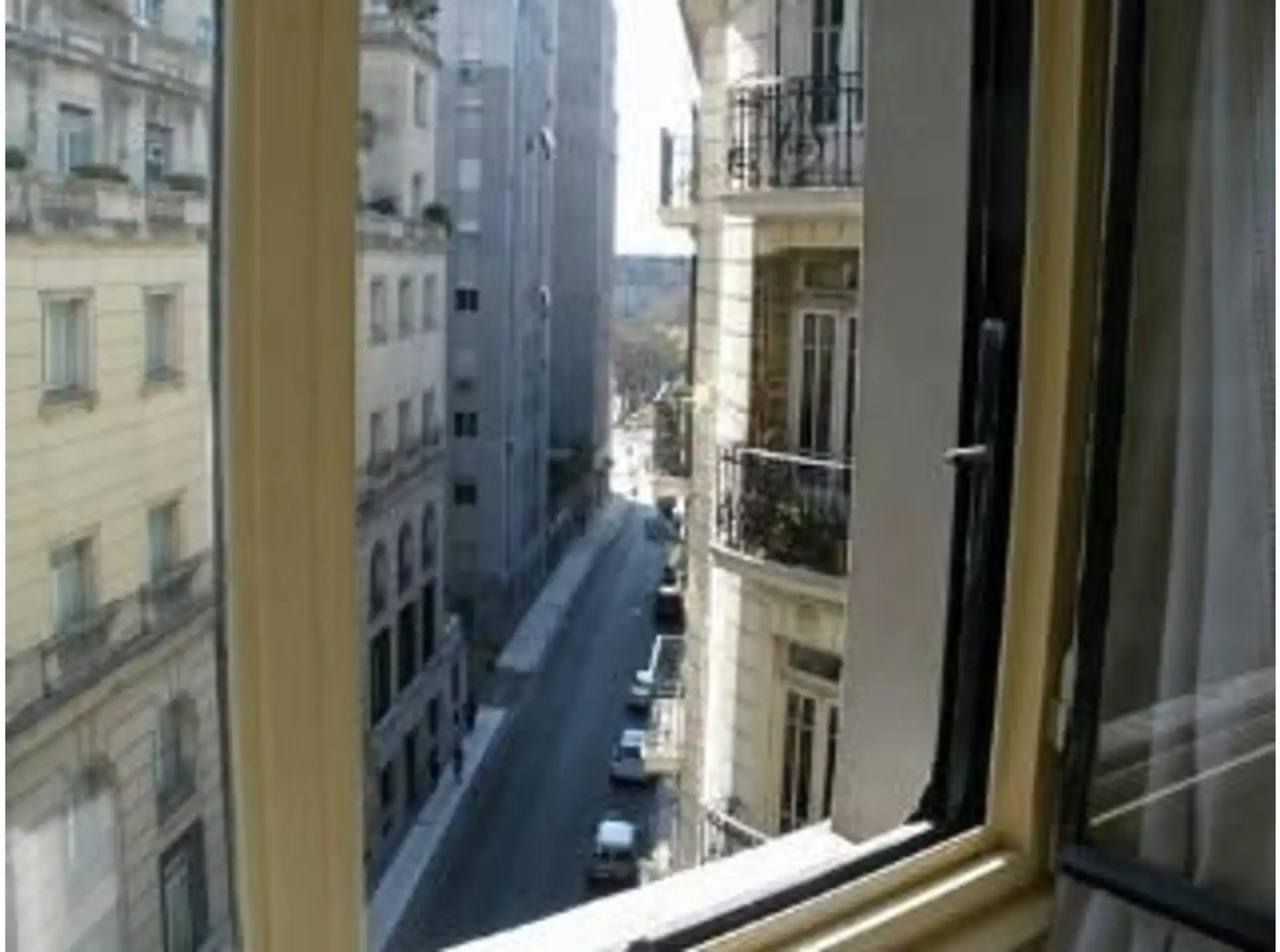 Two-room apartment of 36 m² on Calle San Martin between M.T.de Alvear and Paraguay, street-facing (all to the front) and NE-facing. It has 1 bedroom with a large built-in wardrobe, a kitchenette with mirrored upper-cabinet doors, and an en-suite full bathroom with marble flooring. Central heating via radiant slab, two air-conditioning units, and a landline telephone. From the bedroom in the corner (ochava), views include Hotel Plaza and Plaza San Martín.