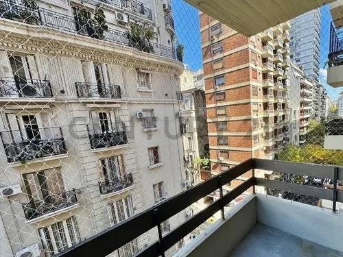 Apartment for rent with 74 m², street-facing, in Retiro. It has a living-dining room with a balcony, two bedrooms with built-in closets, a full bathroom with an exterior window, and a service toilet. The kitchen includes a laundry area and space for a dishwasher; the unit has hot-and-cold air conditioning in all rooms and a balcony with a view of greenery and French-style buildings. The building has a full-time caretaker, night security, and 24-hour closed-circuit cameras; the apartment has a re