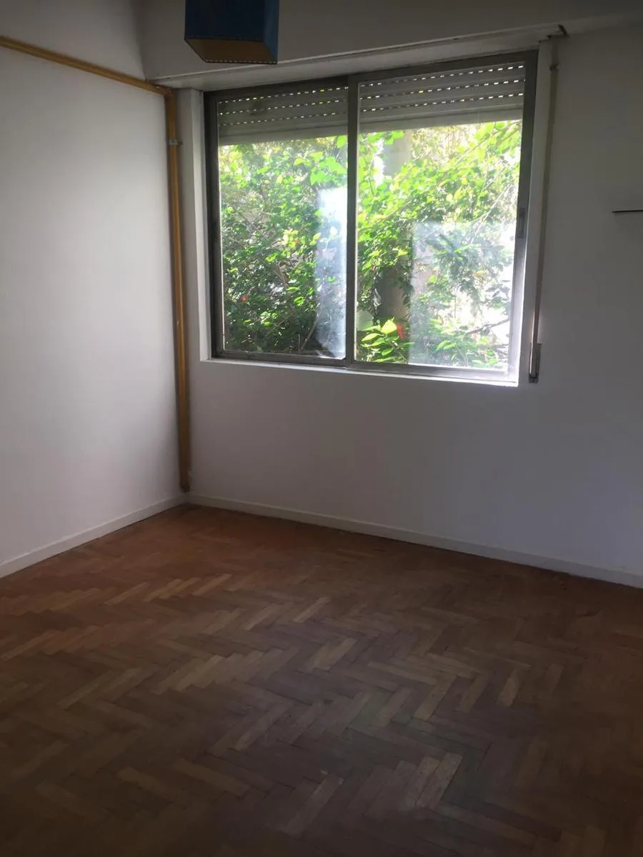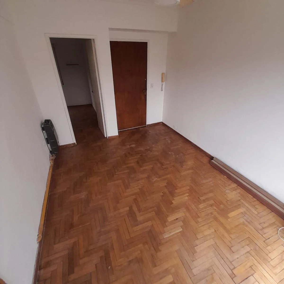 Studio apartment on the first floor accessed by stairs. The unit has a 4 m x 3 m living-dining area with a stove and a ceiling fan, a kitchen with a gas water heater (calefón), a 3 m x 3 m bedroom, and a full bathroom with a bathtub. Hardwood floors and freshly painted walls are listed; heating and a ceiling fan are included.