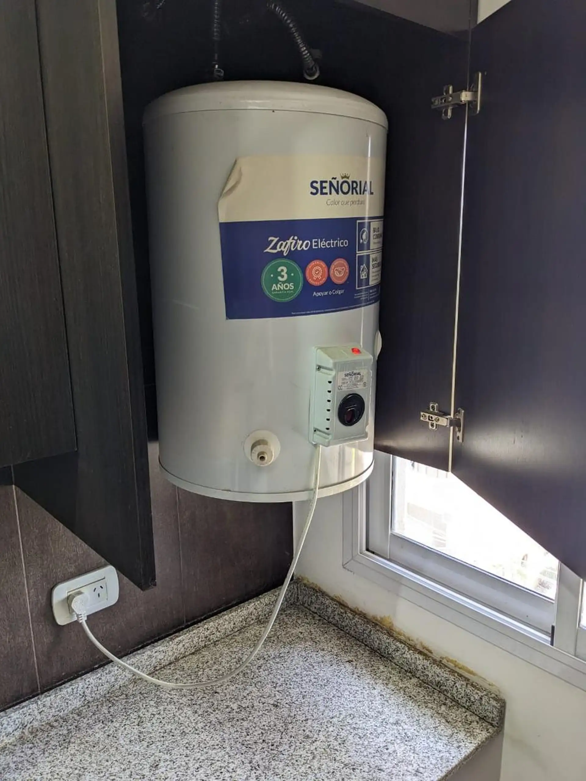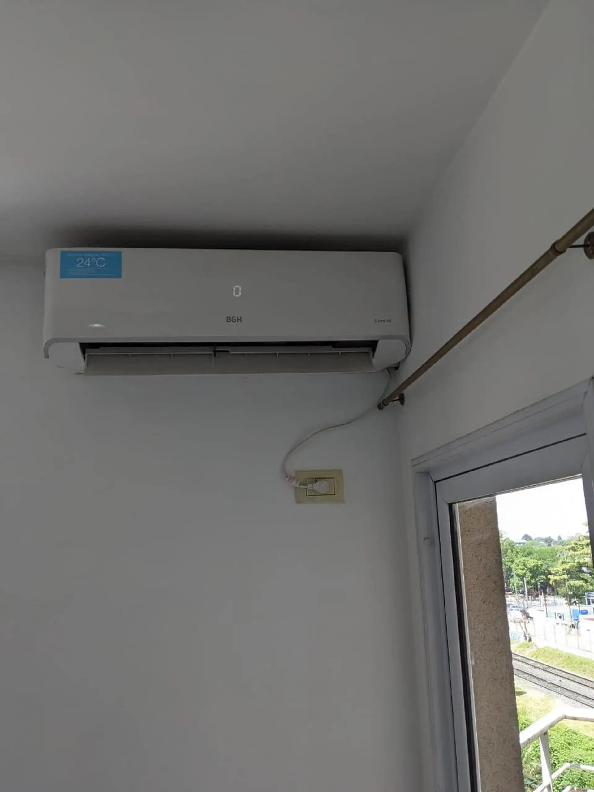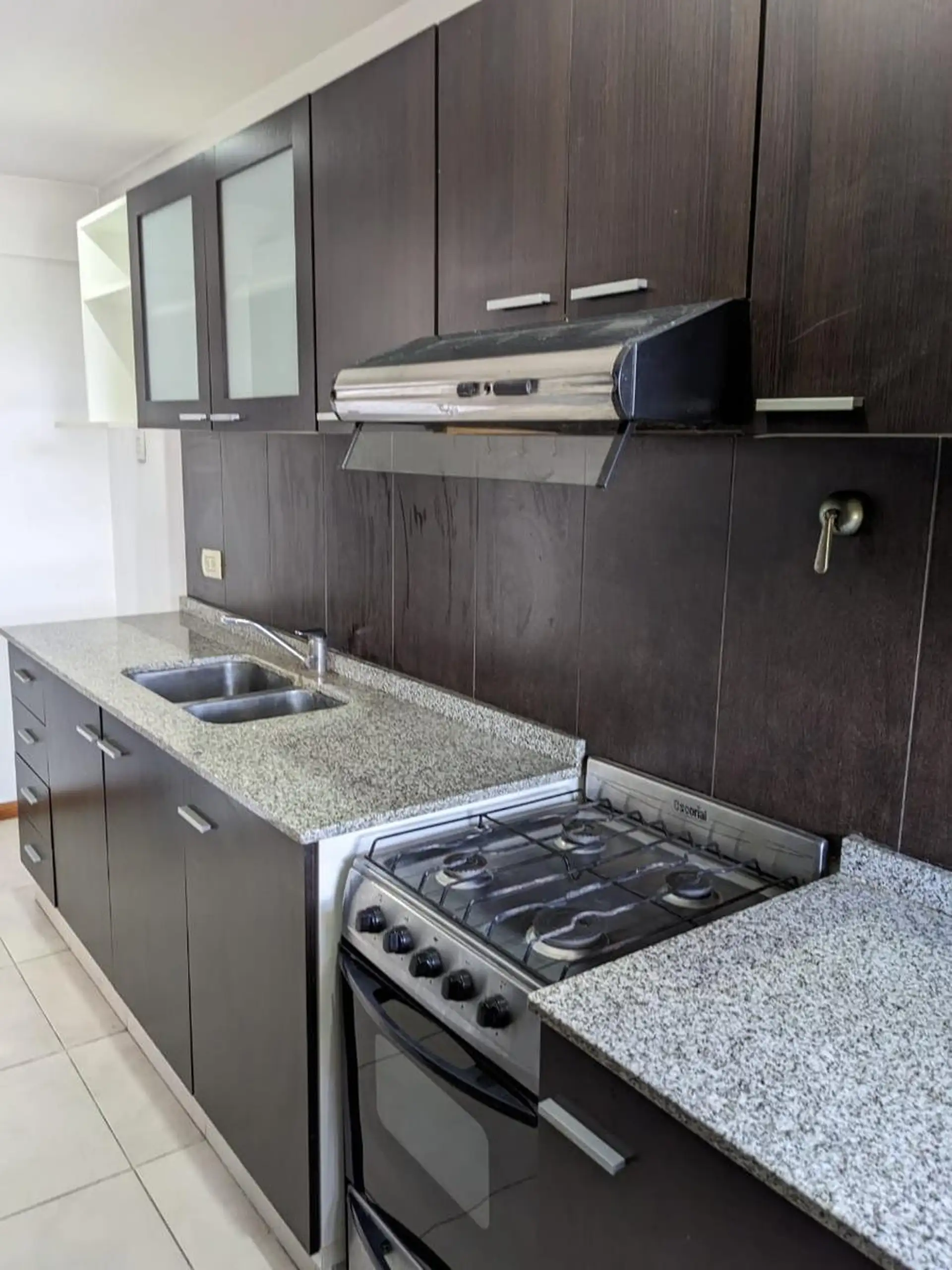 Two-room apartment with 46 m² covered area plus a balcony of nearly 3 m², street-facing with southeast orientation. It includes a living-dining room with direct access to the balcony, front-door security lock, and split air conditioning (hot/cold). The semi-integrated kitchen has granite worktop, four-burner stove with oven, air extractor, space for a refrigerator and washing machine, and a concealed electric water heater in the overhead cabinet; the bedroom is 9 m² with a built-in wardrobe and