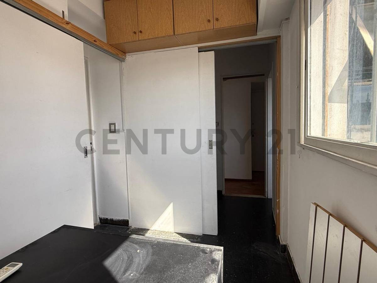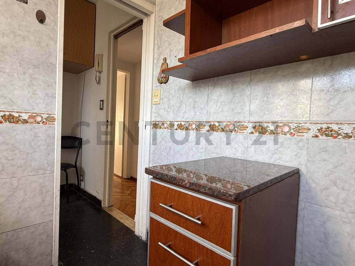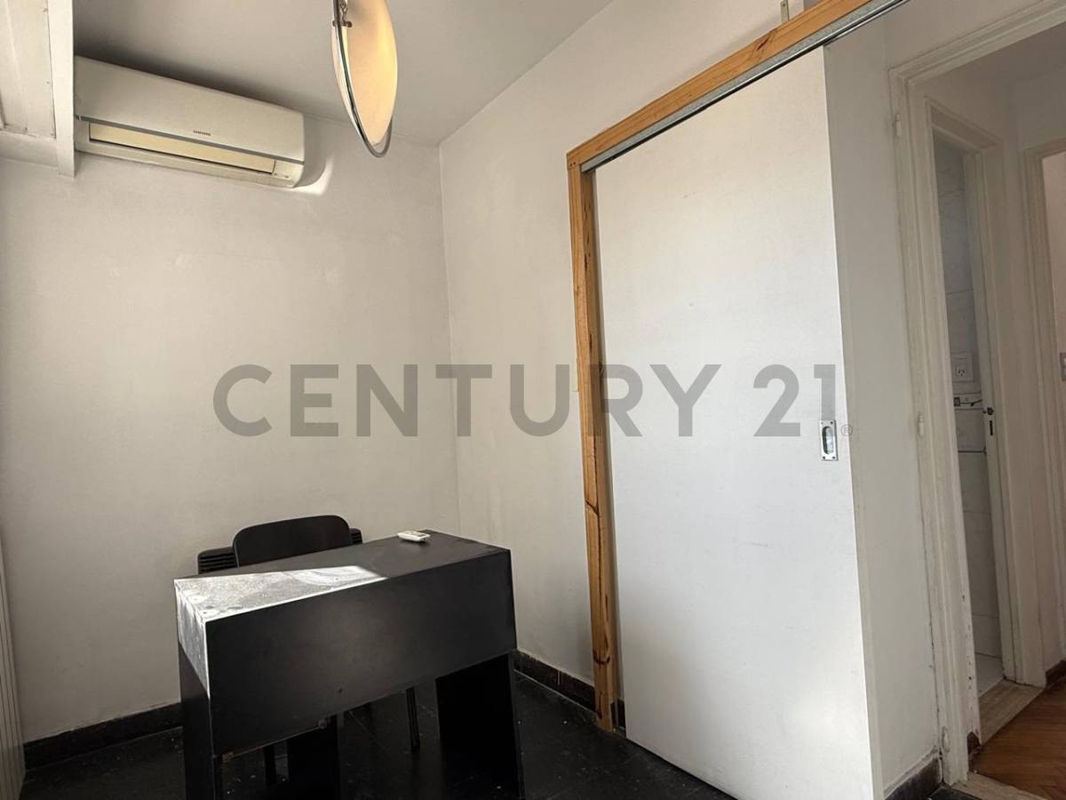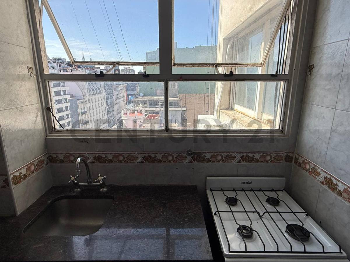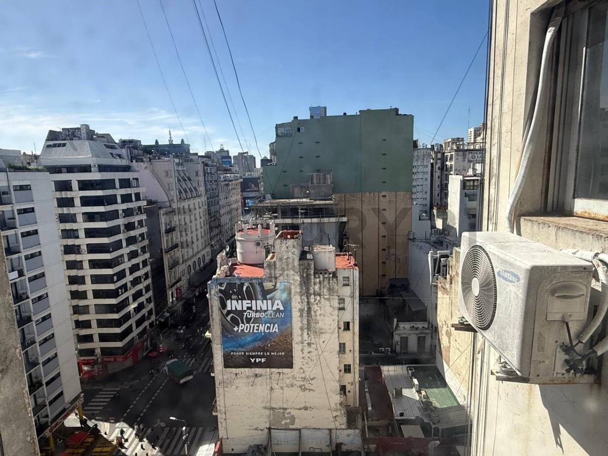 Two-room apartment on the 12th floor in San Nicolás, Buenos Aires, at Av. Corrientes 1250. Includes an entry hall with storage, a living-dining room with floor-to-ceiling window and lateral view, and one bedroom with built-in closet, lateral window and parquet flooring; both have air conditioning. There is an additional office/second bedroom or study connected to the kitchen via a living area, with gas heater; the kitchen has space for a washing machine and a fridge and a small front-facing wind