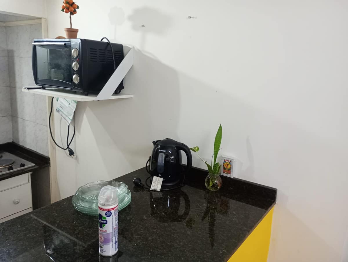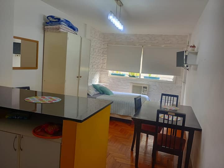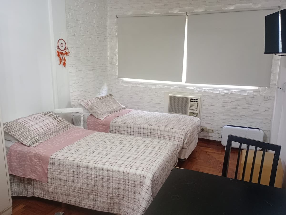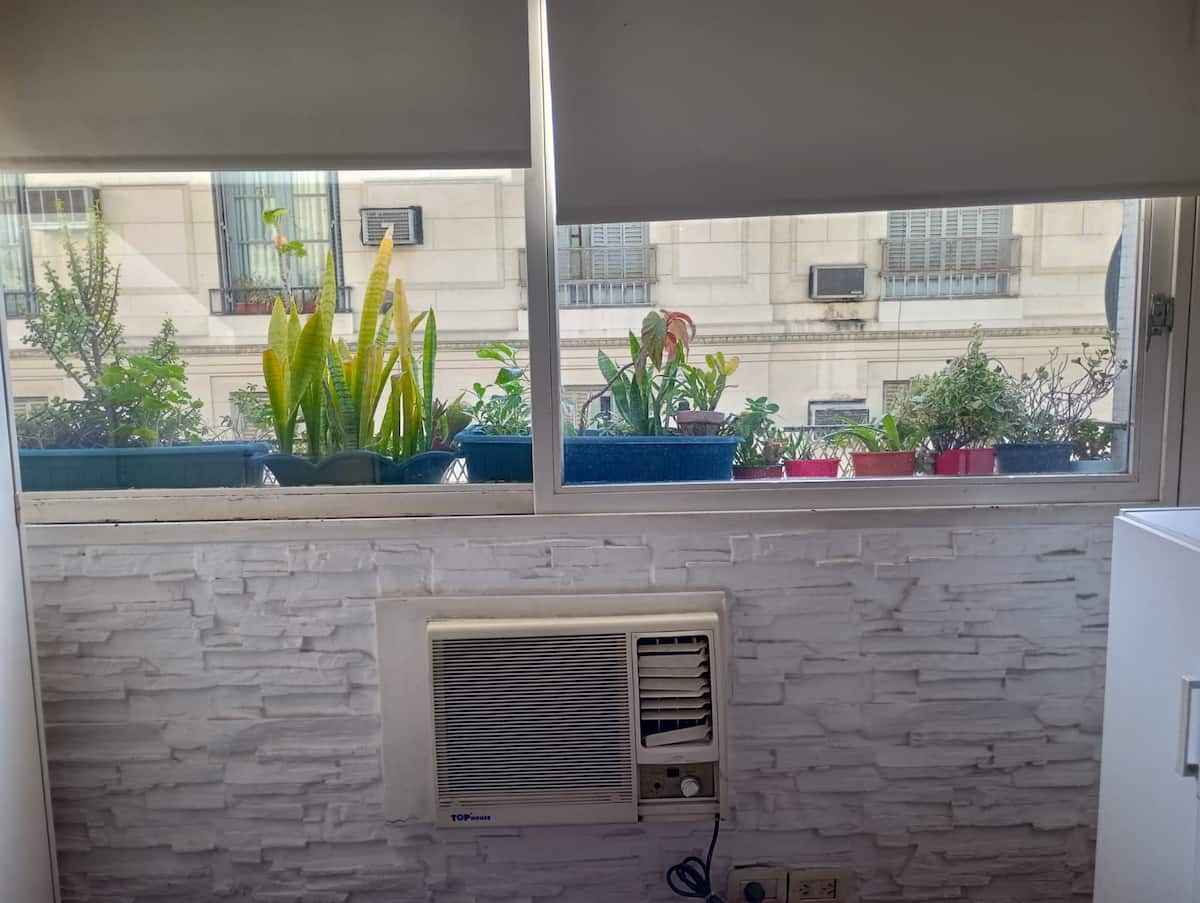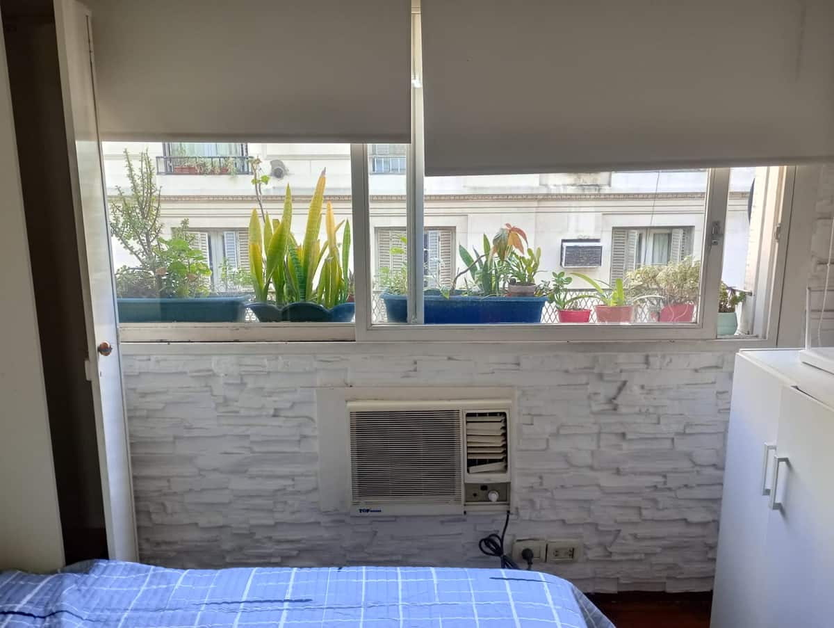 Apartment in Microcentro with a window on Esmeralda street. It has 1 bedroom and offers either 2 single beds or 1 double bed. Amenities include Smart TV, air conditioning, an electric oven and a refrigerator, a kitchen with 2 ovens, and a bathroom. Housewares for 4 people are provided, with sheets and towels for short stays only.