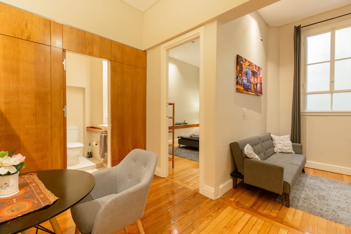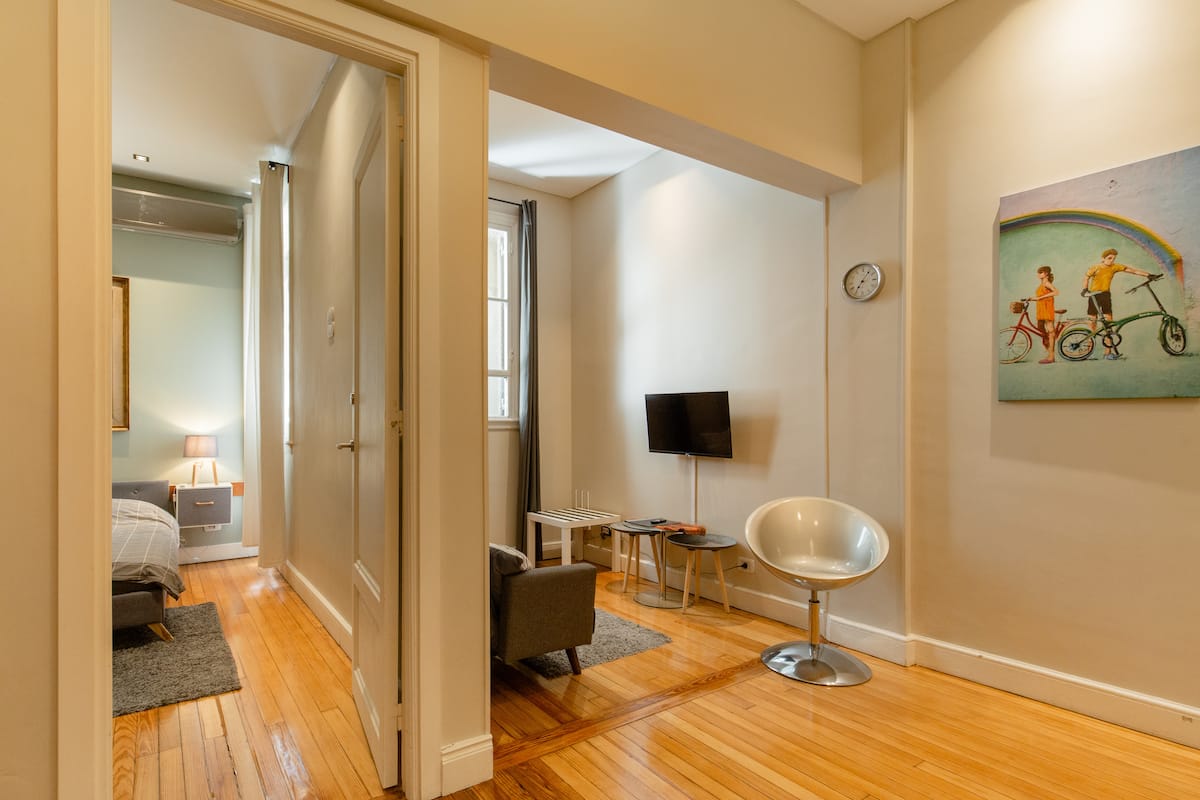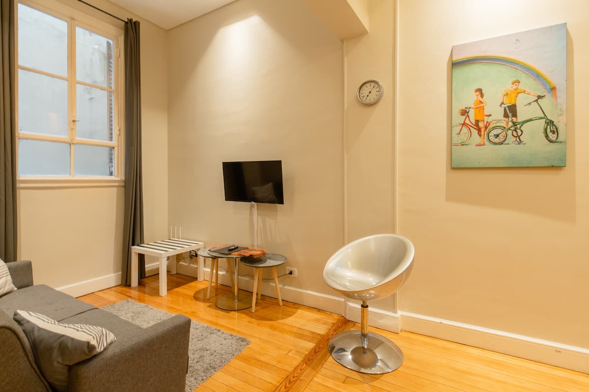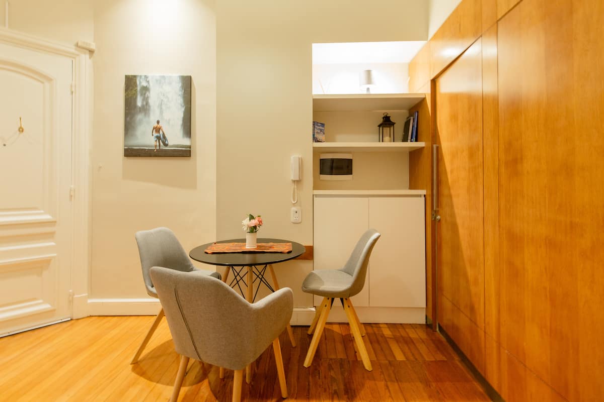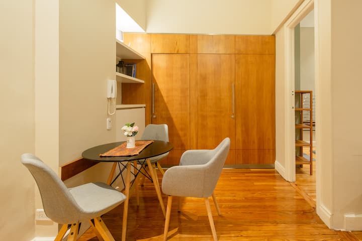 Apartment in central Buenos Aires, near Teatro Colón and 3 blocks from Obelisco. The building has ground-floor laundry facilities and provides high-speed fibre-optic internet. The apartment is about 2 blocks from Subte Line D and Line B, with access to buses across the city.