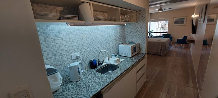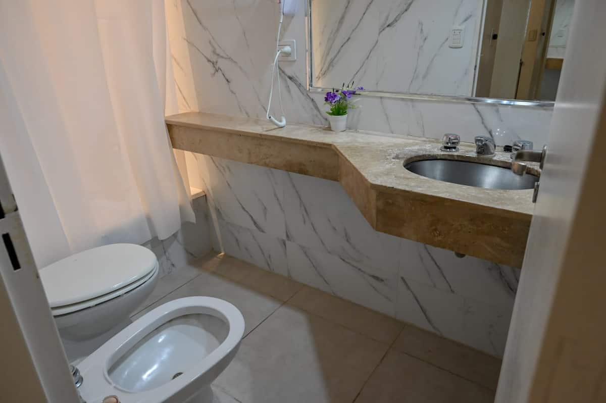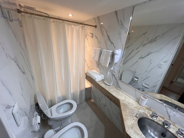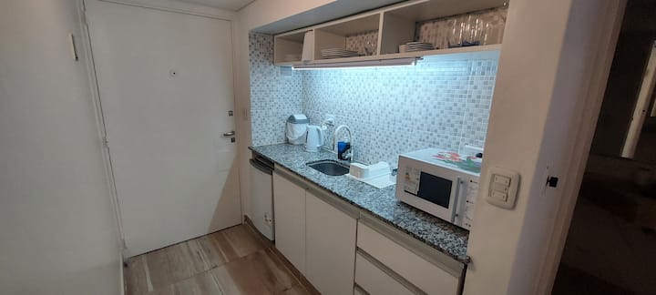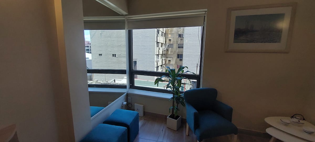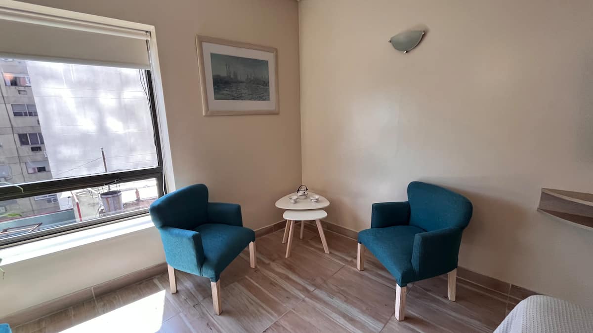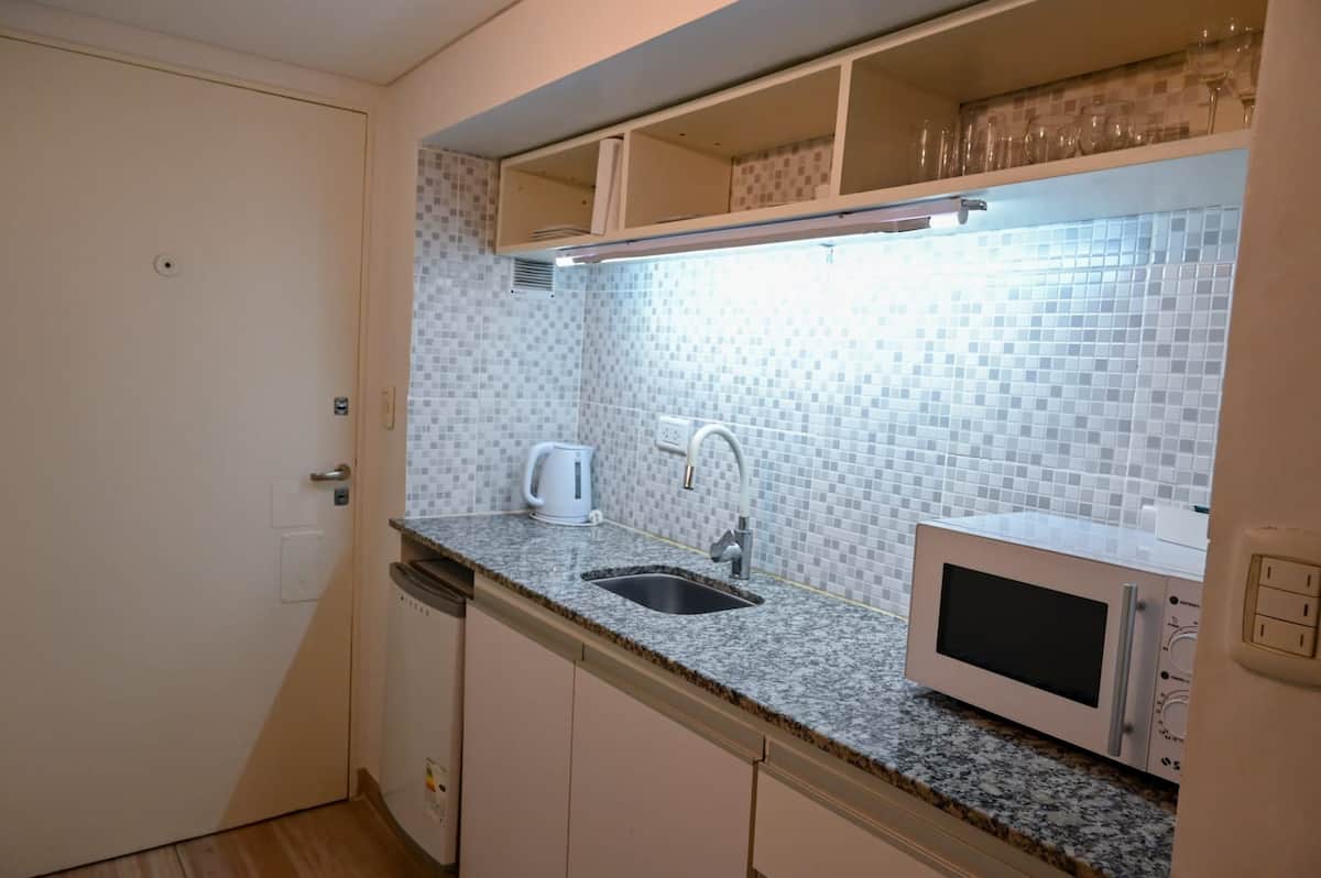 Apartment in Buenos Aires Centre, a few metres from Obelisco on Av. Corrientes. It is located next to Teatro Colón, in front of Gran Rex, and about 8 blocks from Puerto Madero. One full bathroom with bathtub and a vanity with countertop and sink; a large mirror. Living room is integrated into the room. The rental does not include a hotel service room. Amenities include TV, WiFi, air conditioning and central heating.