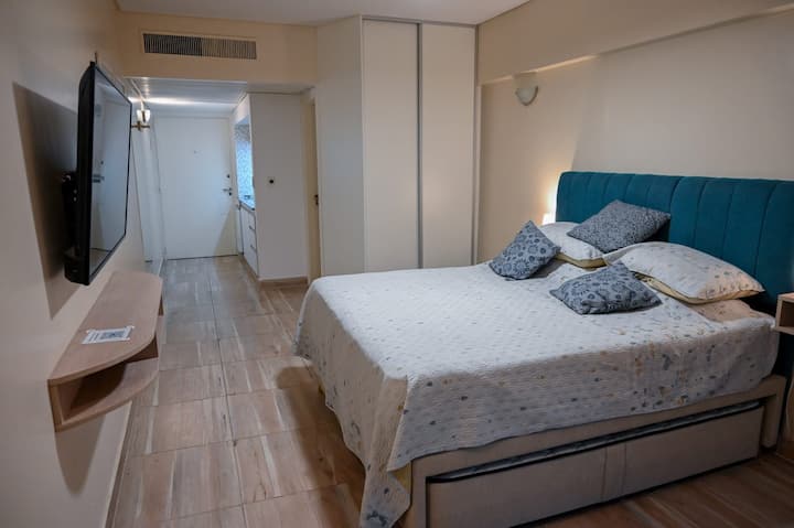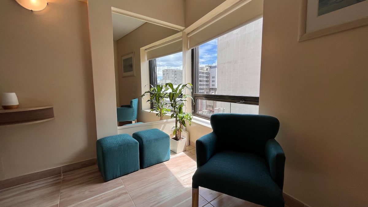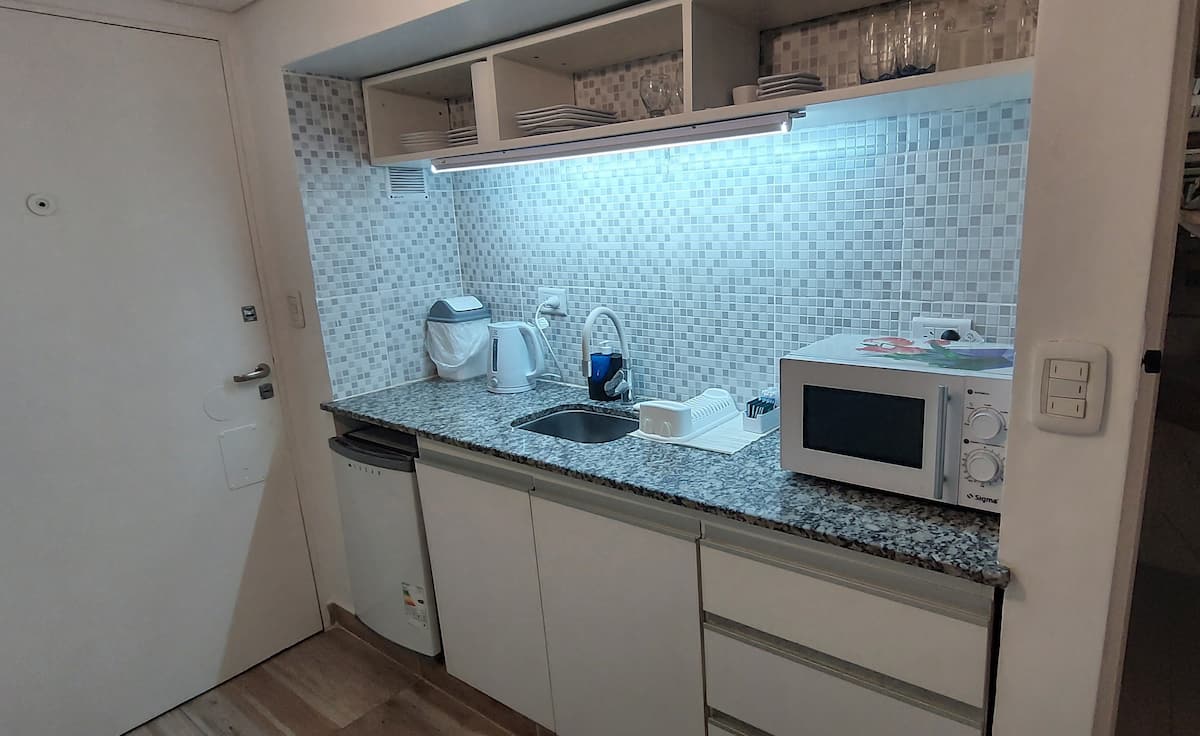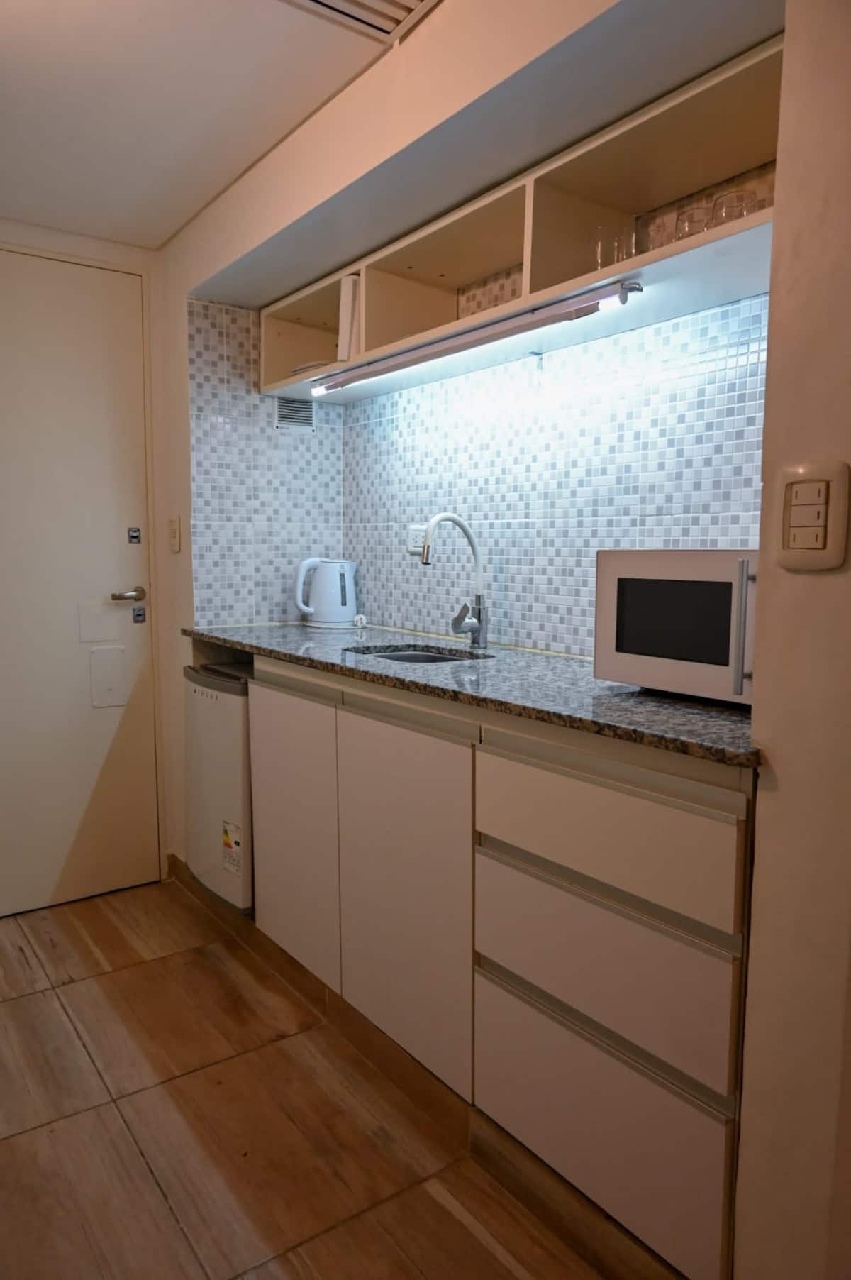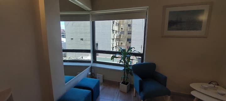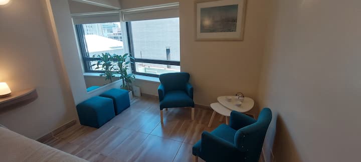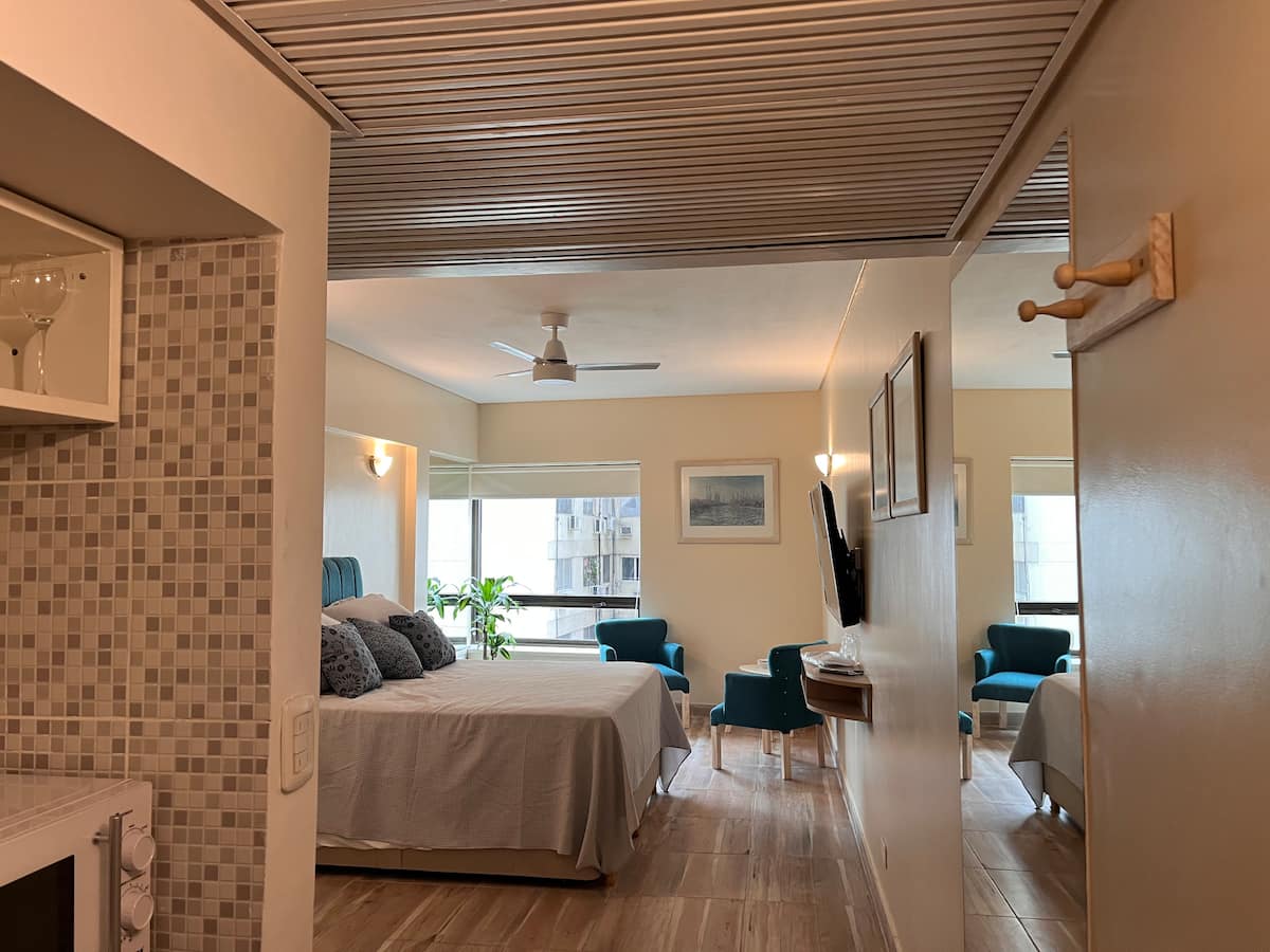Apartment in Buenos Aires Centre, a few metres from Obelisco on Av. Corrientes. It is located next to Teatro Colón, in front of Gran Rex, and about 8 blocks from Puerto Madero. One full bathroom with bathtub and a vanity with countertop and sink; a large mirror. Living room is integrated into the room. The rental does not include a hotel service room. Amenities include TV, WiFi, air conditioning and central heating.