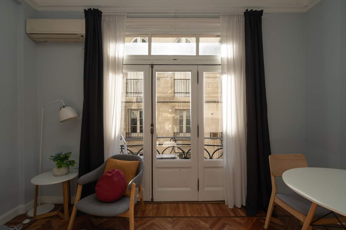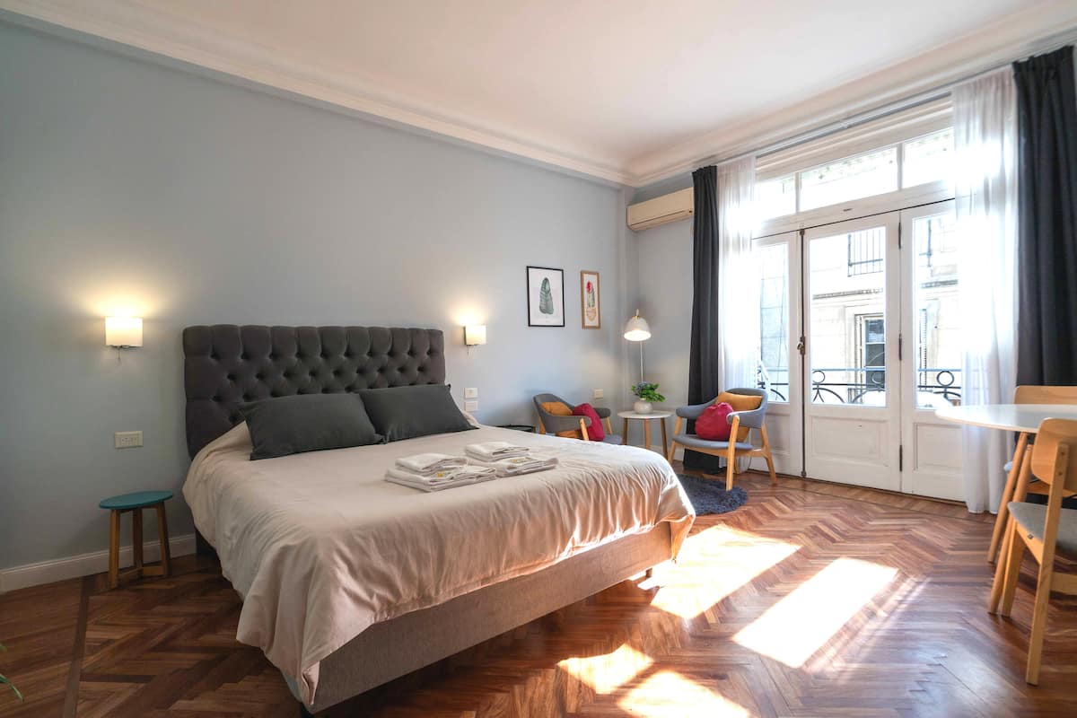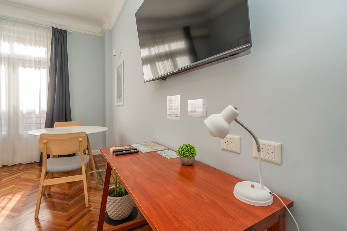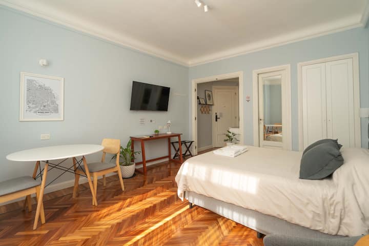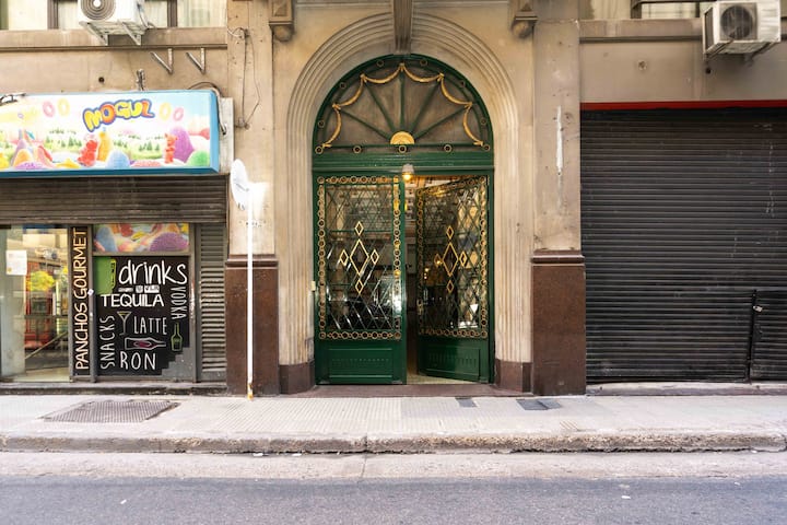 Apartment in San Nicolás in a building constructed in 1928 by French architect Edouard Stanislas Louis Le Monnier. The listing describes an imposing entrance hall and an art gallery in the building’s subsoil. It is located 200 metres from Teatro Colón and 300 metres from the Obelisk. The apartment is described as bright, with front windows, an integrated kitchen with a dining area, and a bedroom with a king-size bed and Smart TV in the living room.