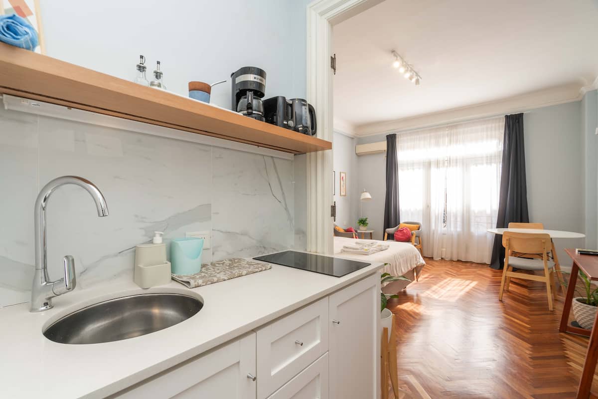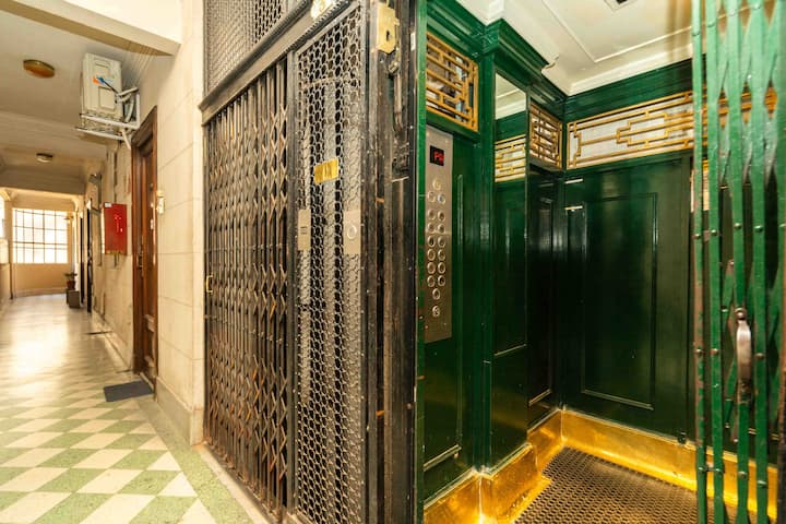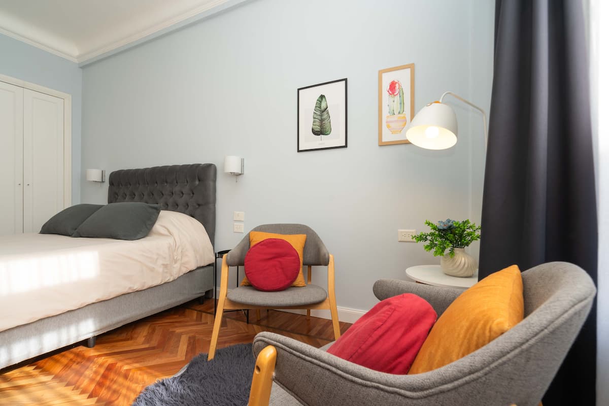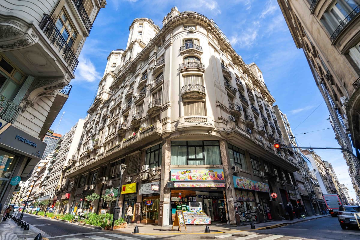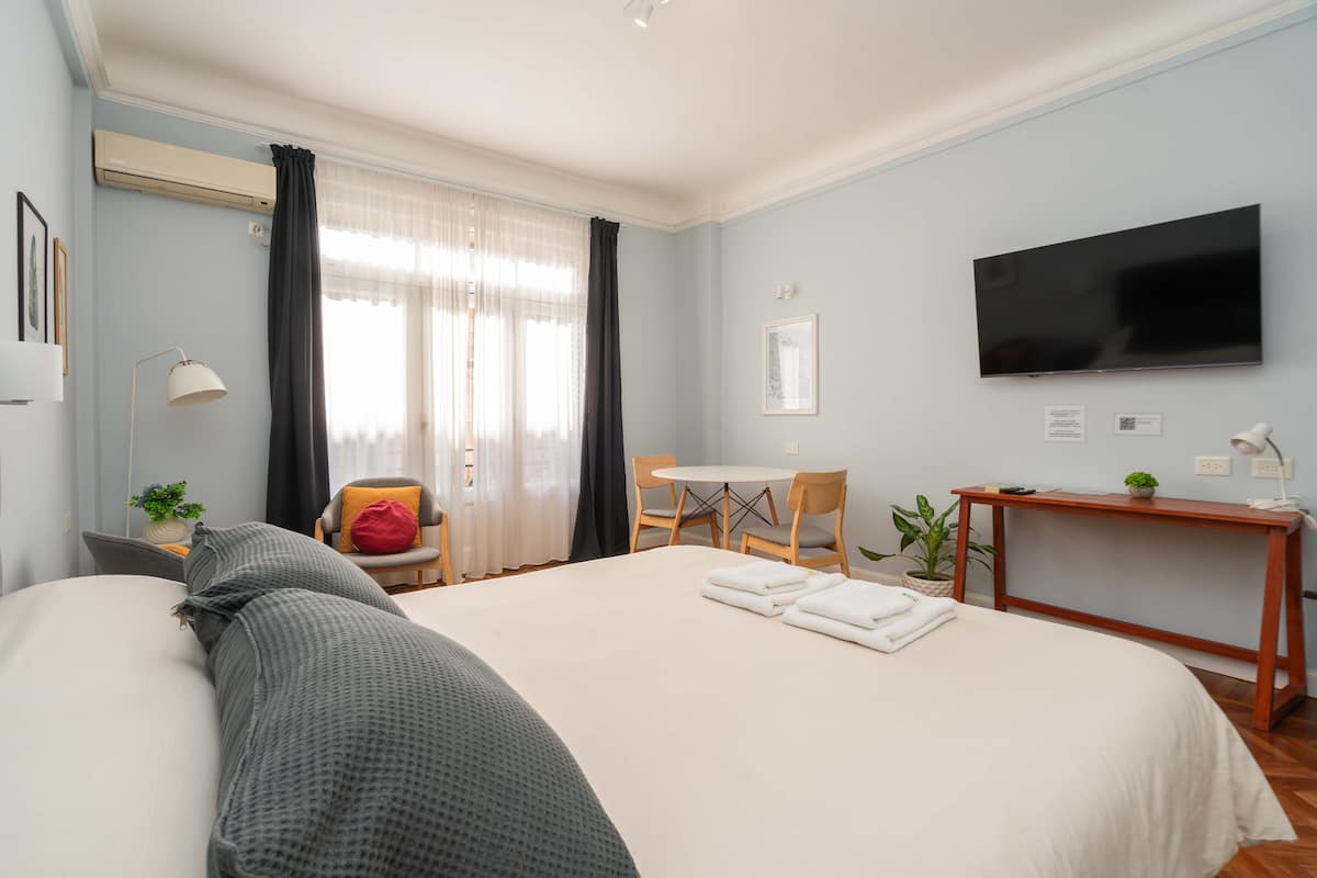 Apartment in San Nicolás in a building constructed in 1928 by French architect Edouard Stanislas Louis Le Monnier. The listing describes an imposing entrance hall and an art gallery in the building’s subsoil. It is located 200 metres from Teatro Colón and 300 metres from the Obelisk. The apartment is described as bright, with front windows, an integrated kitchen with a dining area, and a bedroom with a king-size bed and Smart TV in the living room.