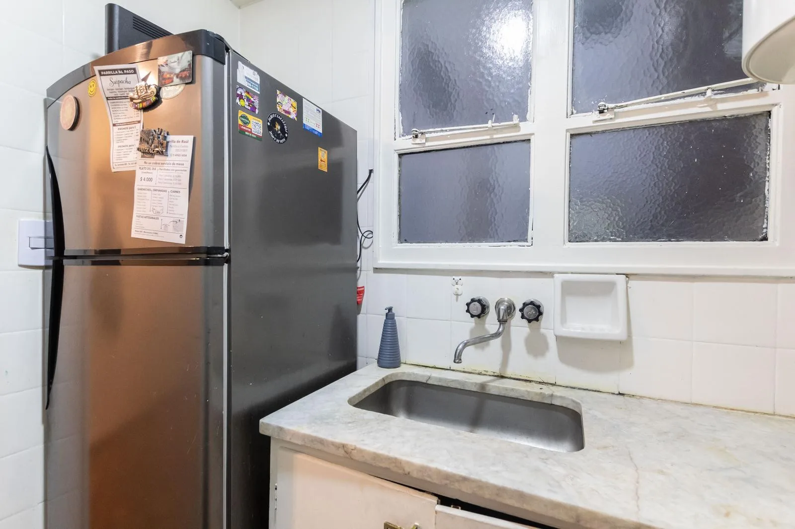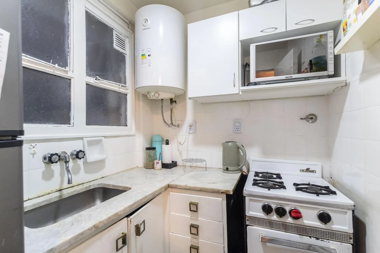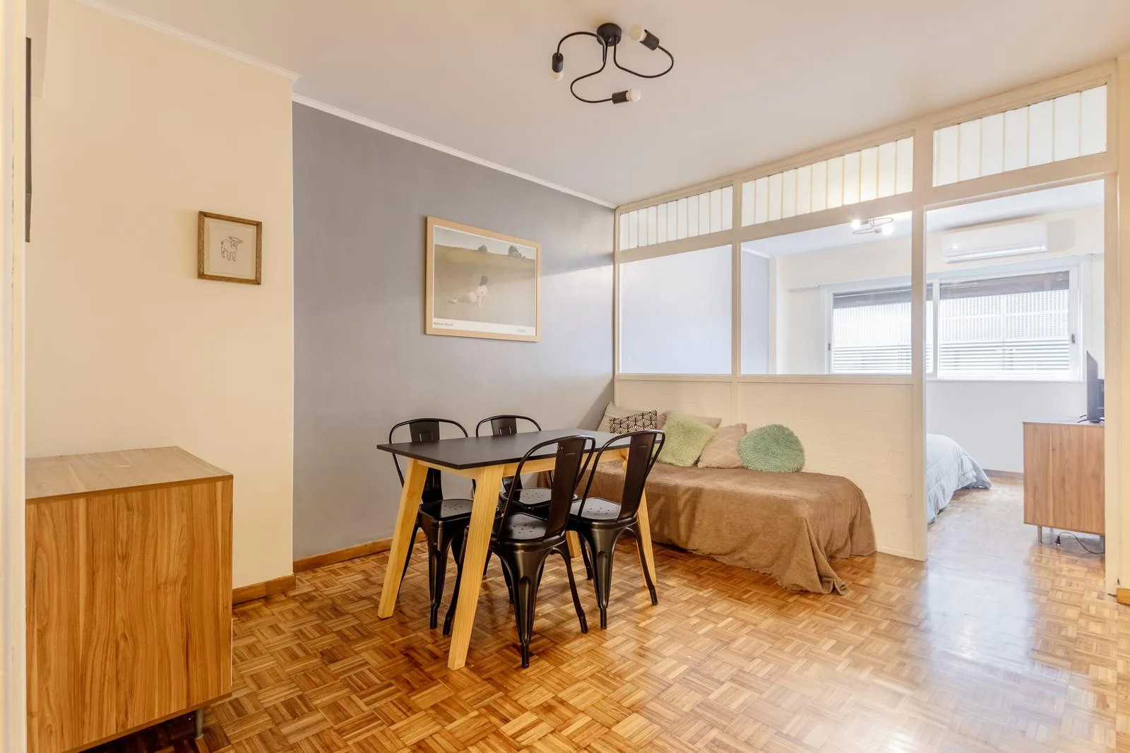 Furnished studio apartment at the front of the building in San Nicolás, on Maipú at 300. Available from 1 May. Street-facing with an interior layout split into two areas for separation. Independent gas kitchen, hot-water tank, split air-conditioning (hot/cold), double-surface wood flooring, and TV and internet. Fridge and microwave, tableware, and a 2-plaza bed plus two single beds. Minimum rental term: 3 months. Rent: USD 500; payment can be made in pesos.