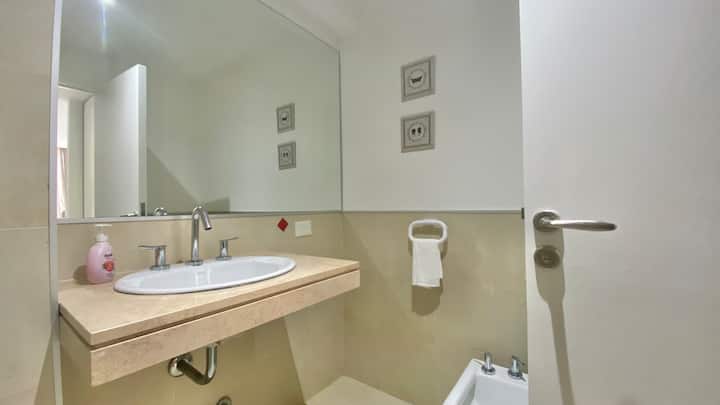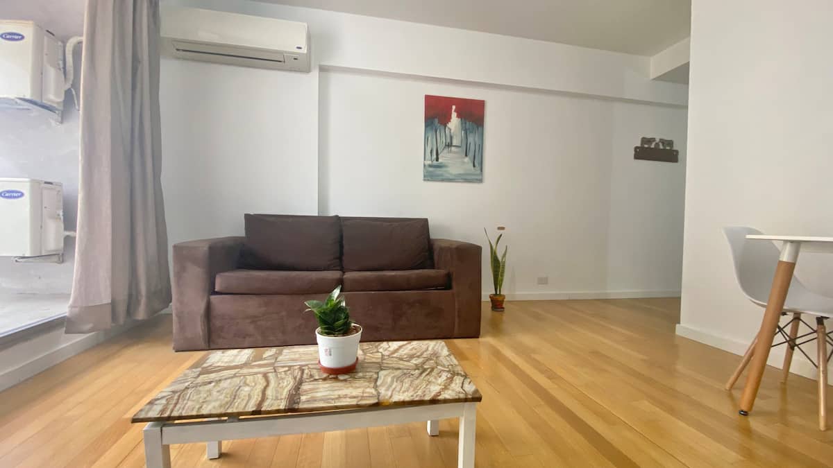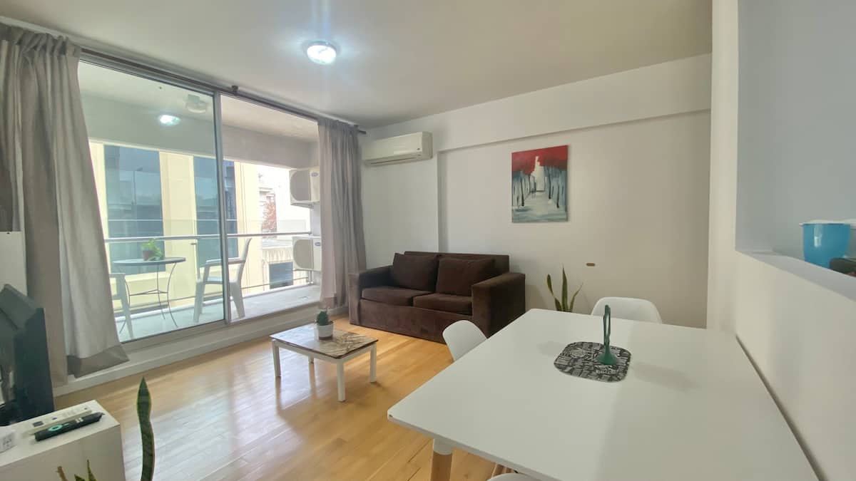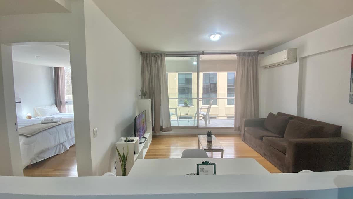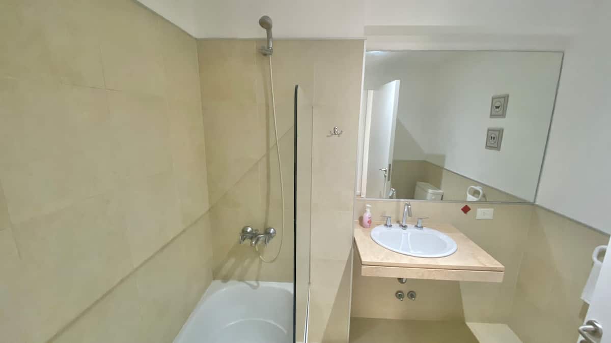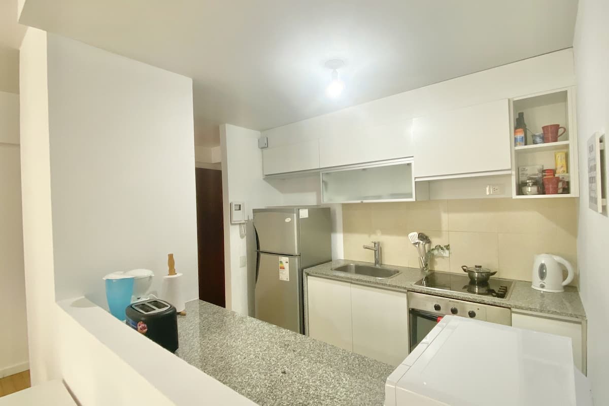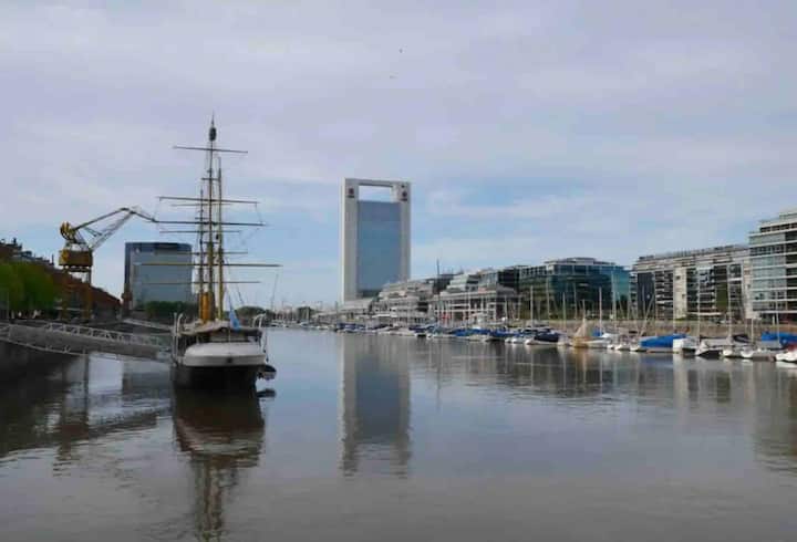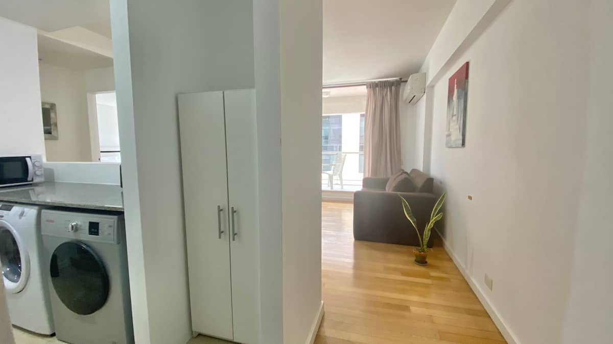 Apartment in San Telmo, close to Puerto Madero. The building has a pool, gym, sauna and 24-hour security, with access to the common areas. The accommodation is fully equipped for stays, with supplies provided during the stay, including kitchen and room equipment.