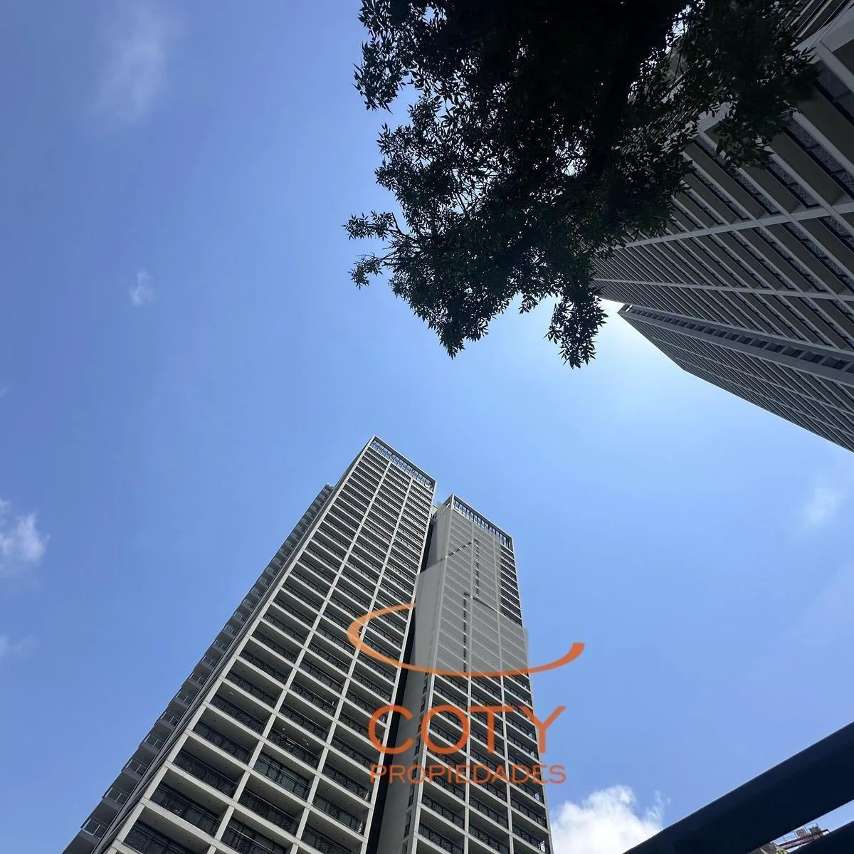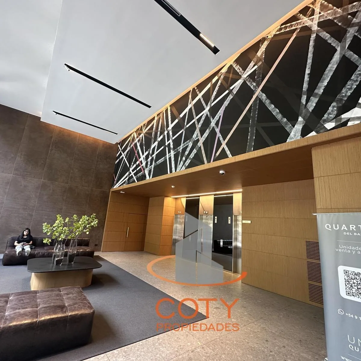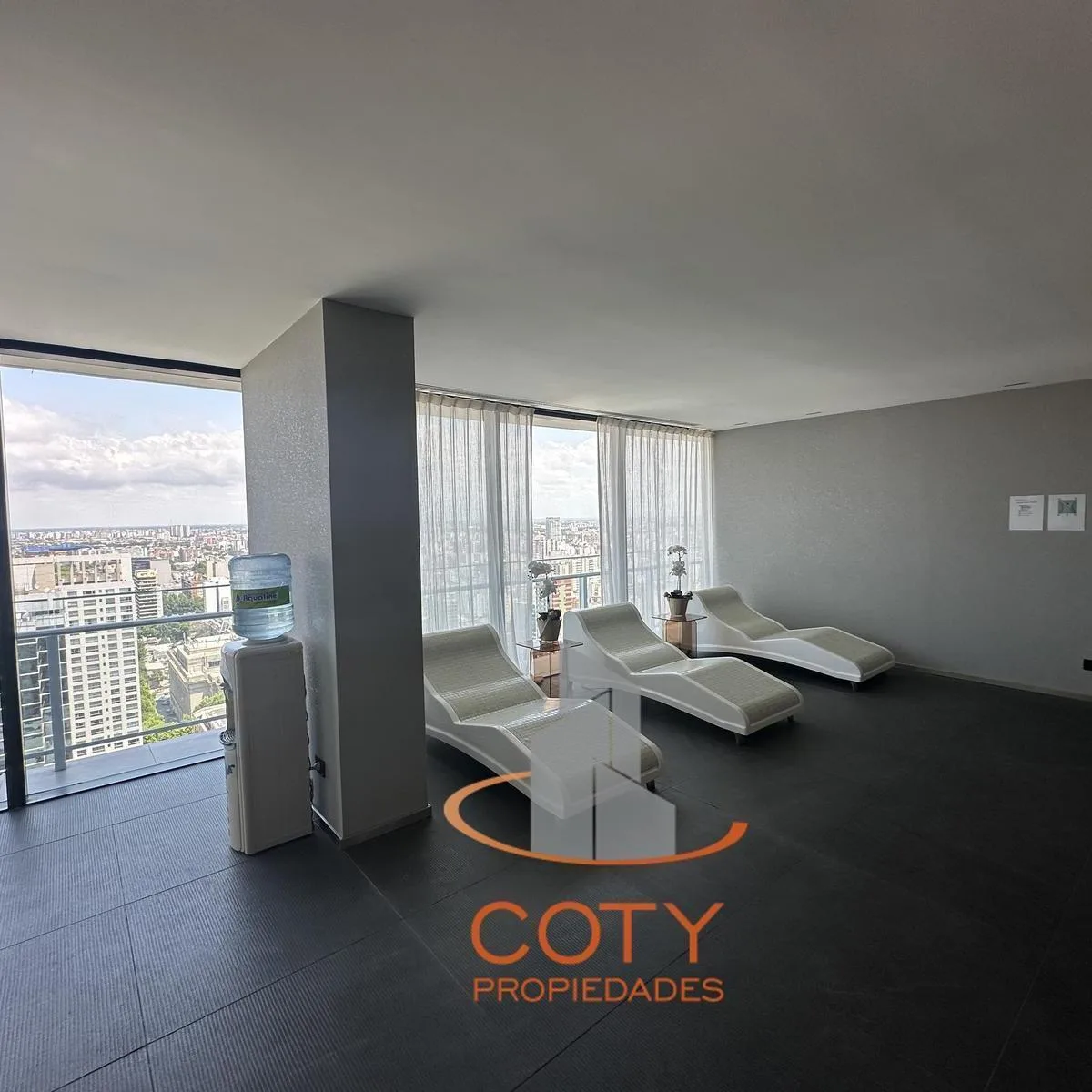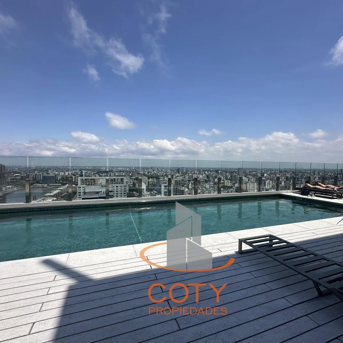 Two-room apartment of unspecified size in Quartier del Bajo, in a complex of two twin towers with 36 floors each. The unit has a reception toilet, living-dining room with an integrated kitchen, and an en-suite bedroom with a dressing area, with access from the rooms to a continuous balcony with an open view. Facilities include a heated pool, communal room (SUM), grill, gym, sauna and Finnish sauna, massage and hydromassage areas, laundry, and bicycle and motorcycle parking, with three main lifts