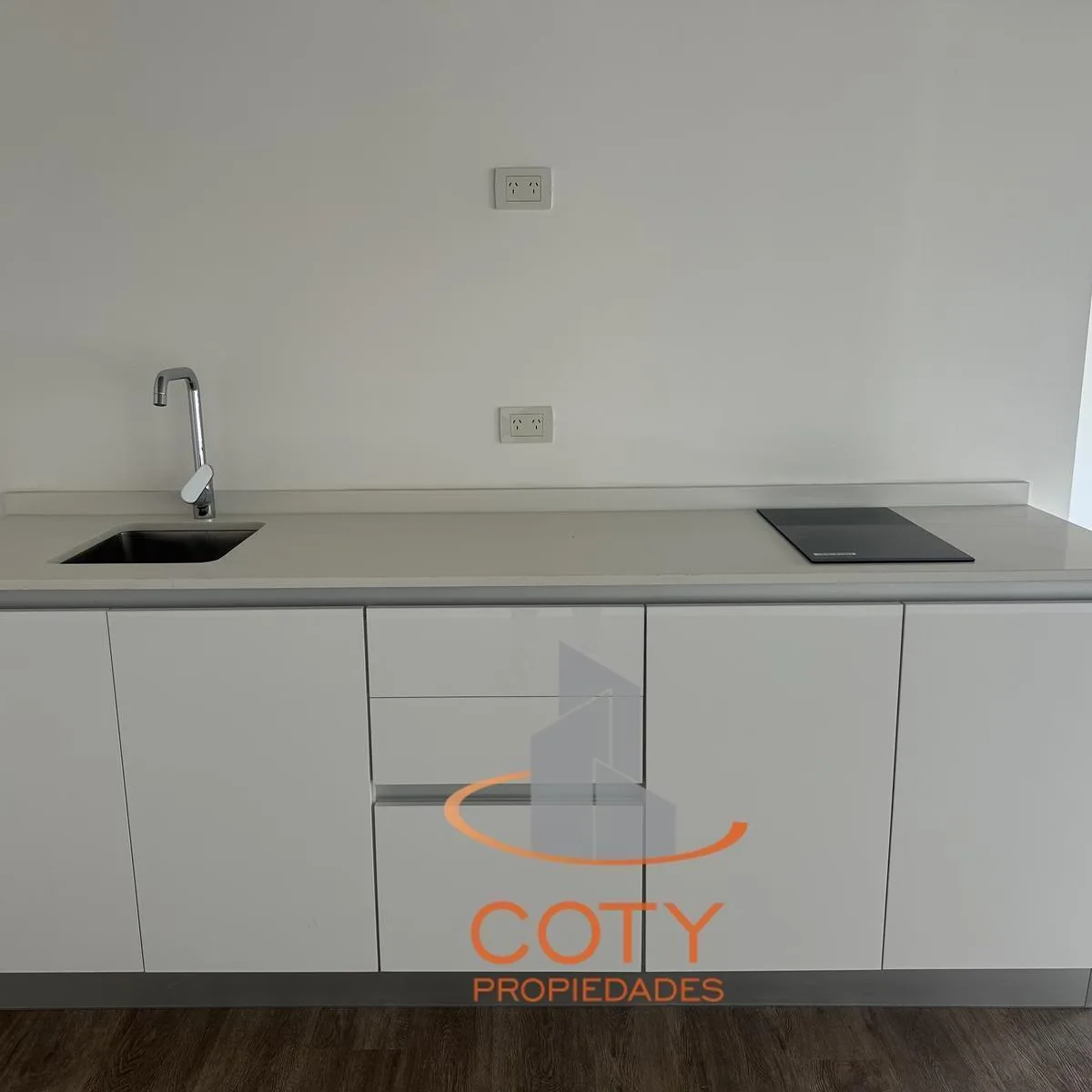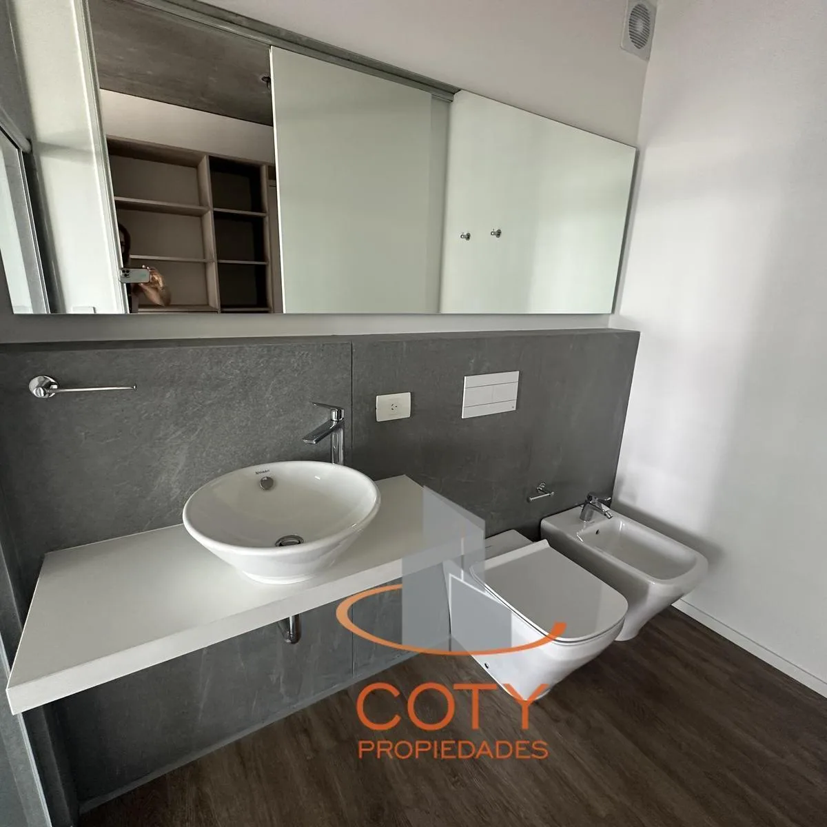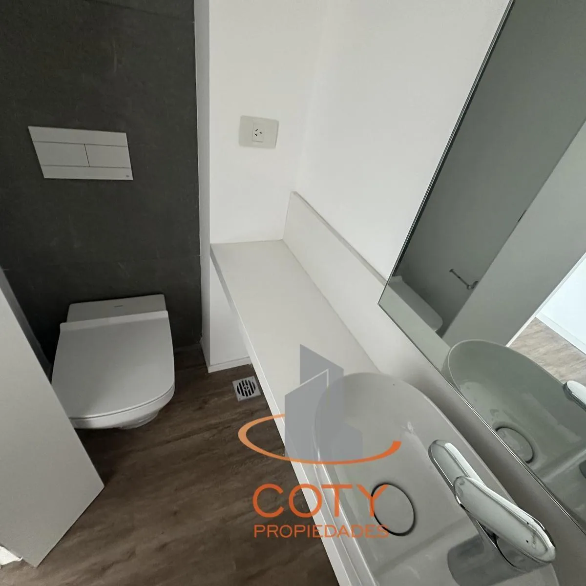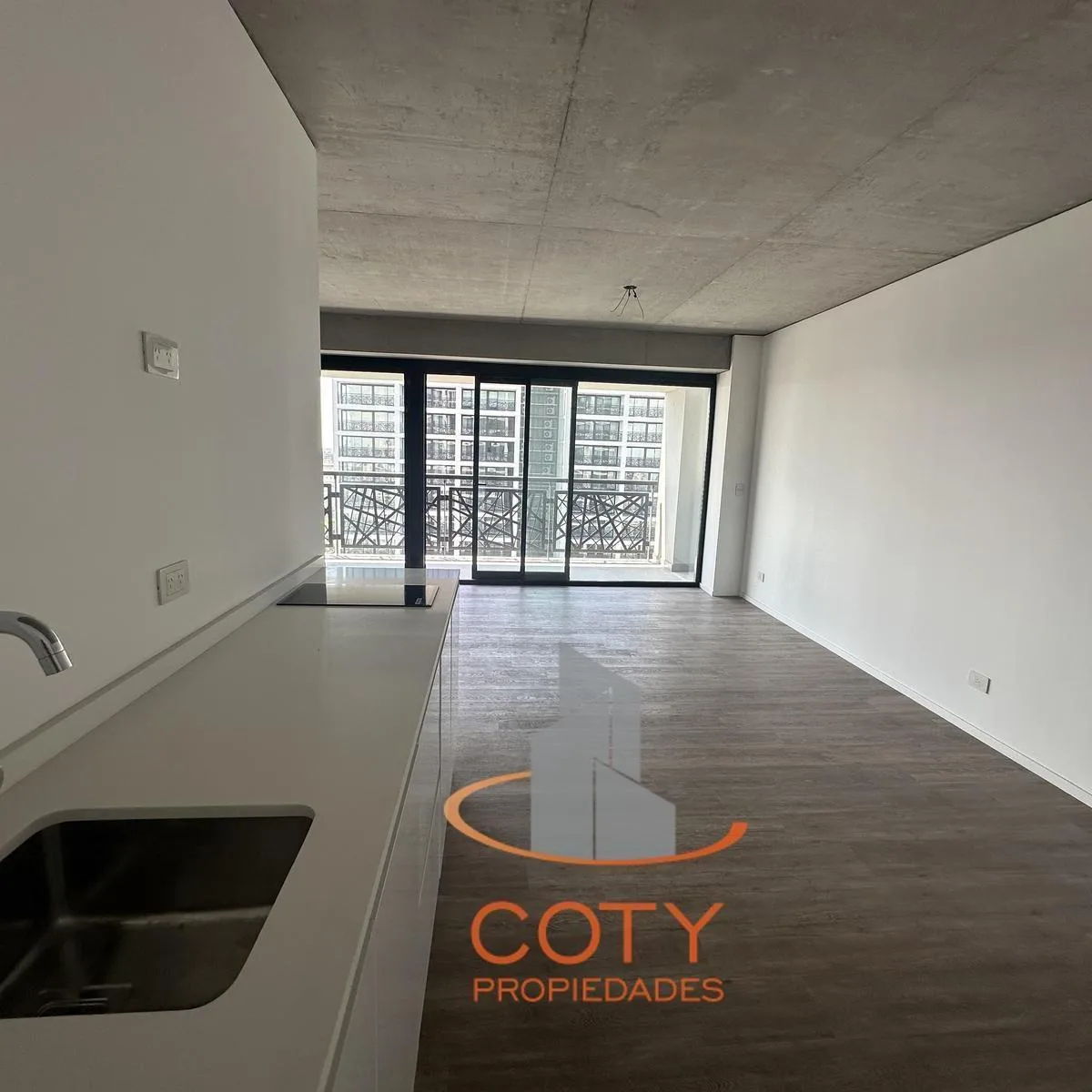 Two-room apartment of unspecified size in Quartier del Bajo, in a complex of two twin towers with 36 floors each. The unit has a reception toilet, living-dining room with an integrated kitchen, and an en-suite bedroom with a dressing area, with access from the rooms to a continuous balcony with an open view. Facilities include a heated pool, communal room (SUM), grill, gym, sauna and Finnish sauna, massage and hydromassage areas, laundry, and bicycle and motorcycle parking, with three main lifts