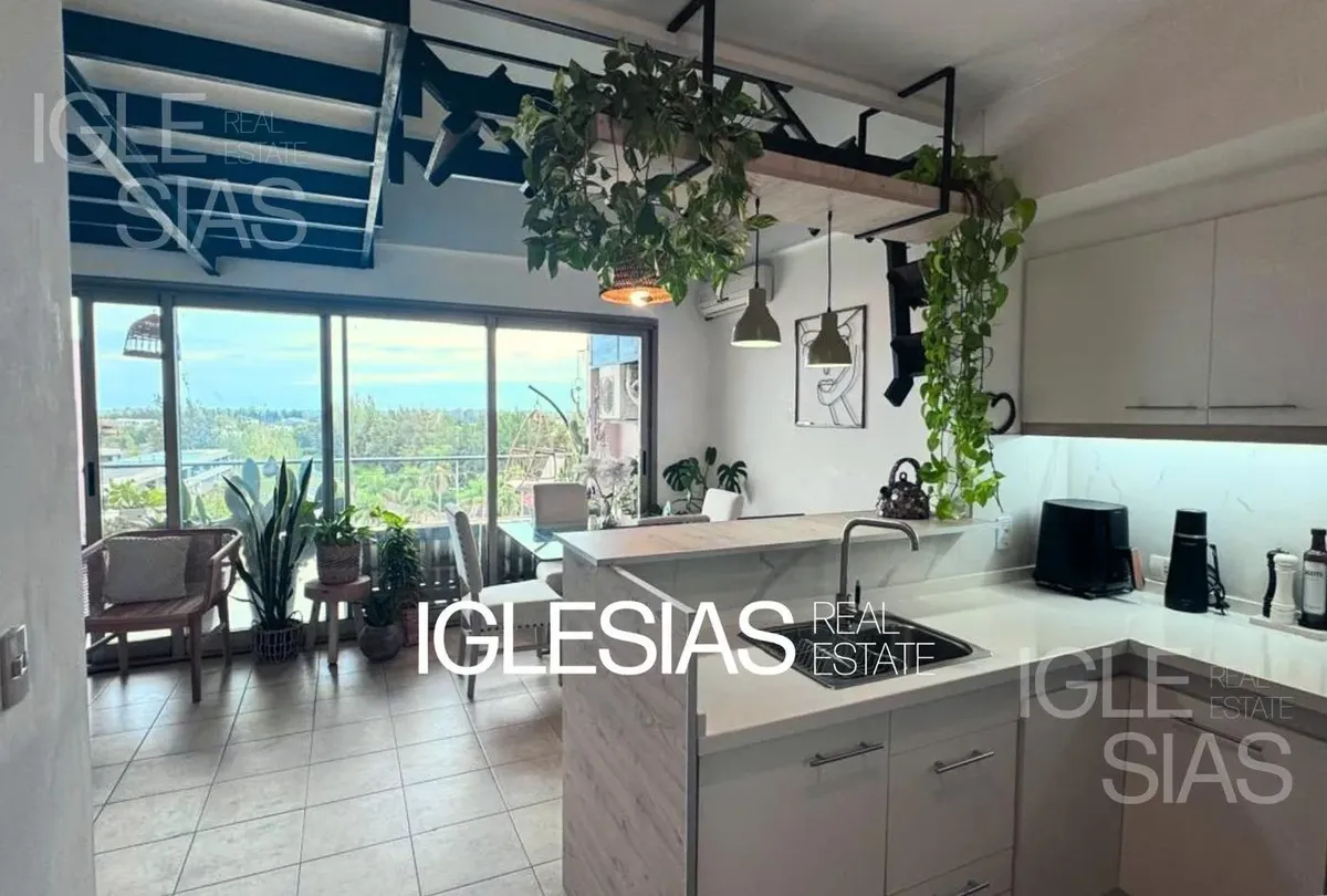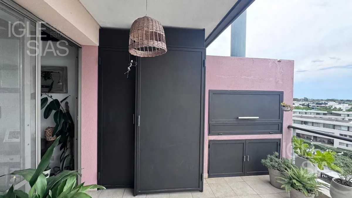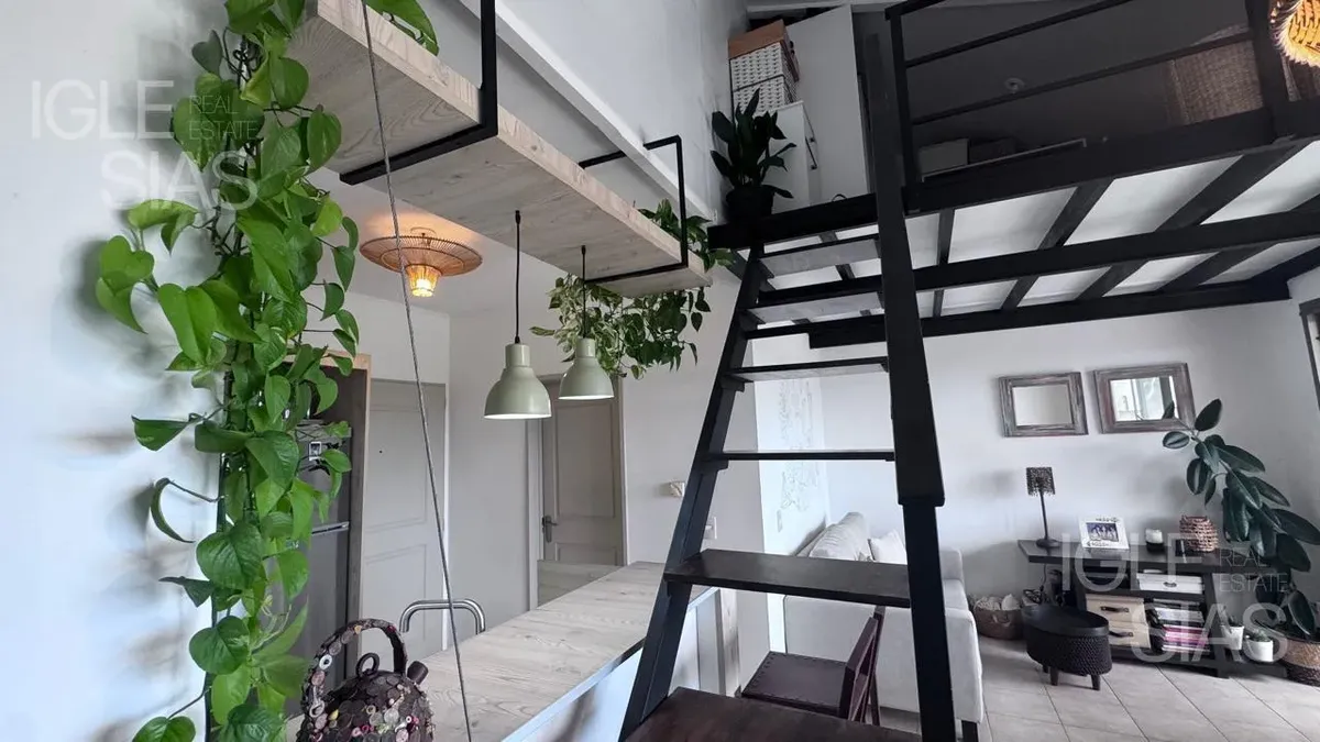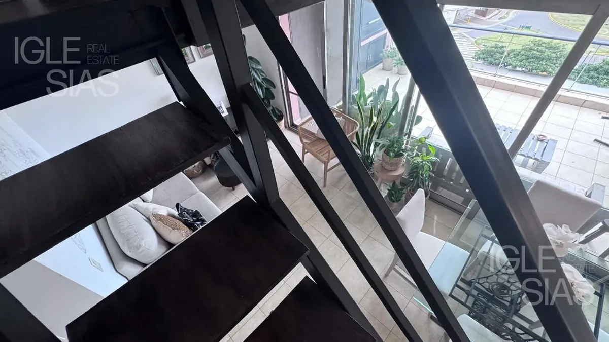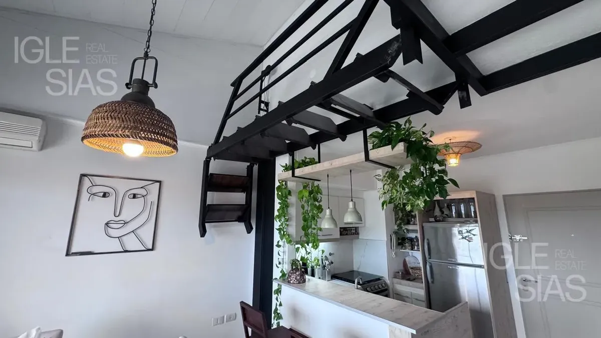 One-room apartment with mezzanine in Studios I, Bahía Grande, Nordelta, with bathroom and a renovated modern kitchen with a breakfast bar. The living-dining area is integrated with large windows opening to a balcony terrace, with a grill, water heater tank and washing-machine connection. The unit is listed as suitable for professional use, has a semi-covered (assigned) parking space, radiant slab heating and cold-air air conditioning.