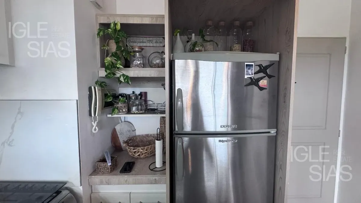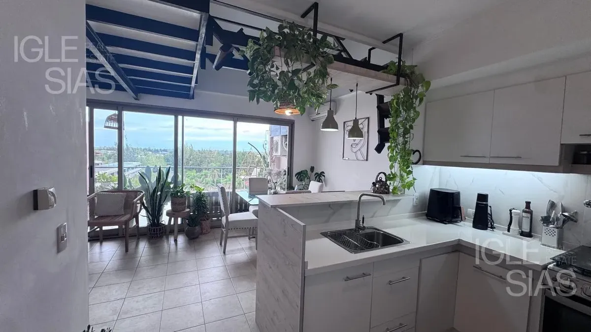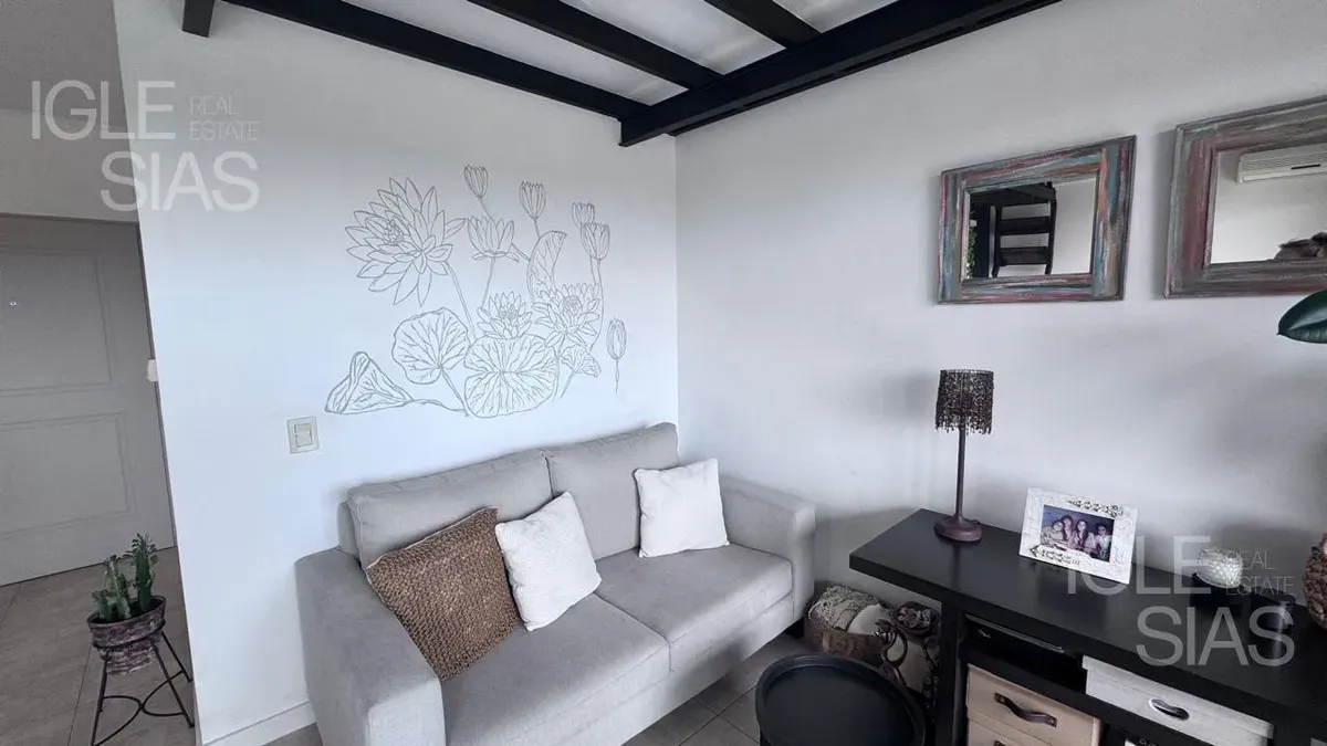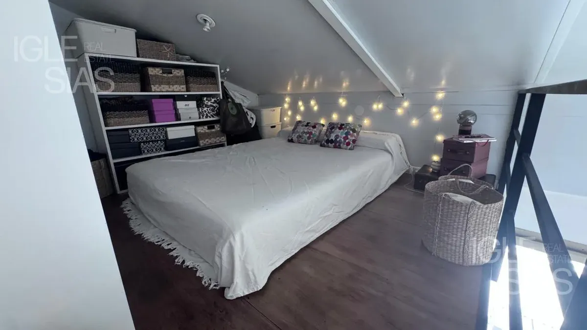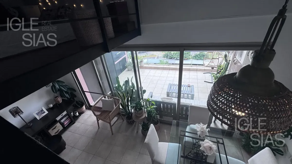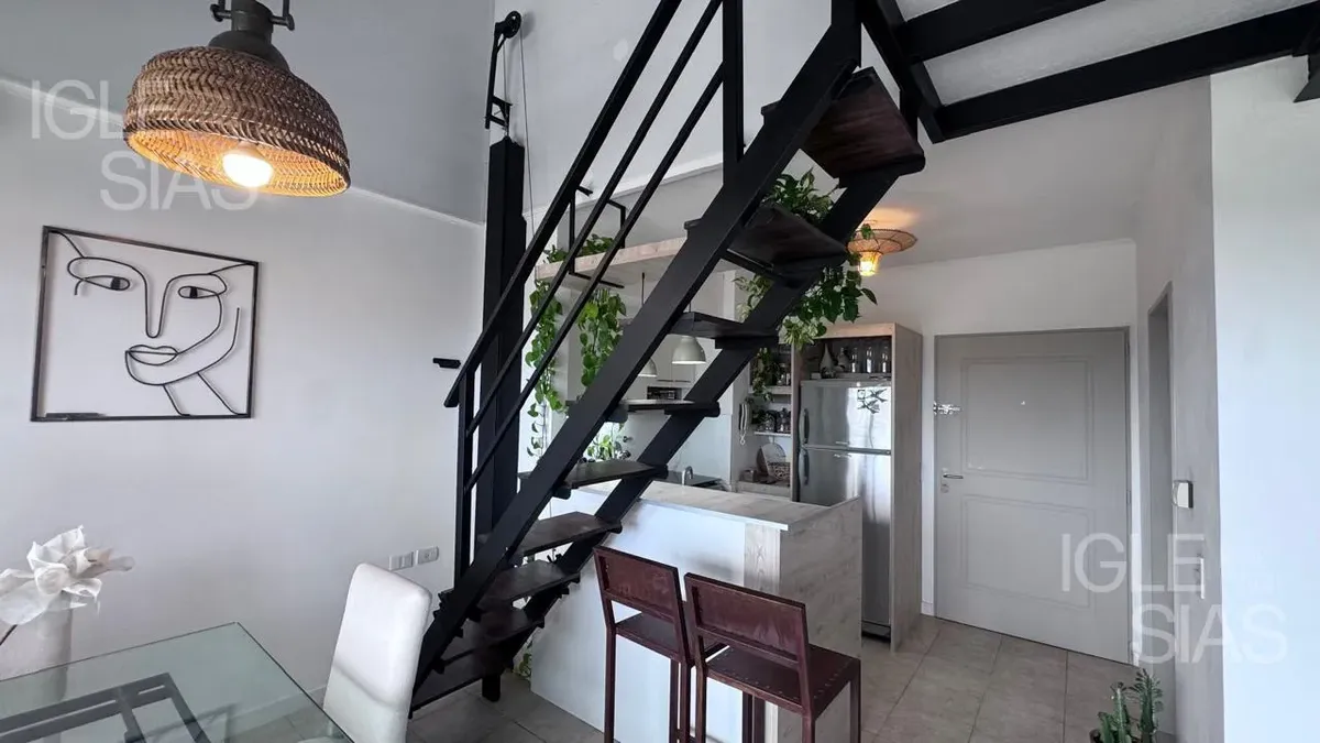 One-room apartment with mezzanine in Studios I, Bahía Grande, Nordelta, with bathroom and a renovated modern kitchen with a breakfast bar. The living-dining area is integrated with large windows opening to a balcony terrace, with a grill, water heater tank and washing-machine connection. The unit is listed as suitable for professional use, has a semi-covered (assigned) parking space, radiant slab heating and cold-air air conditioning.