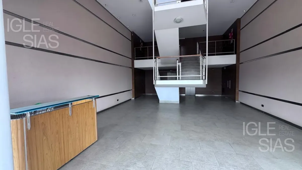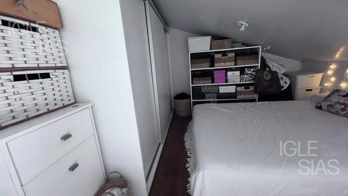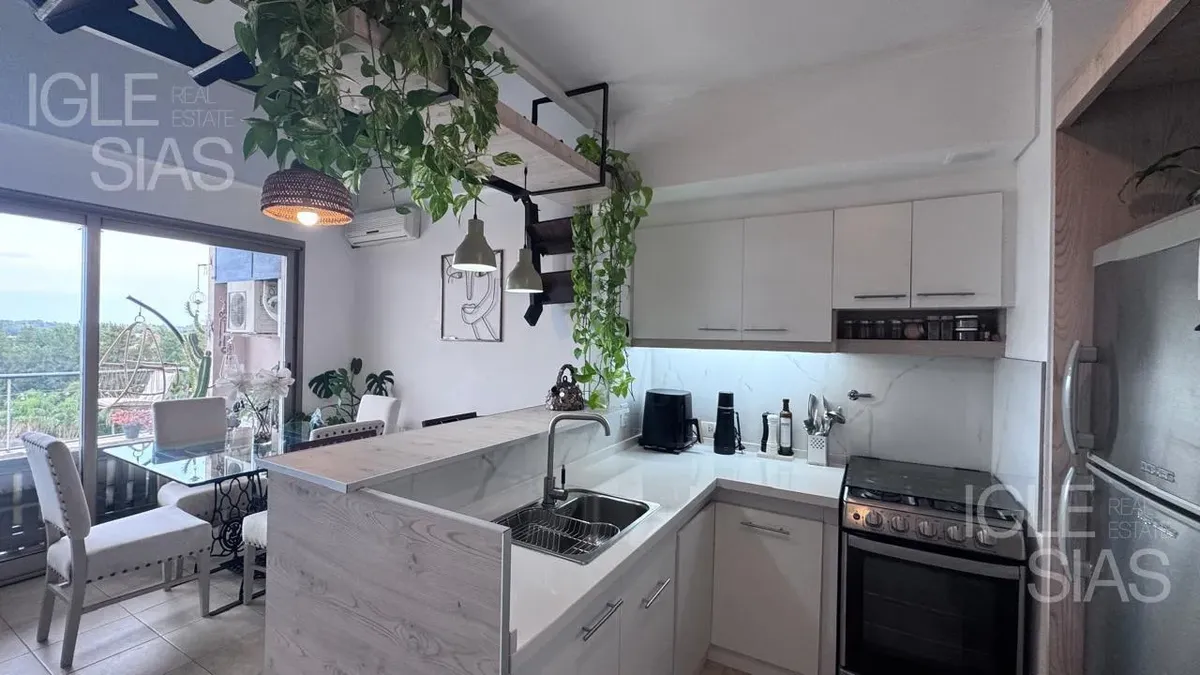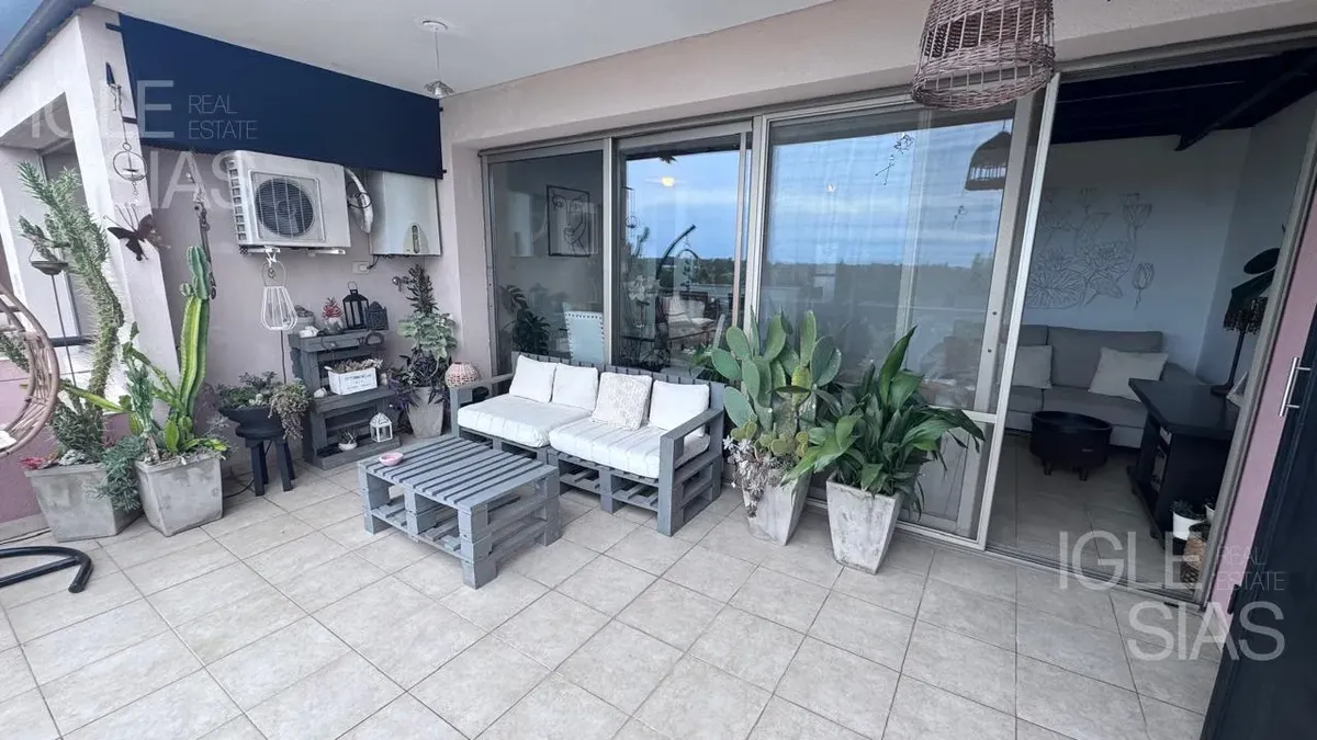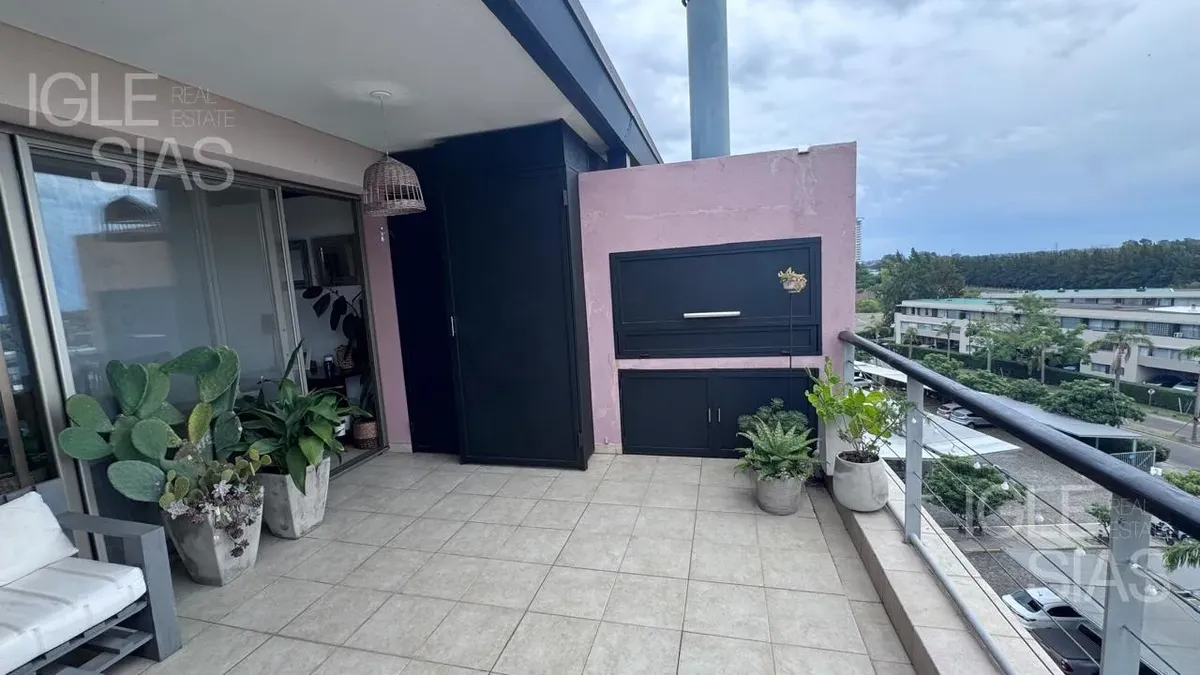 One-room apartment with mezzanine in Studios I, Bahía Grande, Nordelta, with bathroom and a renovated modern kitchen with a breakfast bar. The living-dining area is integrated with large windows opening to a balcony terrace, with a grill, water heater tank and washing-machine connection. The unit is listed as suitable for professional use, has a semi-covered (assigned) parking space, radiant slab heating and cold-air air conditioning.