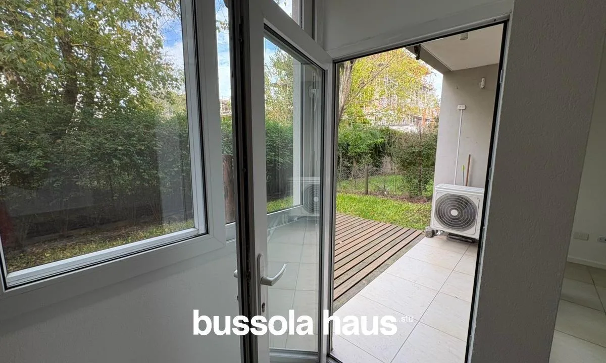 Two-room apartment with private garden in Villa Los Remeros. The unit has a living-dining area with large windows and installed air conditioning, an integrated kitchen with built-in cabinetry plus space for a microwave and connection for a washing machine, and a bedroom with exterior-facing window and a second air-conditioning unit. The full bathroom has a vanity with a modern countertop and a bathtub with a glass shower screen; the outdoor area includes a wooden deck and a private garden. There