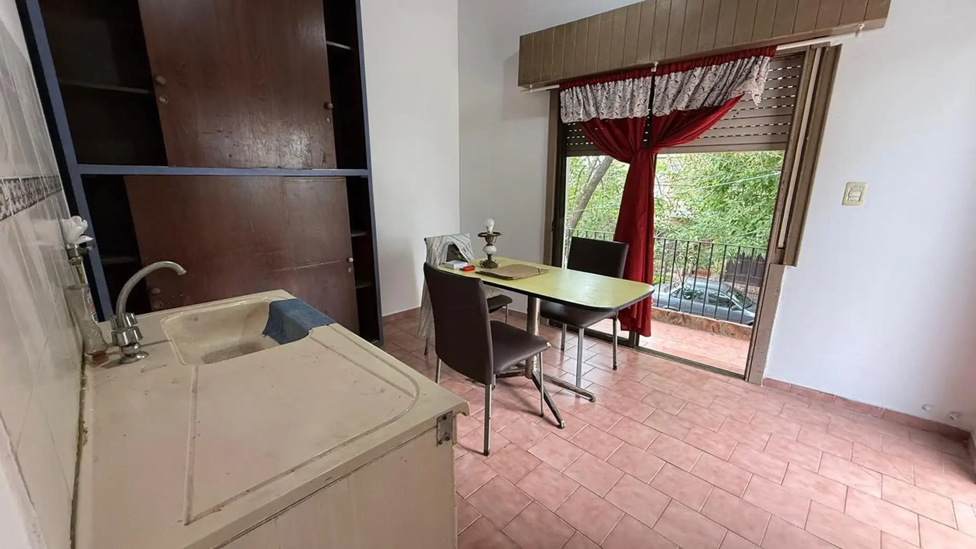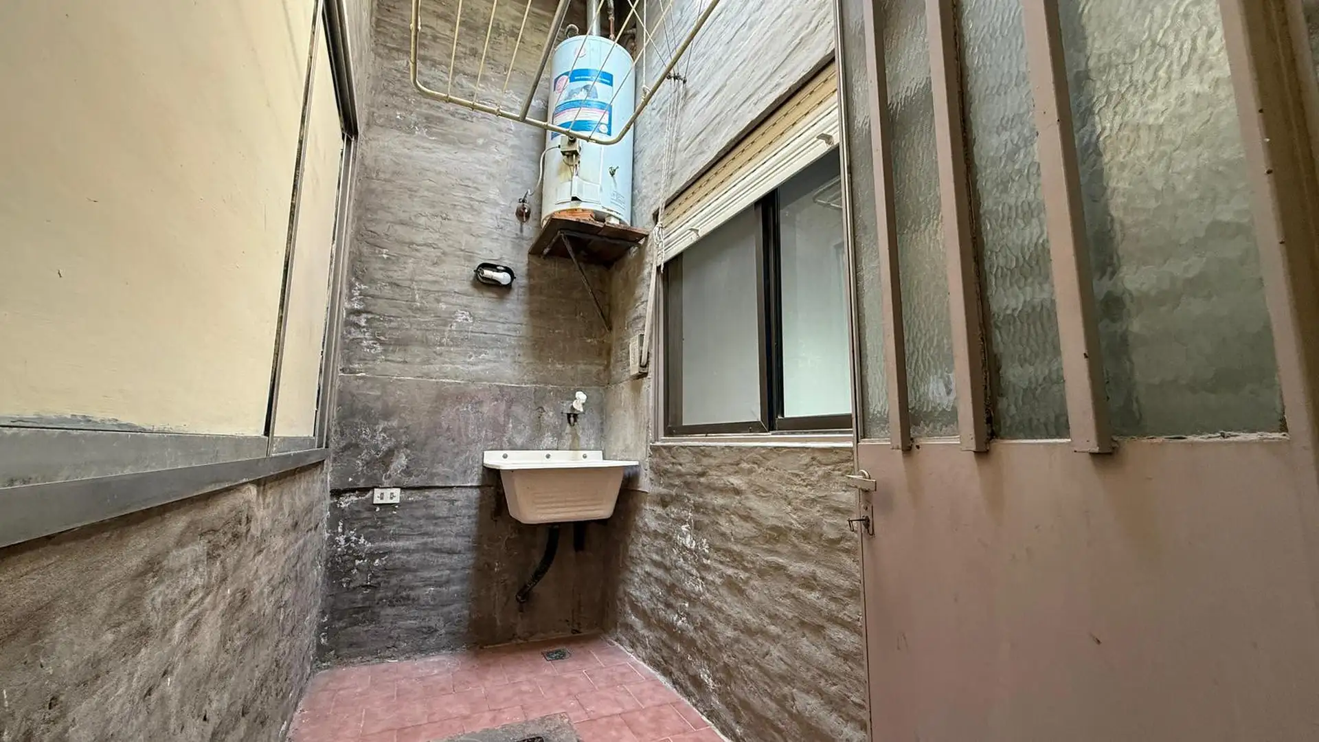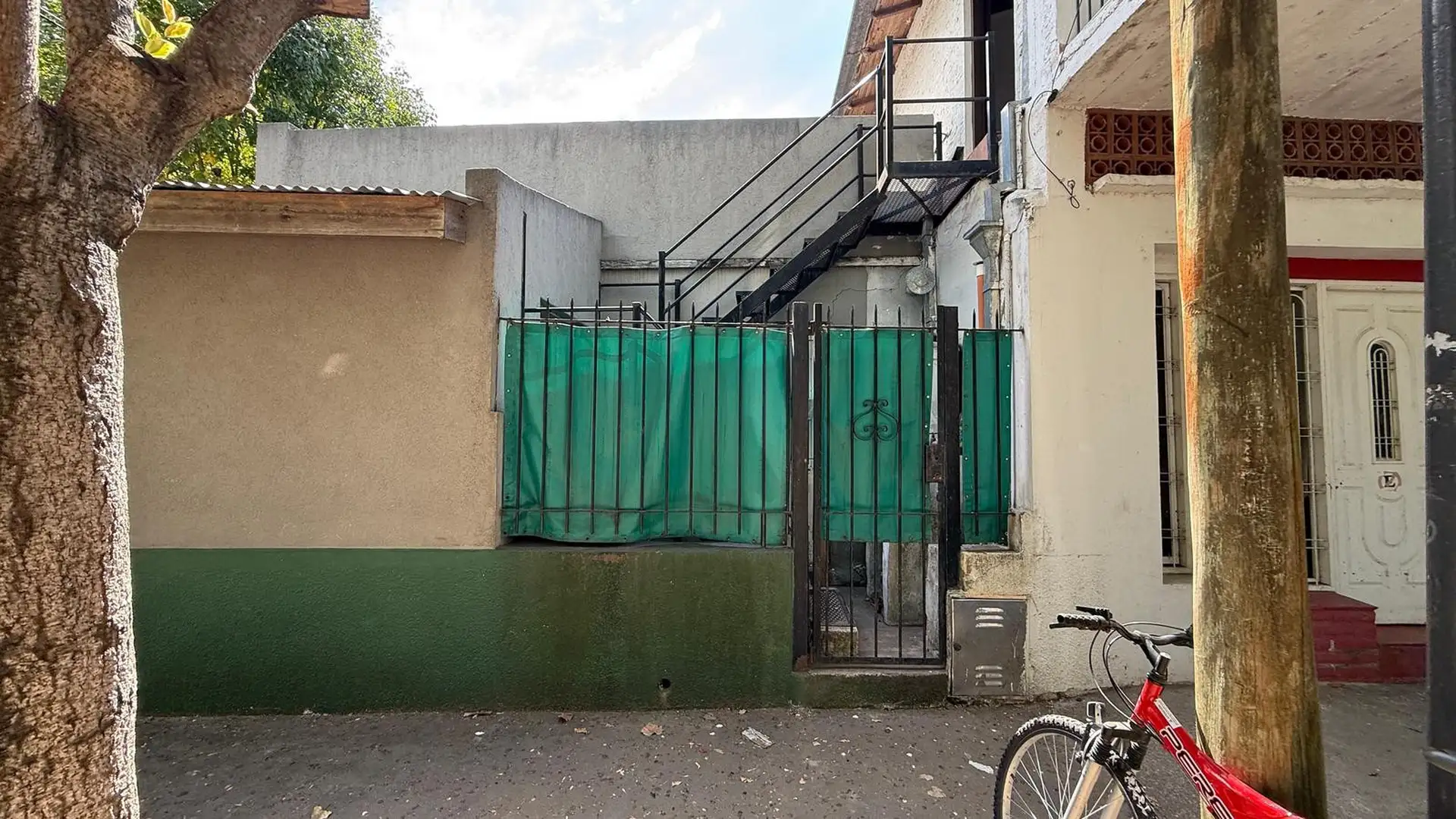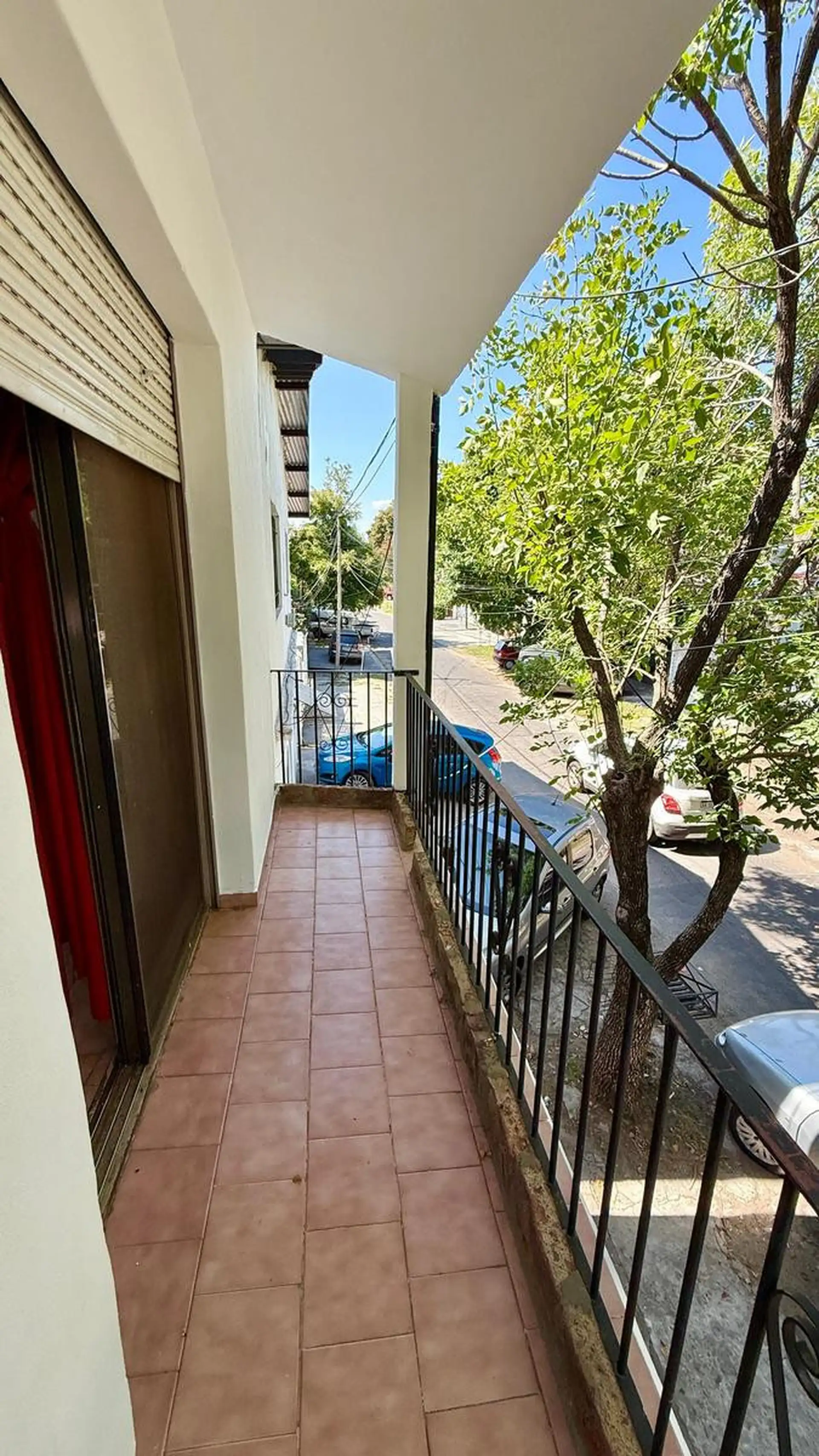 Two-room apartment for rent in Tigre. It does not pay building fees. Access is via a gate with an independent entrance; the unit is on the first floor reached by stairs and includes a living-dining kitchen, a full bathroom, a bedroom with a built-in wardrobe, and a balcony street-facing on Sáenz Peña. A spacious laundry area includes an overhead clothes-drying rack, and there is a third space used as a storage room (baulera). The unit has window screens, an air conditioner for cooling in the bed