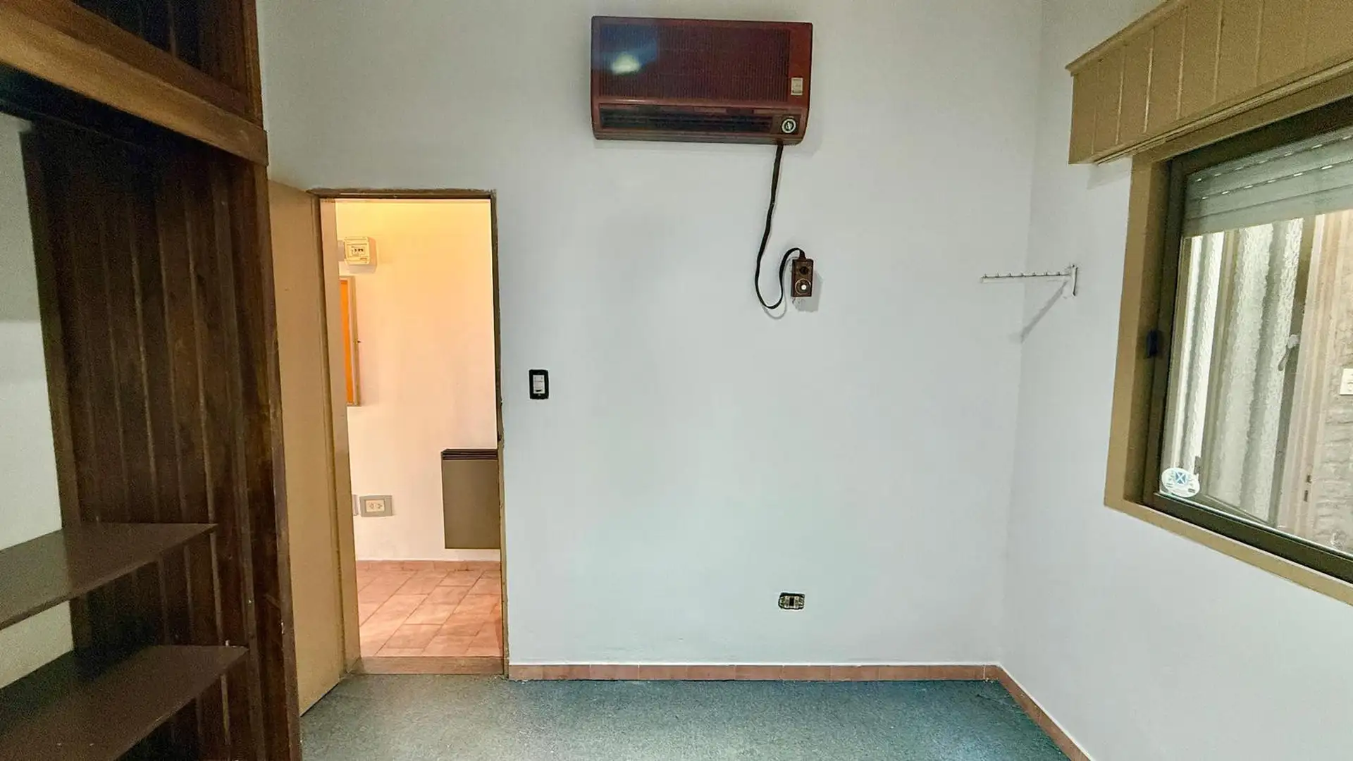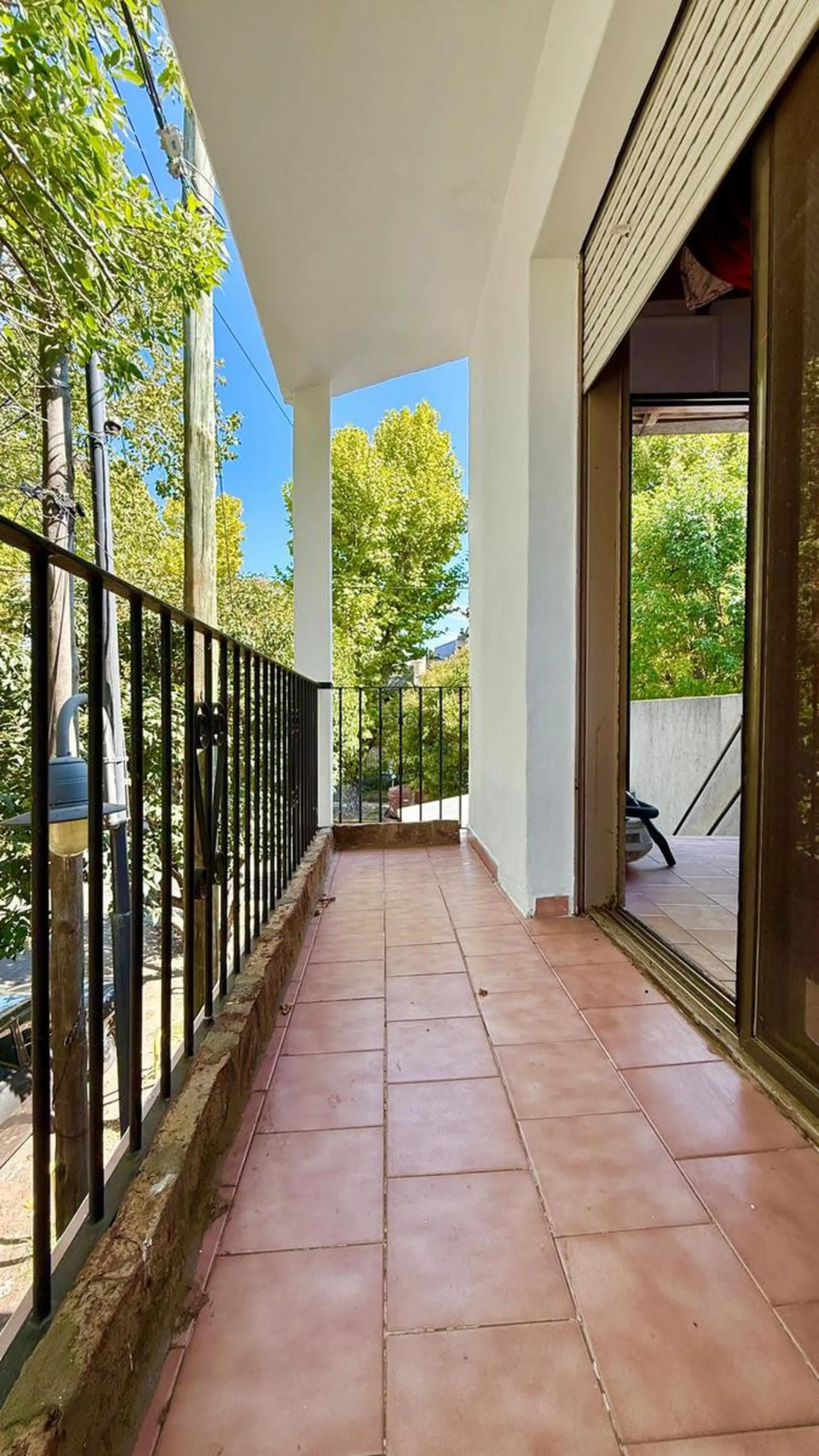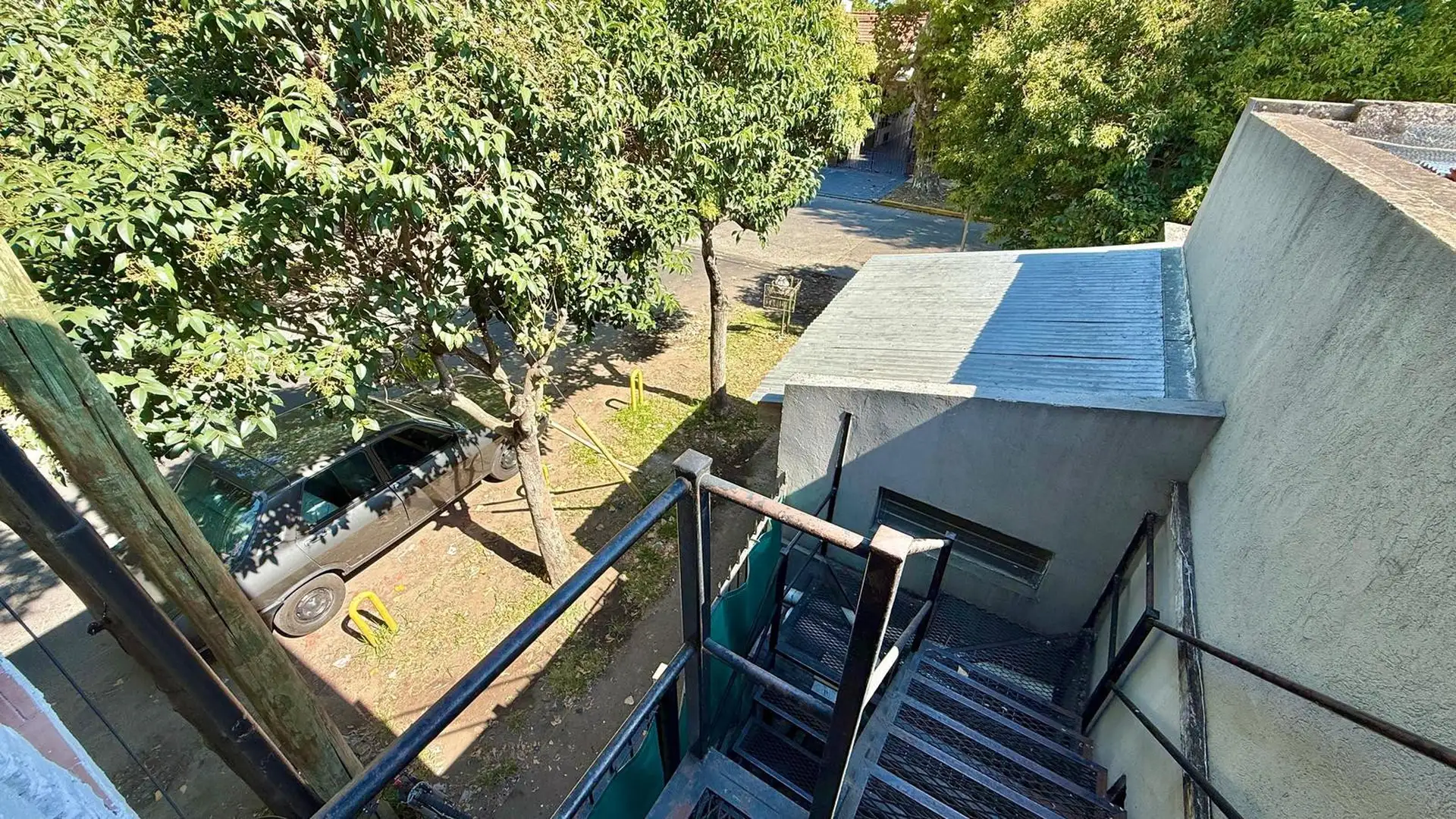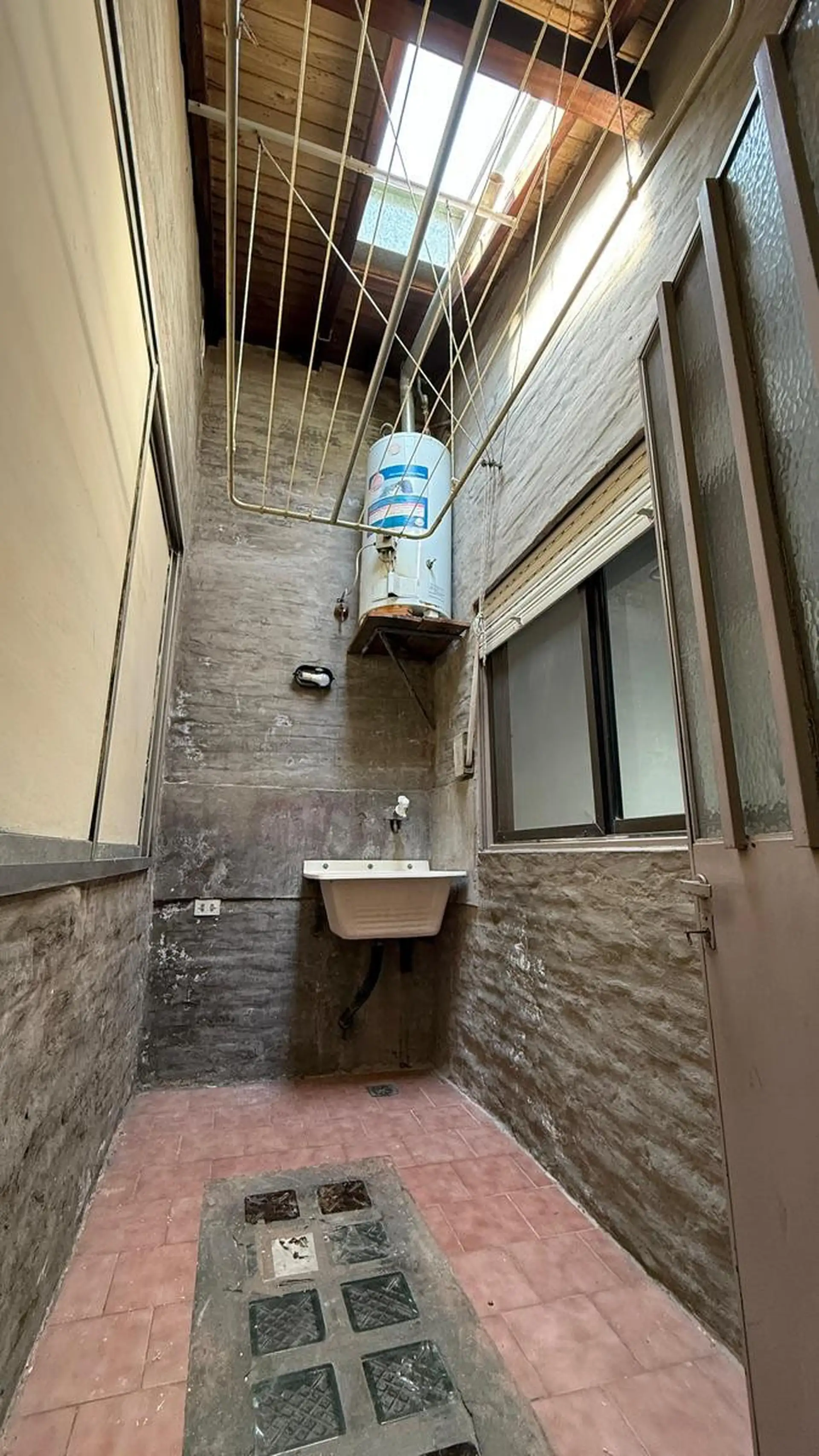 Two-room apartment for rent in Tigre. It does not pay building fees. Access is via a gate with an independent entrance; the unit is on the first floor reached by stairs and includes a living-dining kitchen, a full bathroom, a bedroom with a built-in wardrobe, and a balcony street-facing on Sáenz Peña. A spacious laundry area includes an overhead clothes-drying rack, and there is a third space used as a storage room (baulera). The unit has window screens, an air conditioner for cooling in the bed