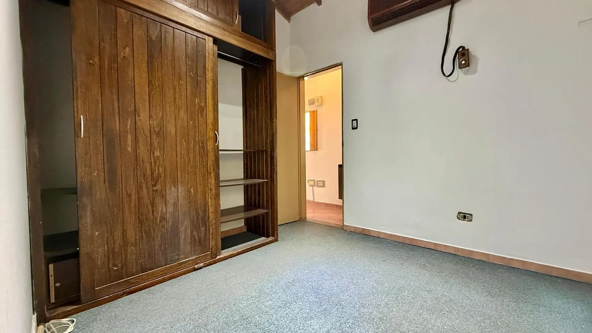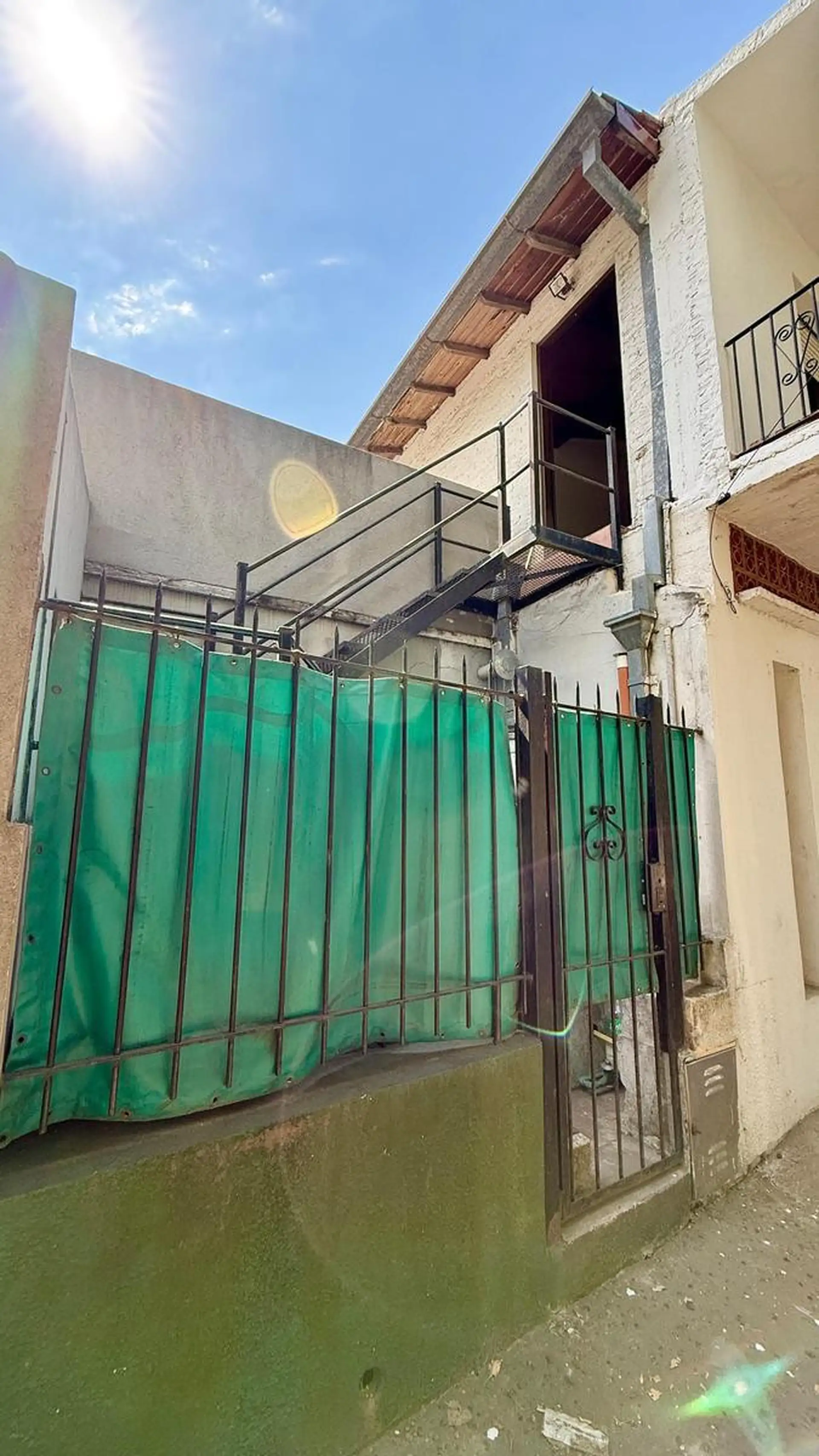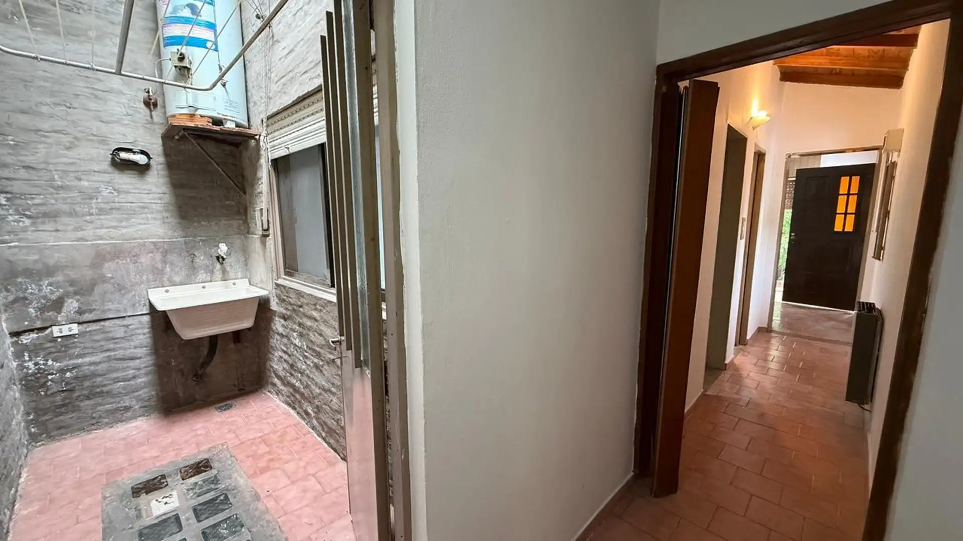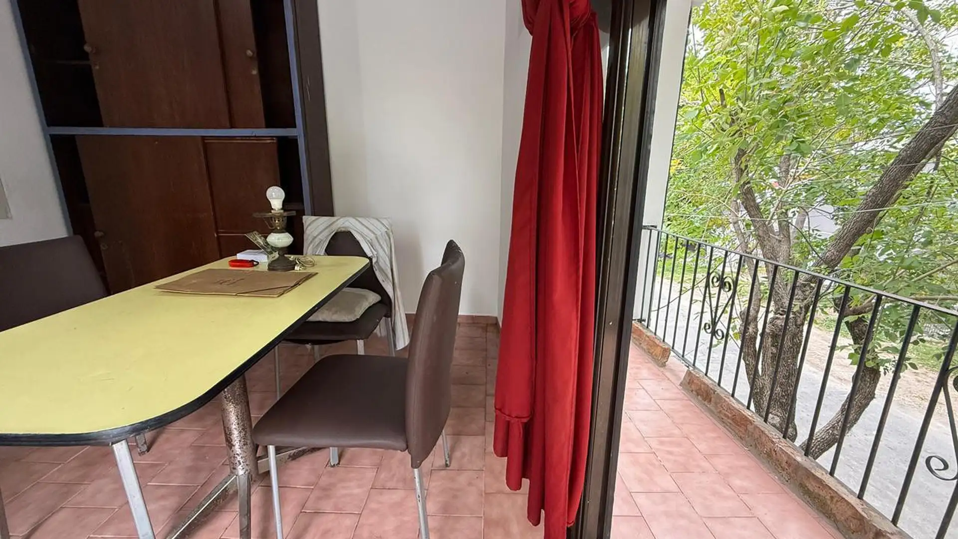 Two-room apartment for rent in Tigre. It does not pay building fees. Access is via a gate with an independent entrance; the unit is on the first floor reached by stairs and includes a living-dining kitchen, a full bathroom, a bedroom with a built-in wardrobe, and a balcony street-facing on Sáenz Peña. A spacious laundry area includes an overhead clothes-drying rack, and there is a third space used as a storage room (baulera). The unit has window screens, an air conditioner for cooling in the bed