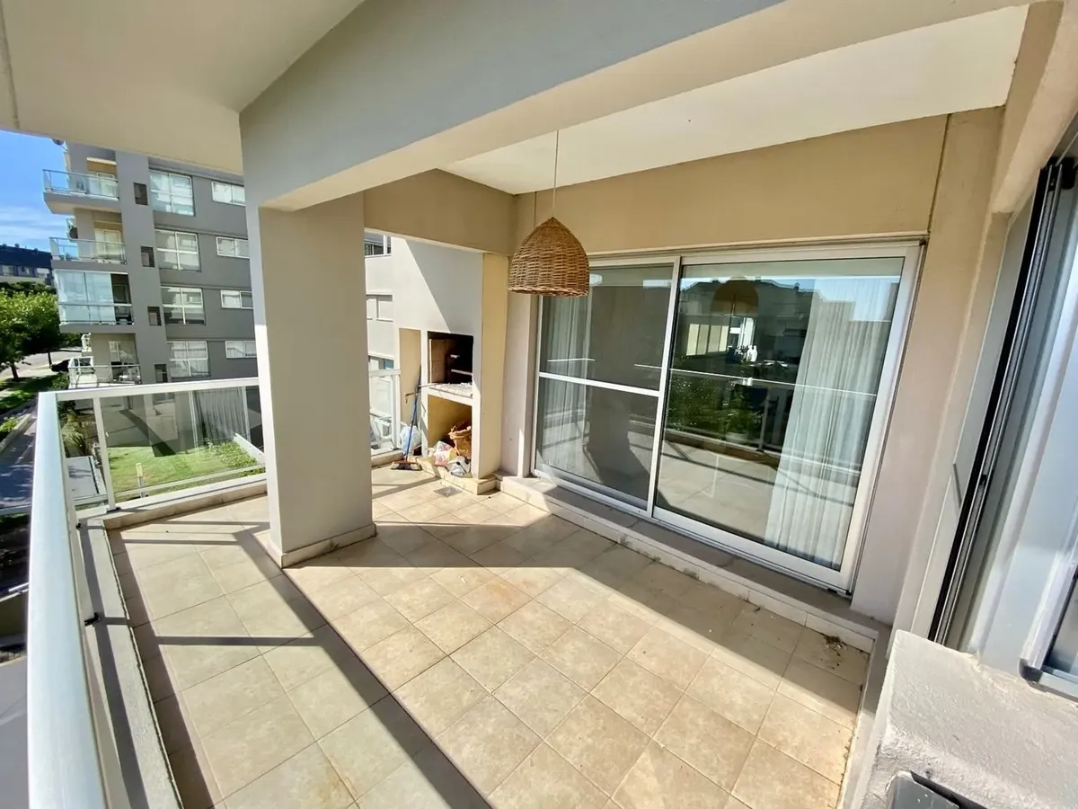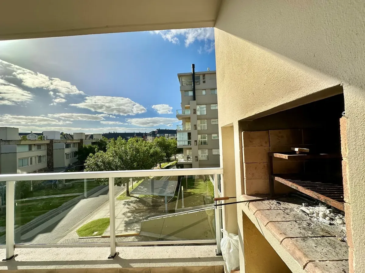 One-bedroom apartment for rent in Marinas de Portezuelo, Edificio Petrel, furnished and available from April. The unit includes a living-dining room with large windows, a semi-separated kitchen with a bar, room for a washing machine or dishwasher, a bedroom with a dressing area, and a full bathroom. There is a covered balcony with a grill, air conditioning (hot and cold) in all rooms, and covered parking plus a storage room. The complex has a pool, a communal room (SUM), laundry, boat storage, a