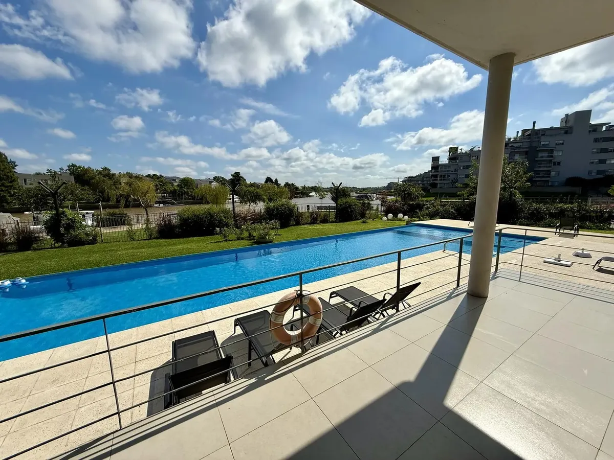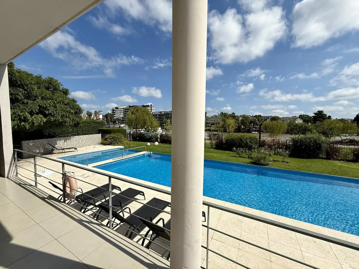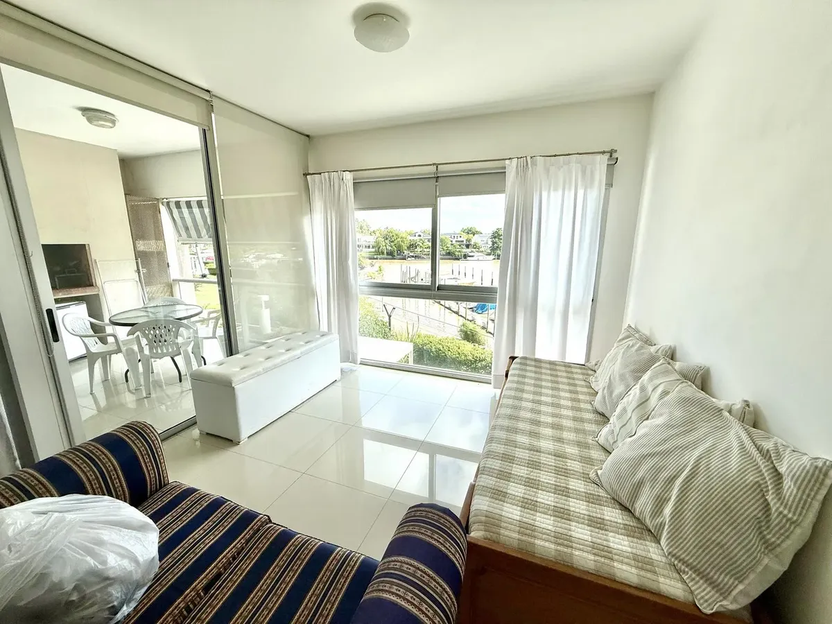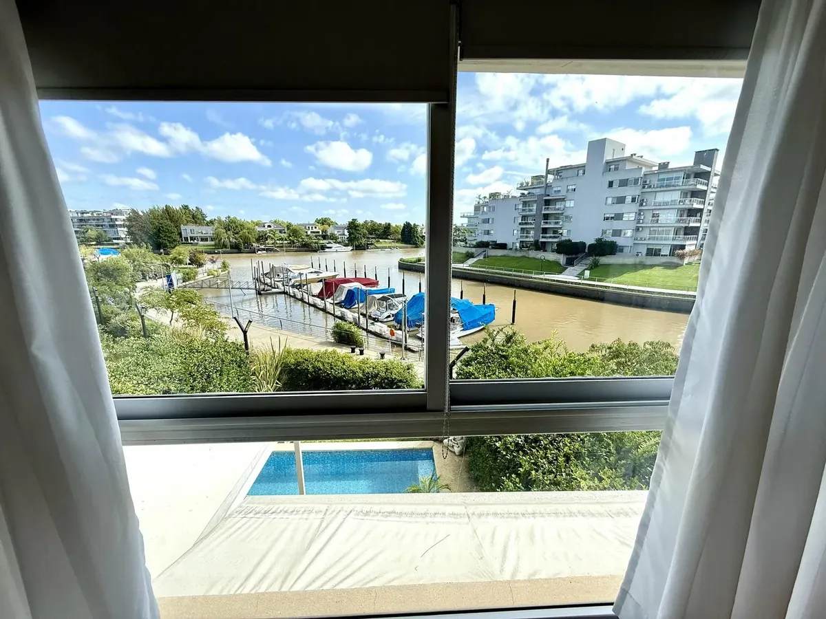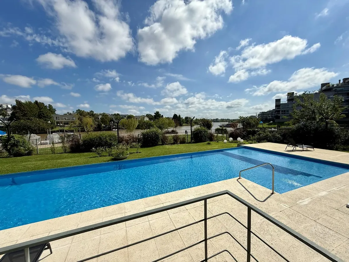 Modern one-bedroom apartment with views over the bay of Nordelta in Marinas del Canal, Tigre. It has 47.6 m² covered and is oriented north-west, with two rooms including a bedroom with a built-in closet and a full bathroom. The kitchen is fully equipped with a washing machine, fridge and dishwasher, and the unit has individual air conditioning and a water heater. Building amenities include a pool, gym, sauna, communal room (SUM), 24-hour security, green areas, tennis court and shared and individ