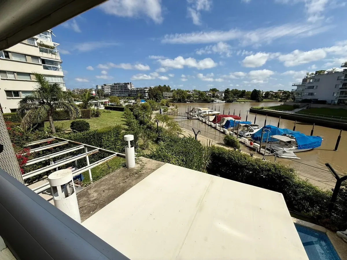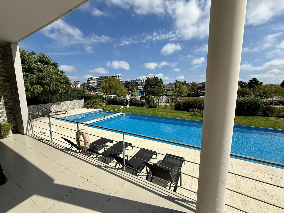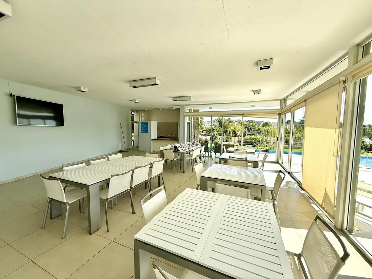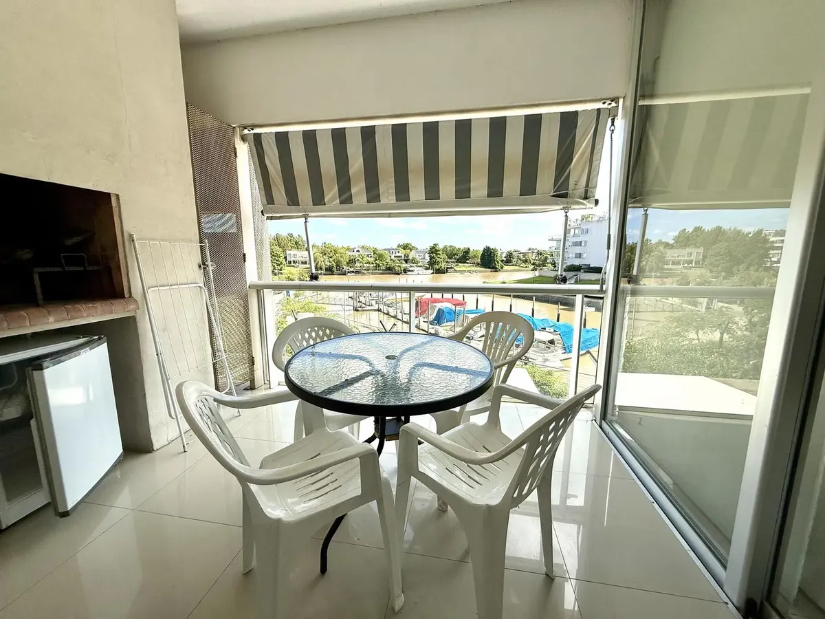 Modern one-bedroom apartment with views over the bay of Nordelta in Marinas del Canal, Tigre. It has 47.6 m² covered and is oriented north-west, with two rooms including a bedroom with a built-in closet and a full bathroom. The kitchen is fully equipped with a washing machine, fridge and dishwasher, and the unit has individual air conditioning and a water heater. Building amenities include a pool, gym, sauna, communal room (SUM), 24-hour security, green areas, tennis court and shared and individ