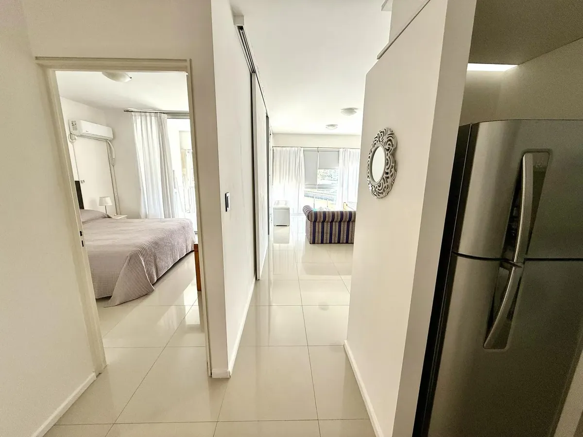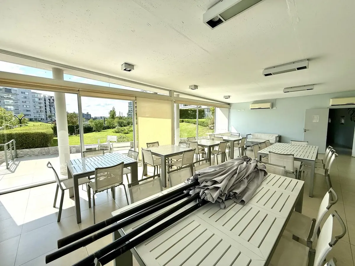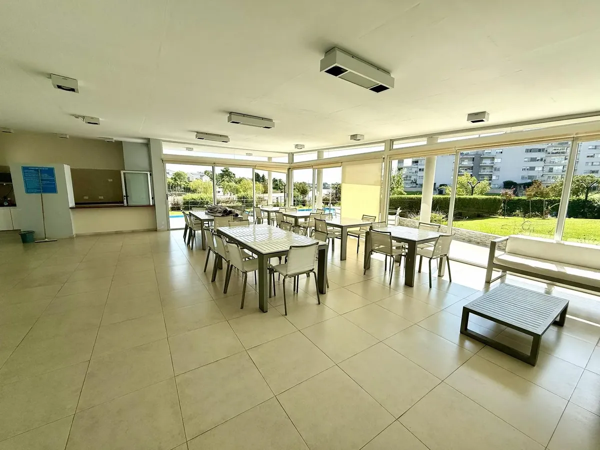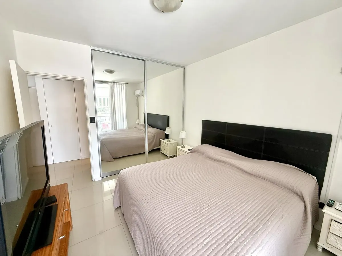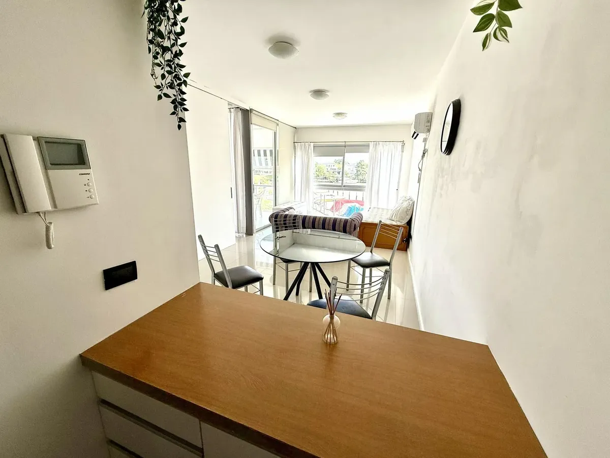 Modern one-bedroom apartment with views over the bay of Nordelta in Marinas del Canal, Tigre. It has 47.6 m² covered and is oriented north-west, with two rooms including a bedroom with a built-in closet and a full bathroom. The kitchen is fully equipped with a washing machine, fridge and dishwasher, and the unit has individual air conditioning and a water heater. Building amenities include a pool, gym, sauna, communal room (SUM), 24-hour security, green areas, tennis court and shared and individ