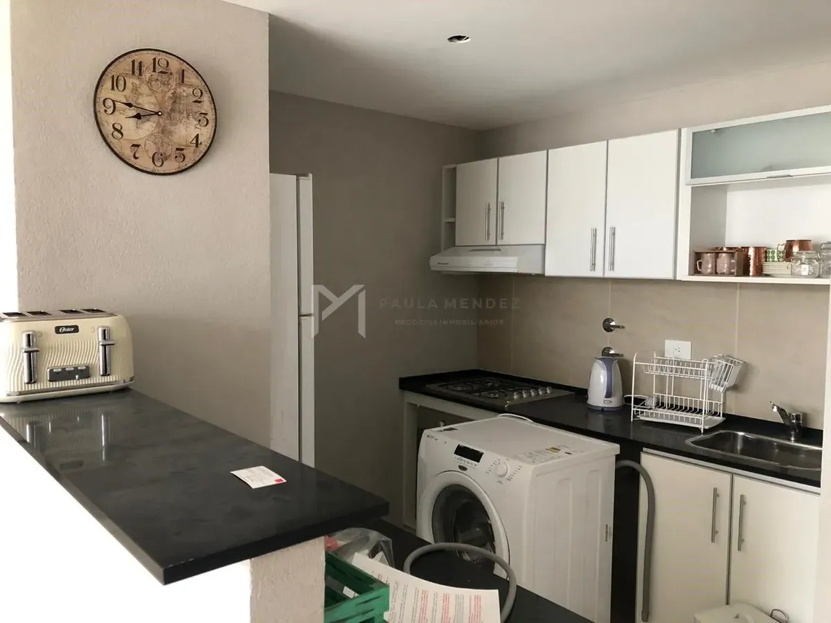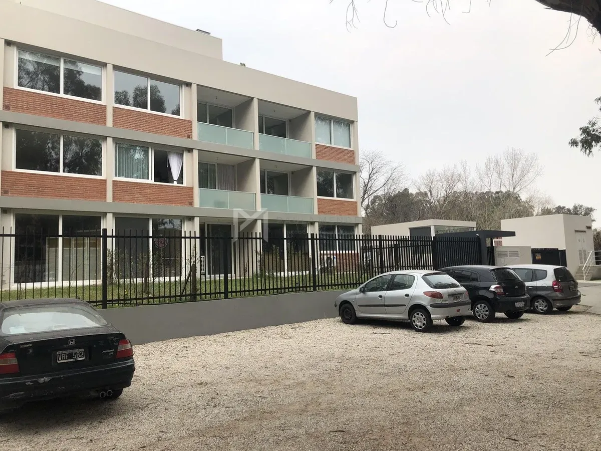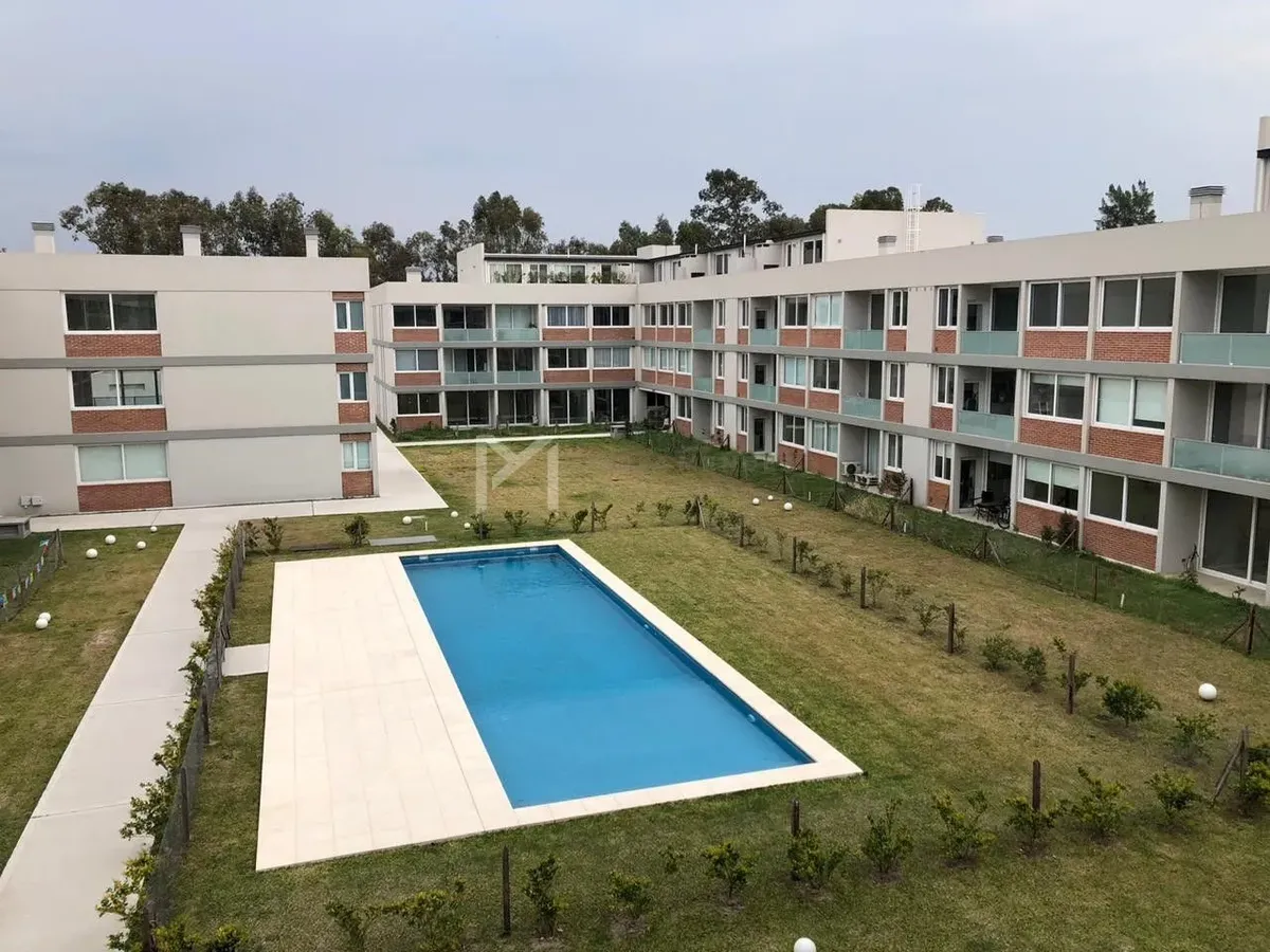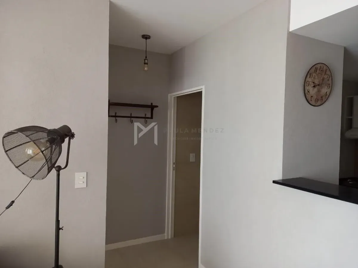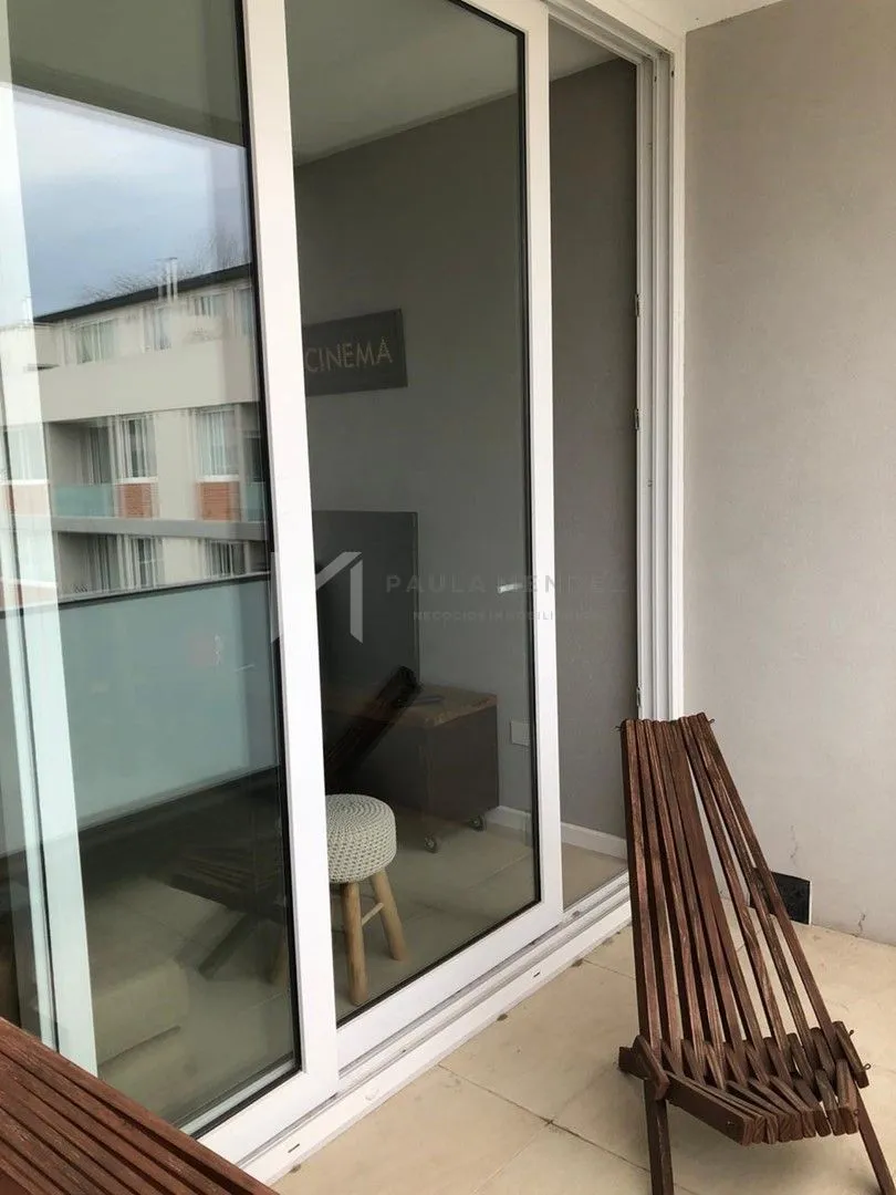 Furnished two-room apartment in Villa Los Remeros, Rincón de Milberg, Tigre, available for short-term rental from May 2026. It has an integrated kitchen with a breakfast bar, a living-dining area, a guest toilet, and a bedroom en suite with a dressing room and full bathroom, plus a semi-covered balcony. The unit includes hot/cold air conditioning. The complex offers an Olympic pool, a communal residents' lounge (SUM), 24-hour security, complimentary parking spaces, and shared green areas. The re