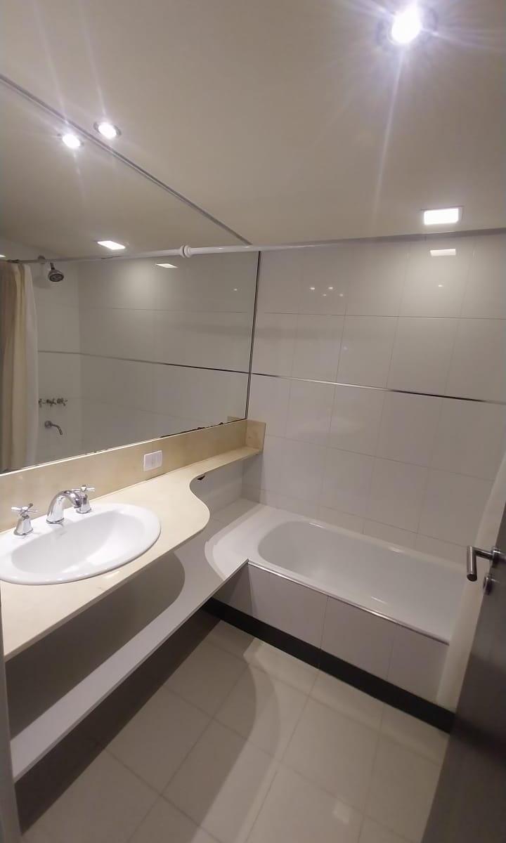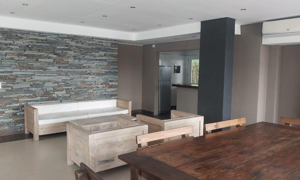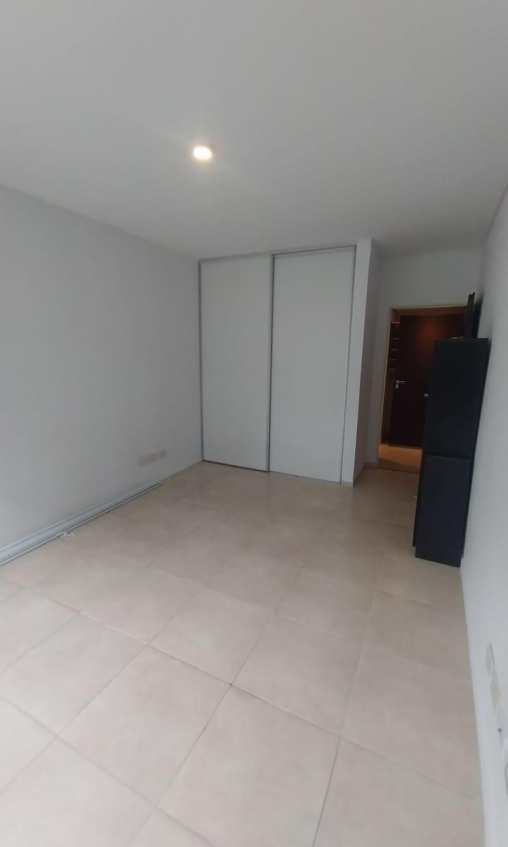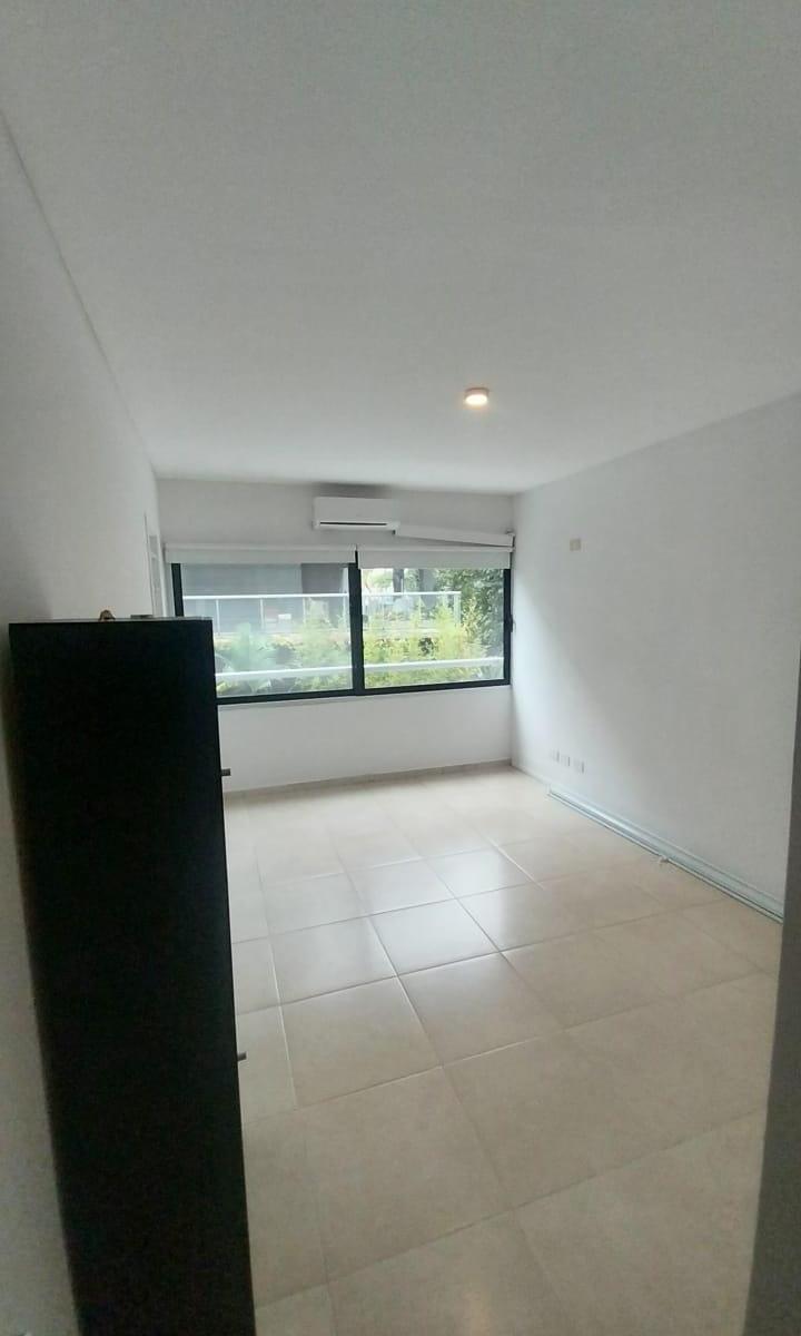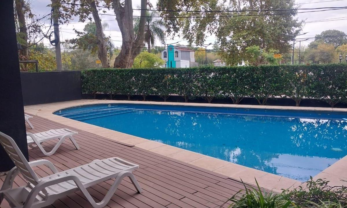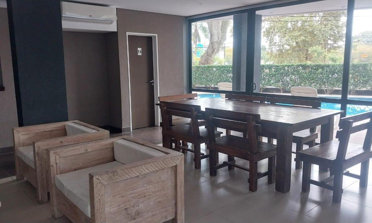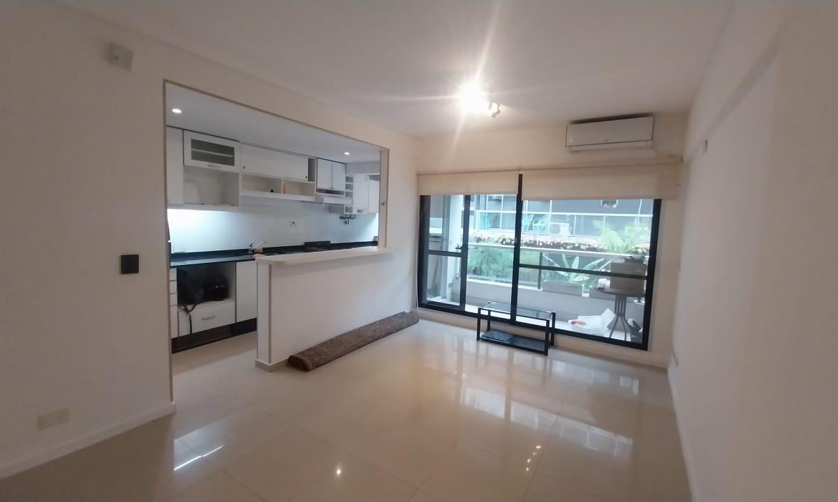 Two-room apartment with a living-dining area with a breakfast bar and a fully fitted kitchen. Street-facing with a balcony accessed from the living area and a full laundry area. Layout includes a distribution hall, a full bathroom, and a 3.80 x 3 m bedroom with a built-in wardrobe. The rent includes a covered (assigned) parking space, building fees with Aysa, and ABL at ARS 39,000. Building amenities include a pool, laundry room and sun area.