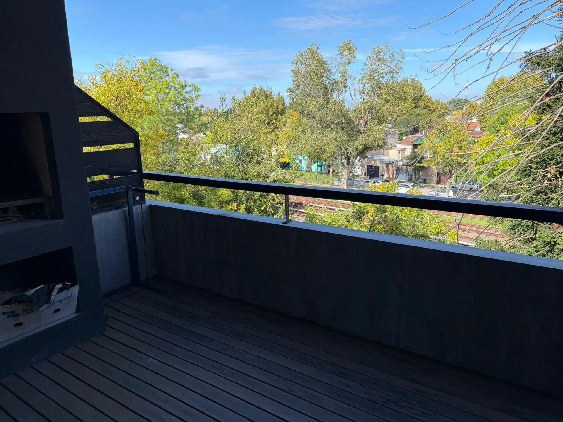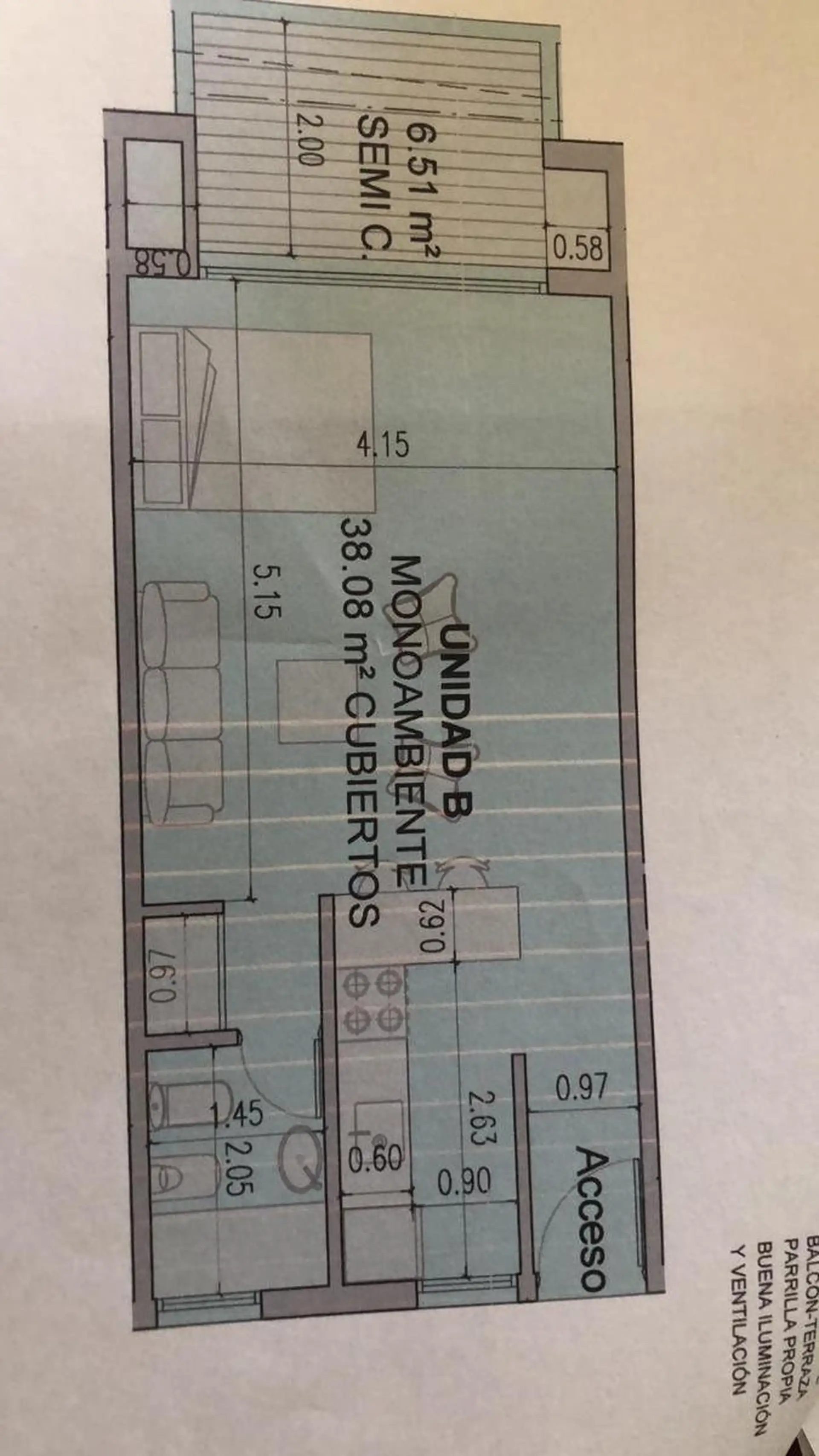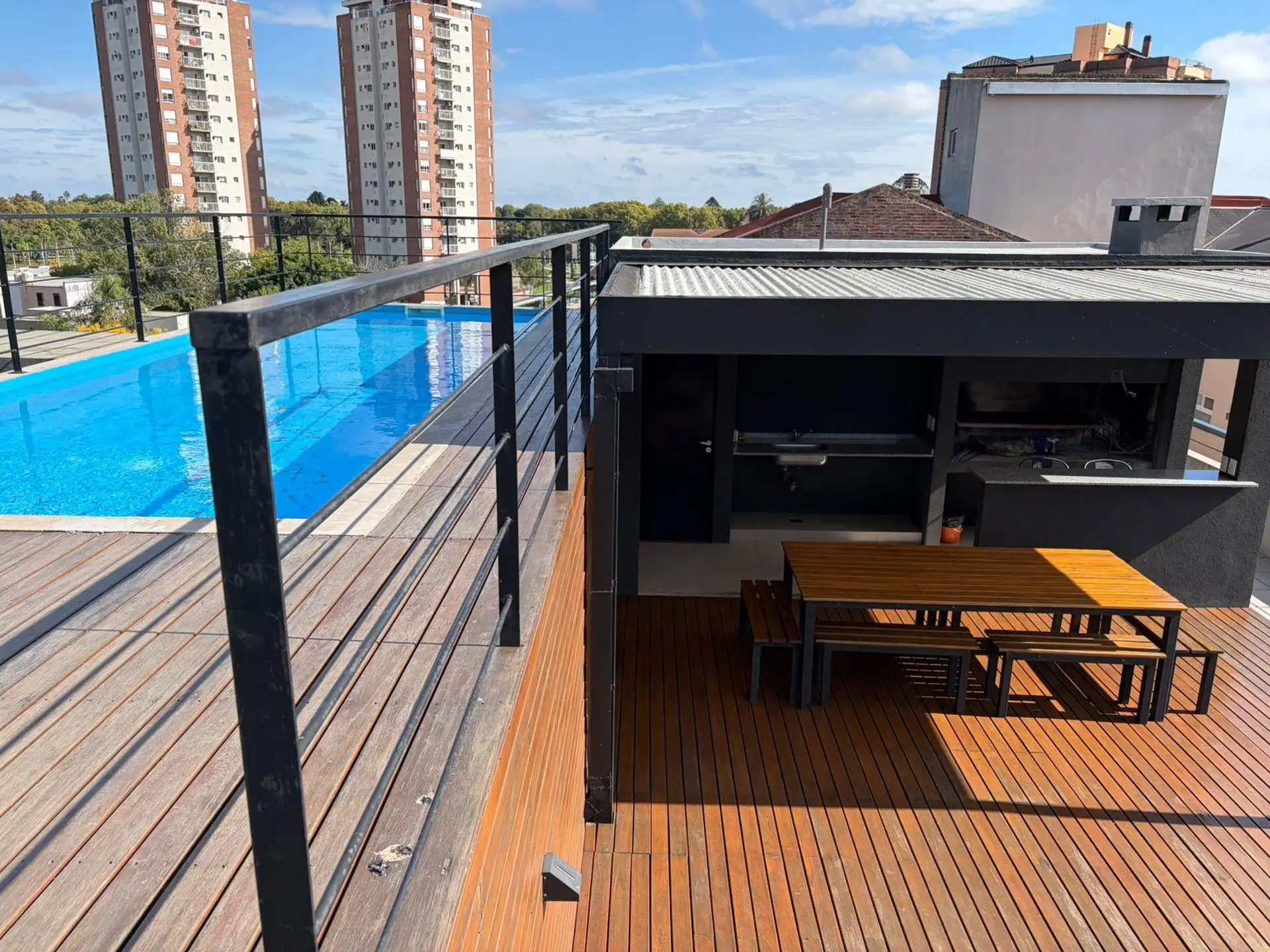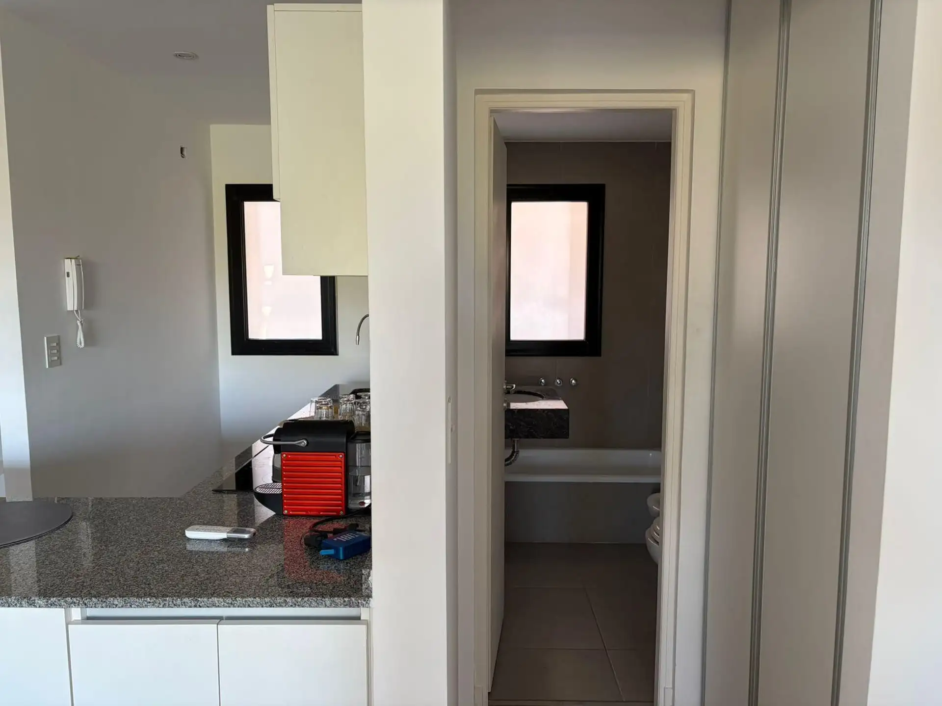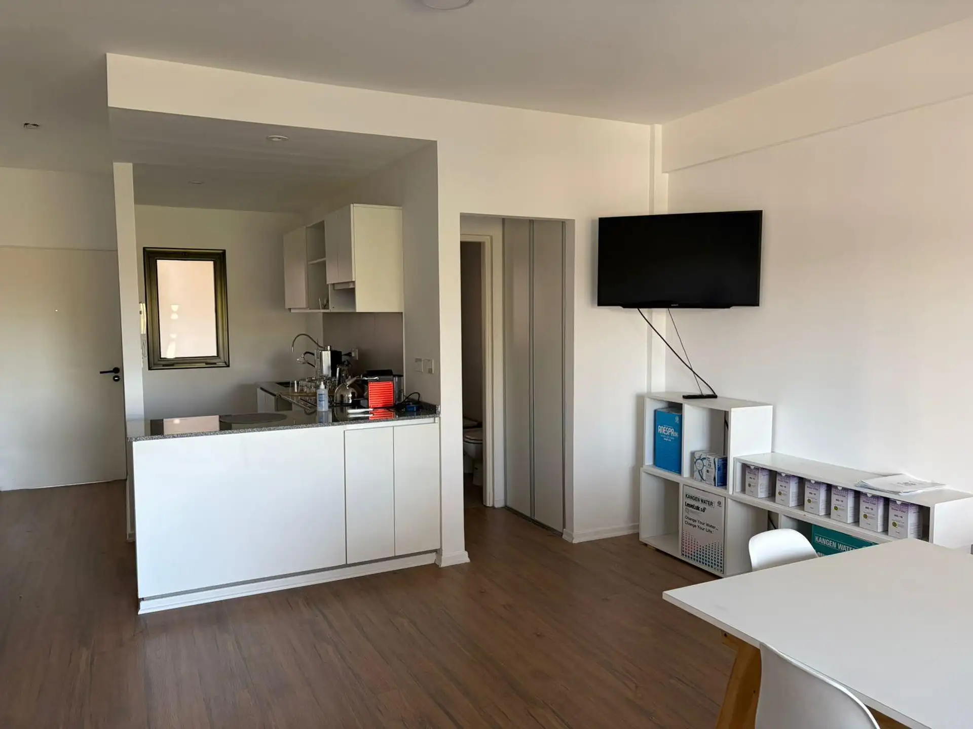 Studio apartment with a balcony and a grill. One full bathroom and a kitchen. The building has a gym and a communal room/co-working space, plus a grill and pool on the top floor. Two-year lease with quarterly rent adjustments based on IPC, and pets are accepted.