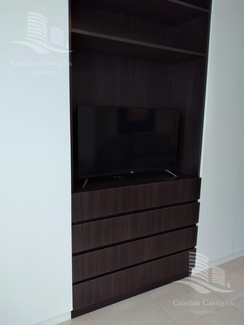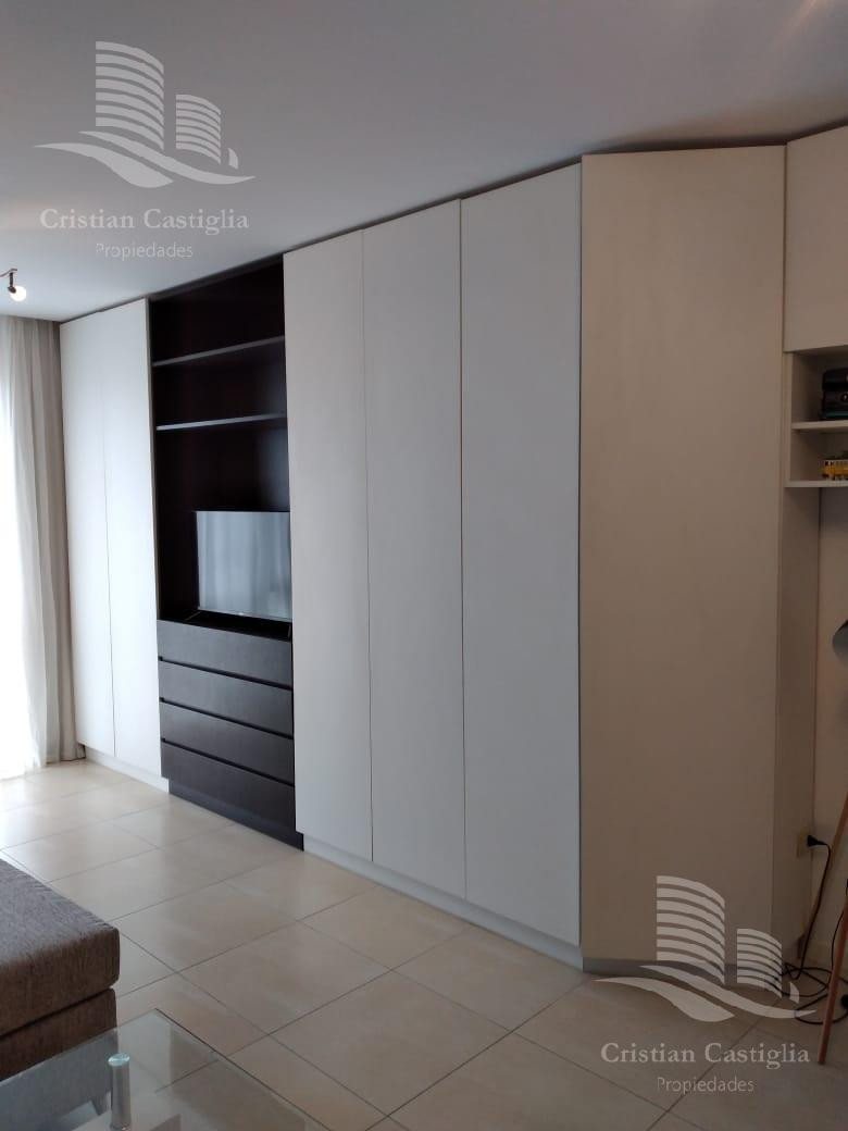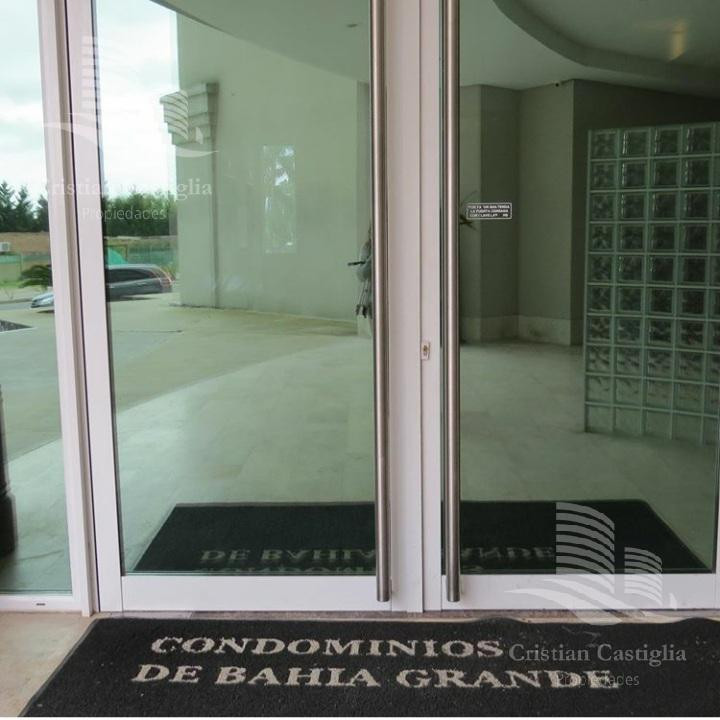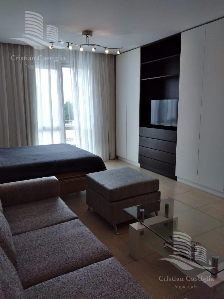Studio apartment in Condominios de la Bahía, Nordelta, in Tigre. The rental includes building fees (expensas). Unit offers one divisible room, an integrated kitchen with built-in cabinetry, a full bathroom, central air conditioning (hot/cold), and large windows with an open view. The building has a fully equipped gym, 24-hour security, and a laundry room. Listed as available for short-term rental subject to the building’s regulations.