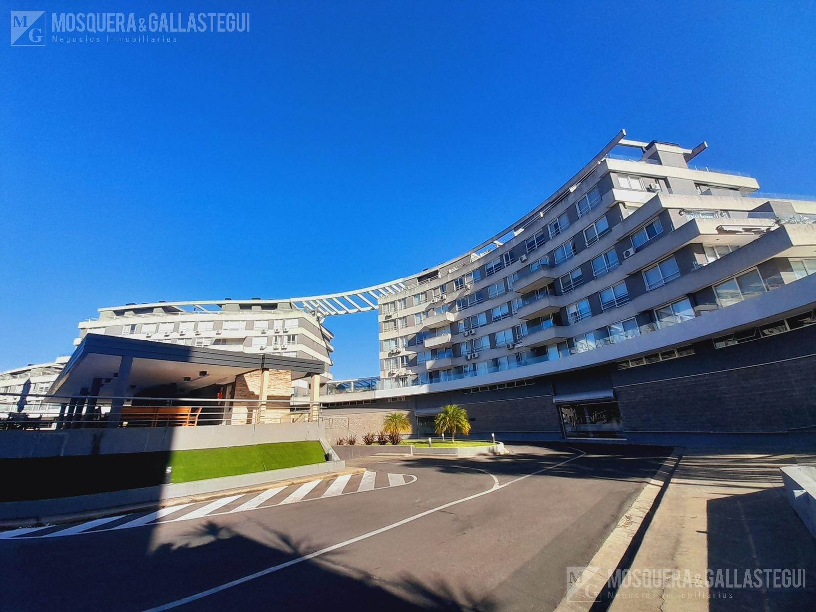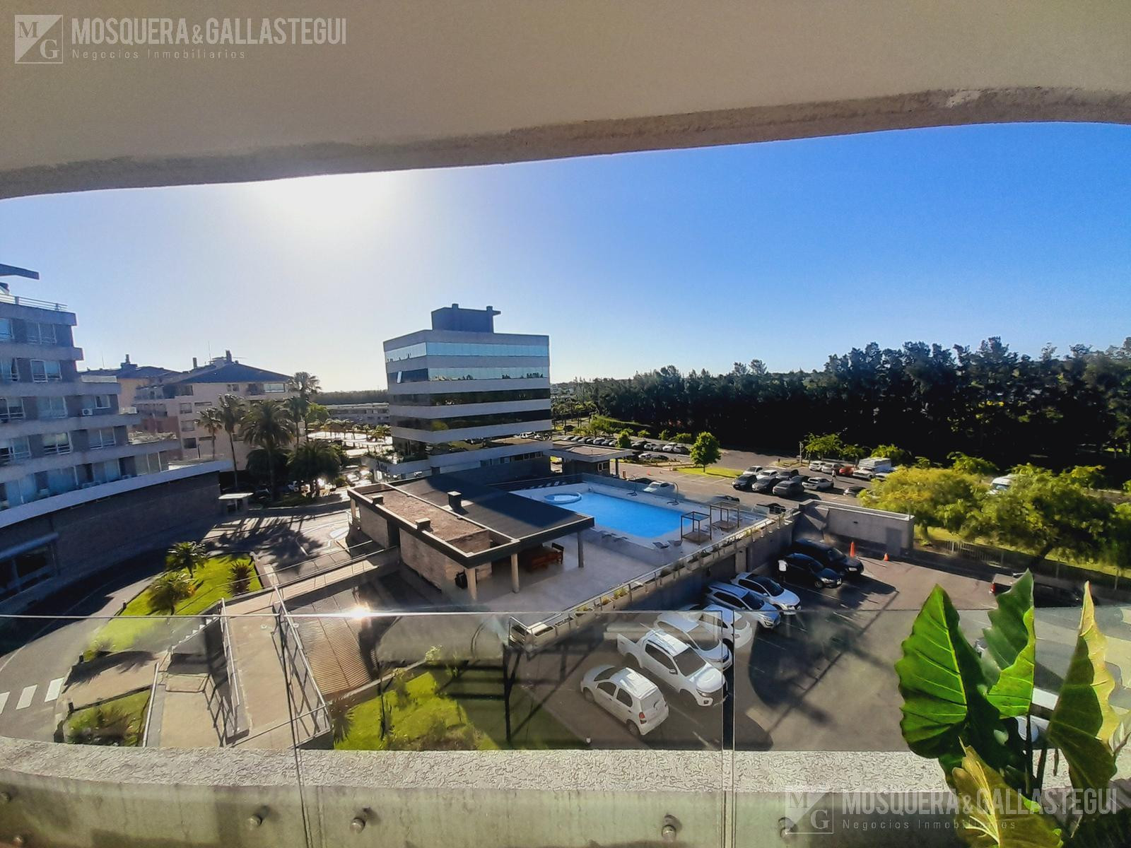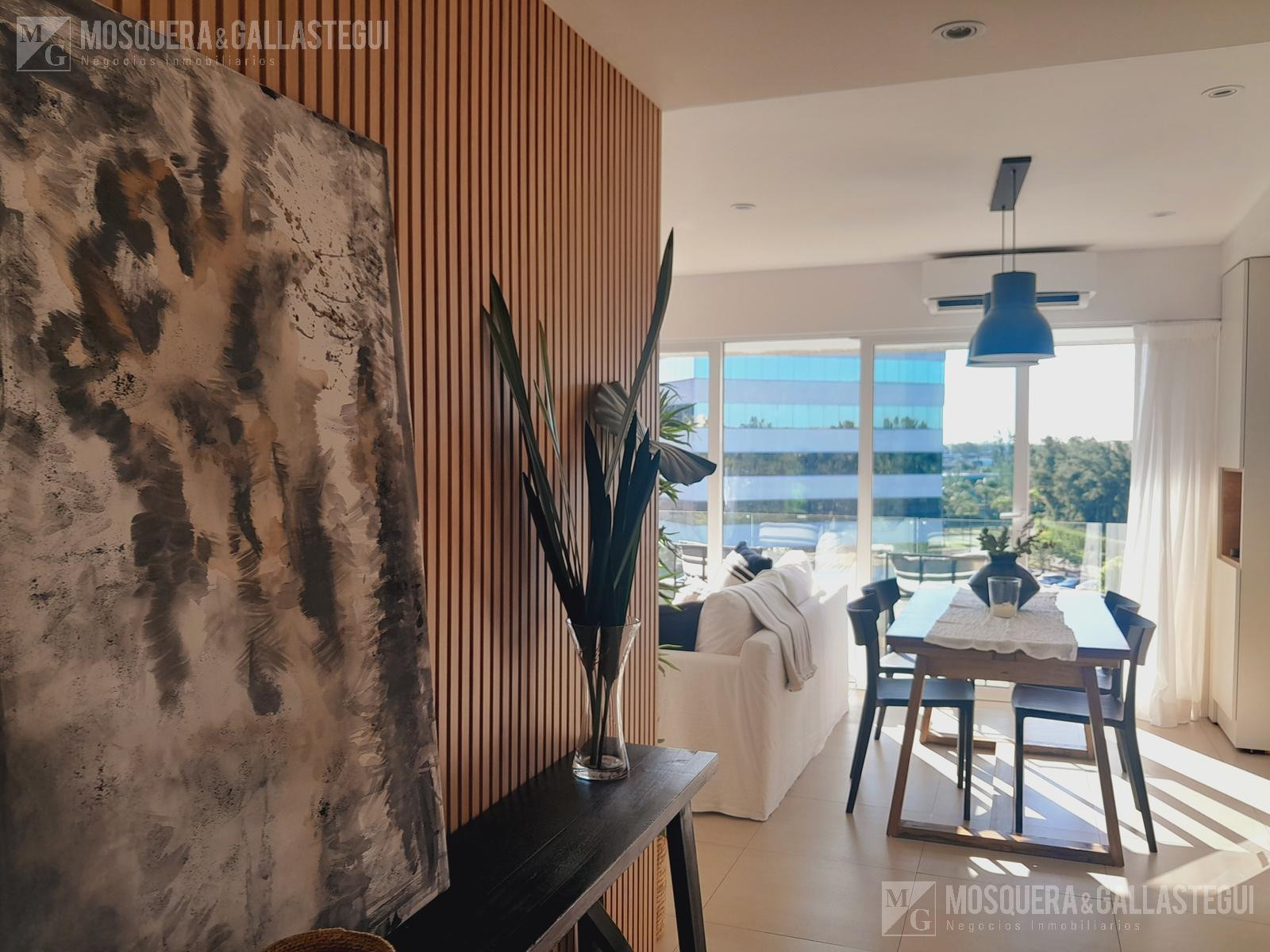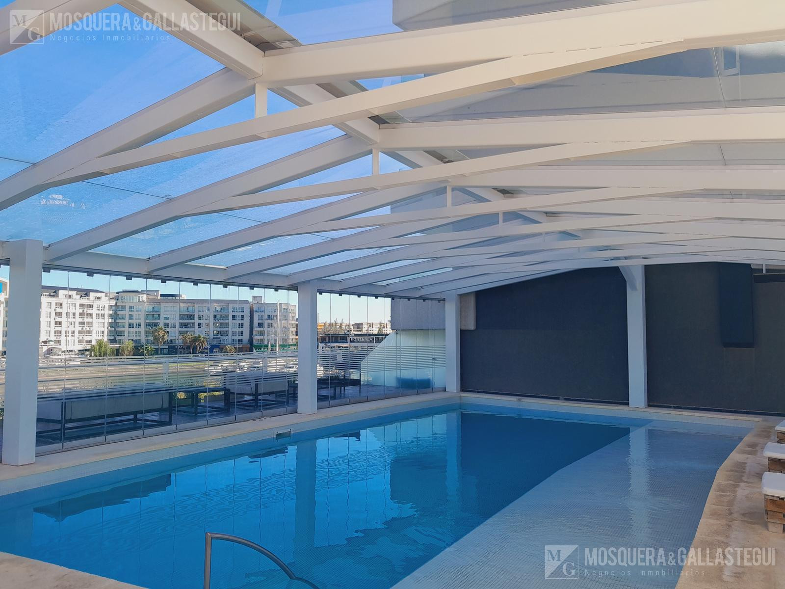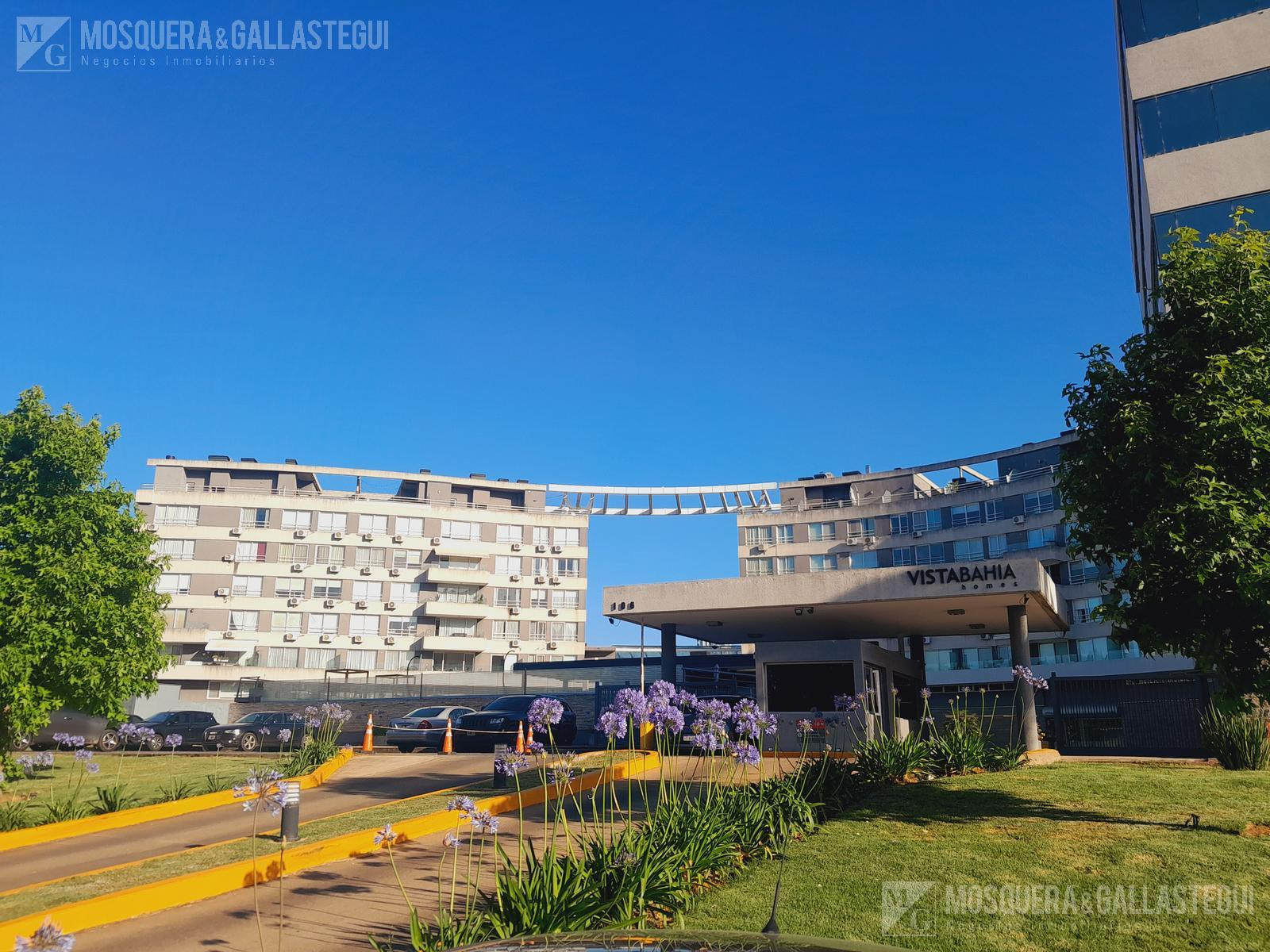 Two-room apartment in Vista Bahía with a hall and open-plan living-dining area with integrated kitchen opening onto a long balcony with open views over the pool area. Includes a guest toilet and an en-suite bedroom with views of the river and the bay, fitted wardrobes with sliding doors, and a bathroom with hydromassage. The apartment has a covered (assigned) parking space. The complex has two pools (one covered and one outdoor), a gym, a quincho with grills, and a laundry area, and offers direc