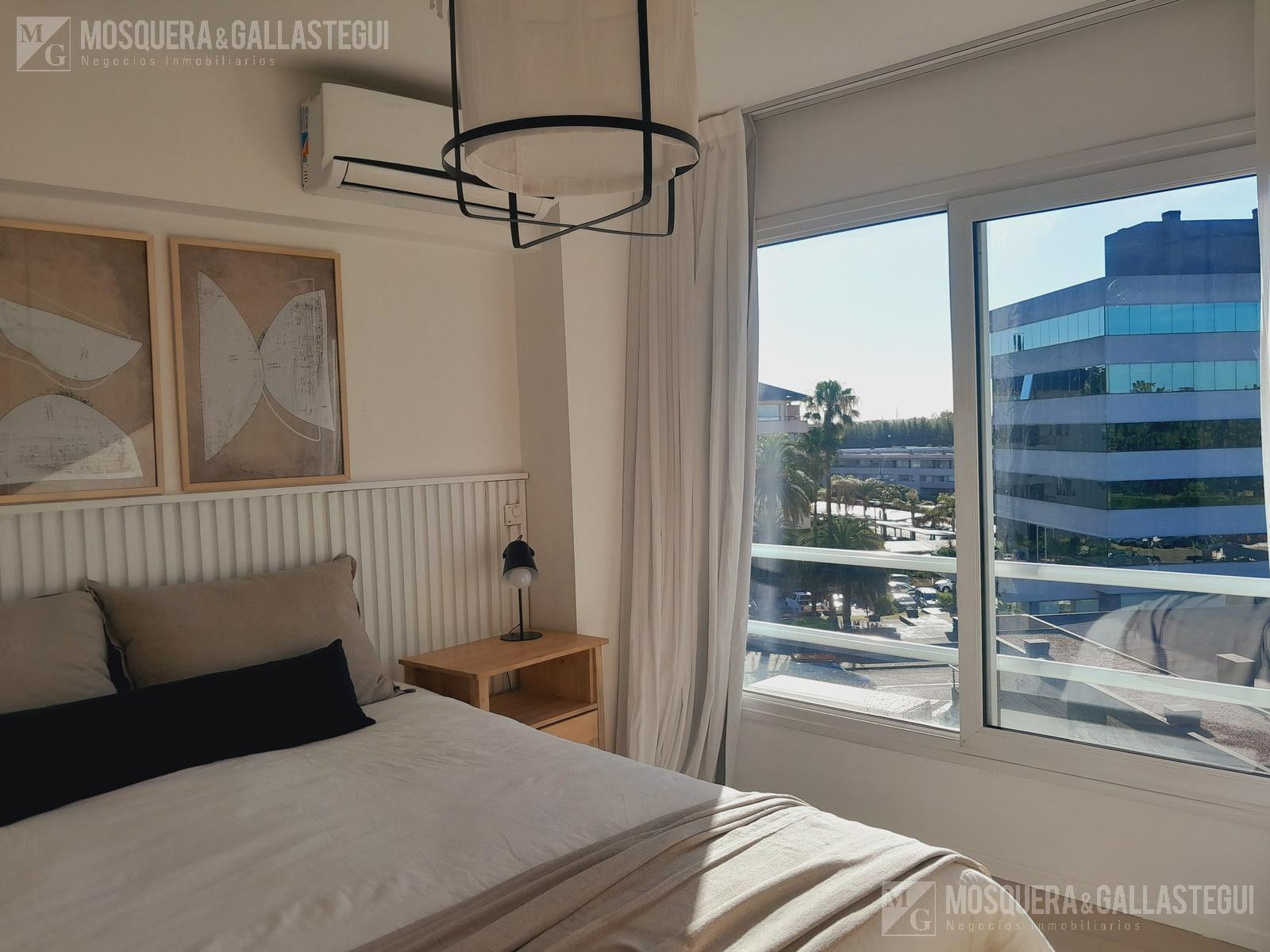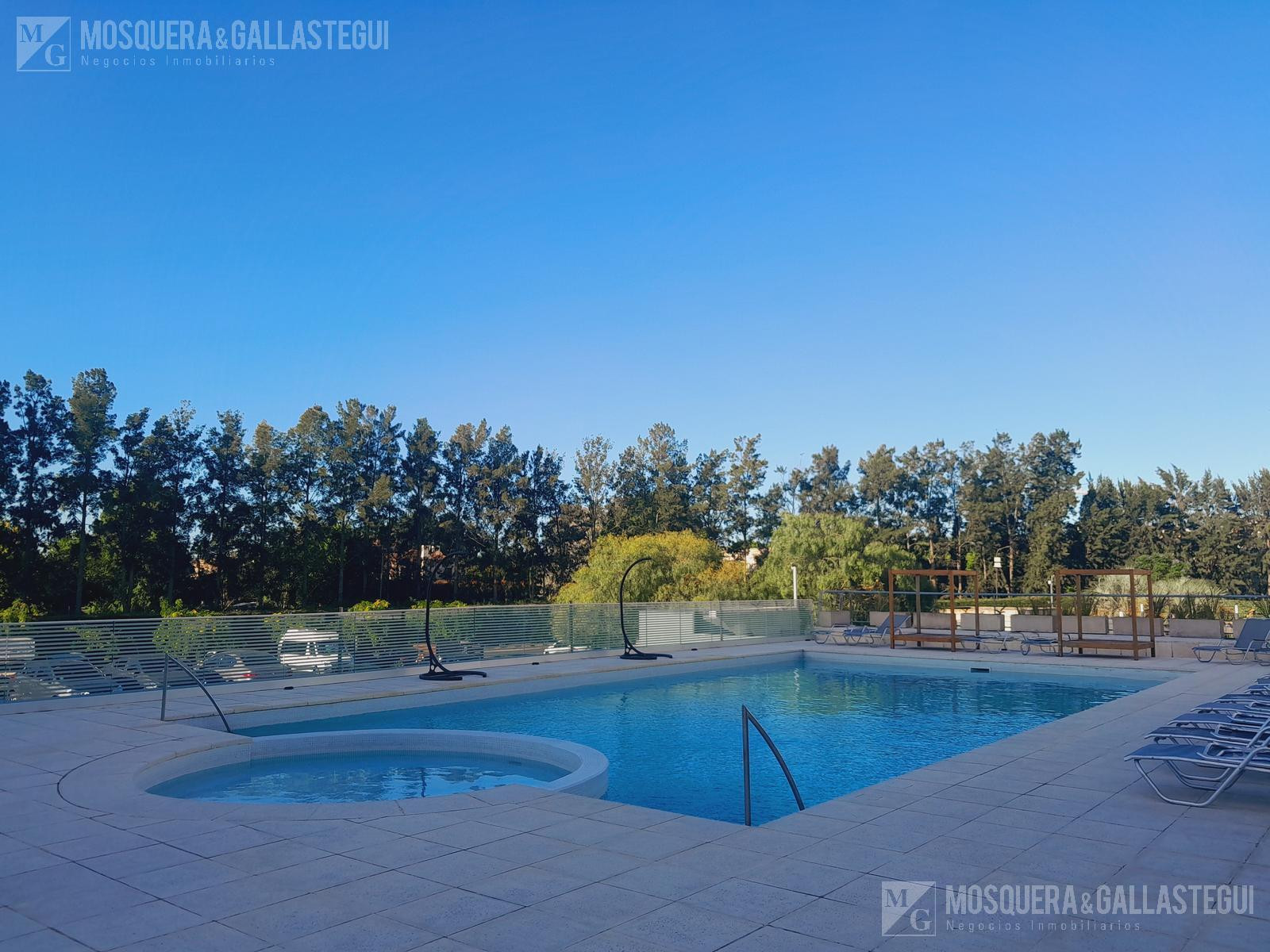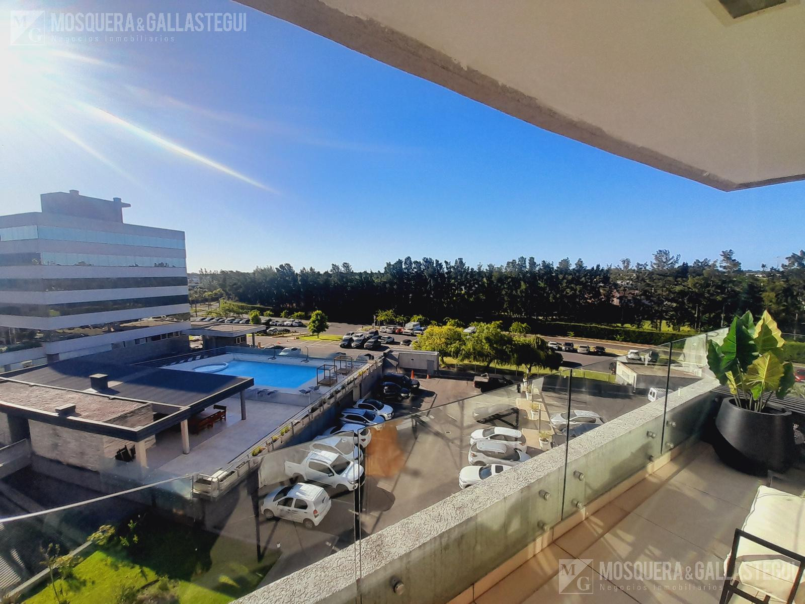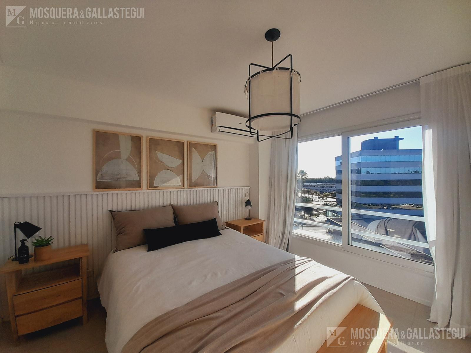 Two-room apartment in Vista Bahía with a hall and open-plan living-dining area with integrated kitchen opening onto a long balcony with open views over the pool area. Includes a guest toilet and an en-suite bedroom with views of the river and the bay, fitted wardrobes with sliding doors, and a bathroom with hydromassage. The apartment has a covered (assigned) parking space. The complex has two pools (one covered and one outdoor), a gym, a quincho with grills, and a laundry area, and offers direc